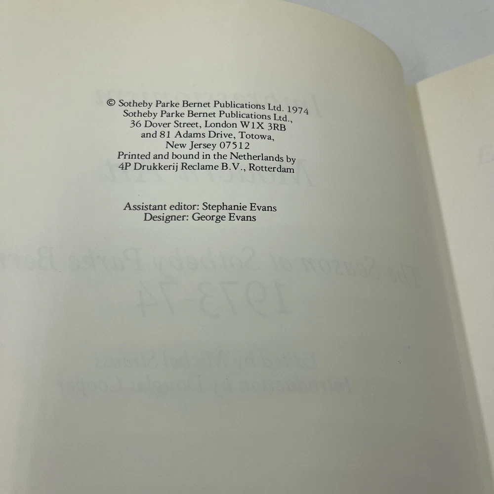Publisher:Sotheby Parke BernetLiterary Movement:ModernismTopic:ArtISBN:0856670081gtin13:0856670081Book Title:Impressionism And Modern Art The Season At Sotheby Parke BernetDefects:Some dust jacket wear.Title:Impressionism And Modern Art The Season At Sotheby Parke BernetPages:262Language:EnglishFormat:HardcoverBook Condition:Very Good in Very Good- dust jacketAuthor:Strauss, MichelPublication Year:1974Cover:Hardcover