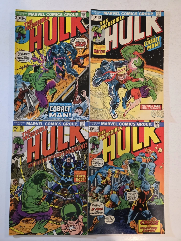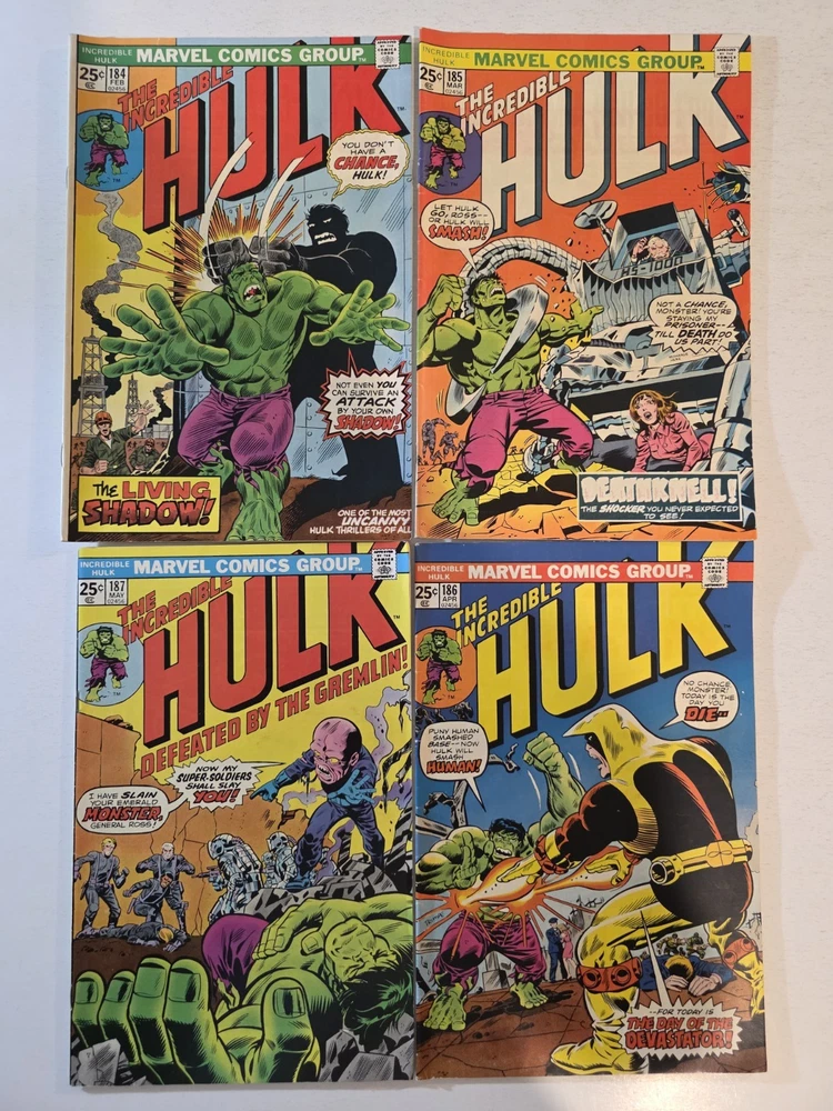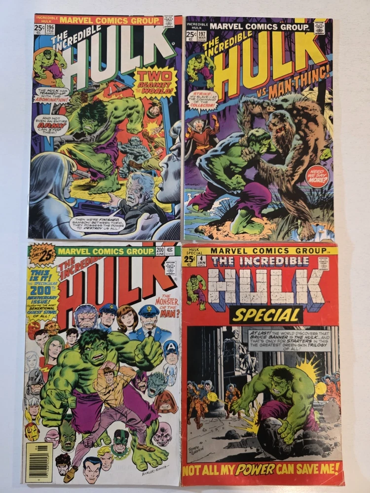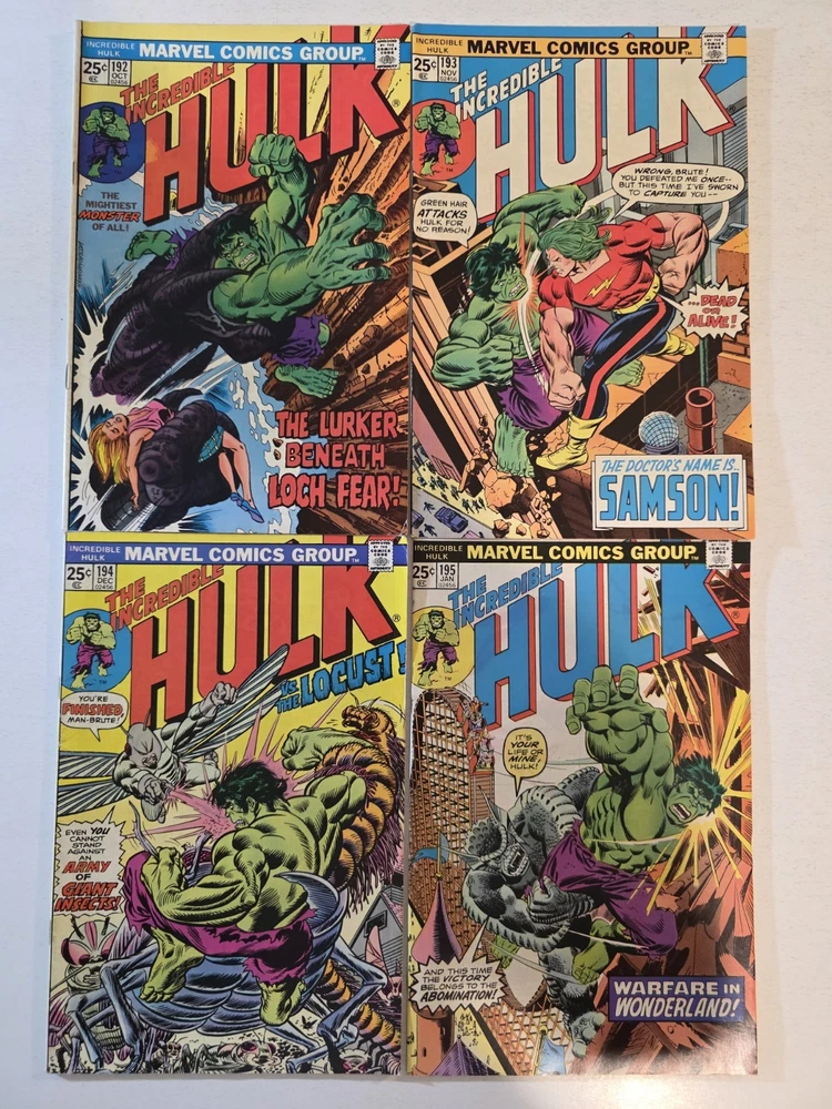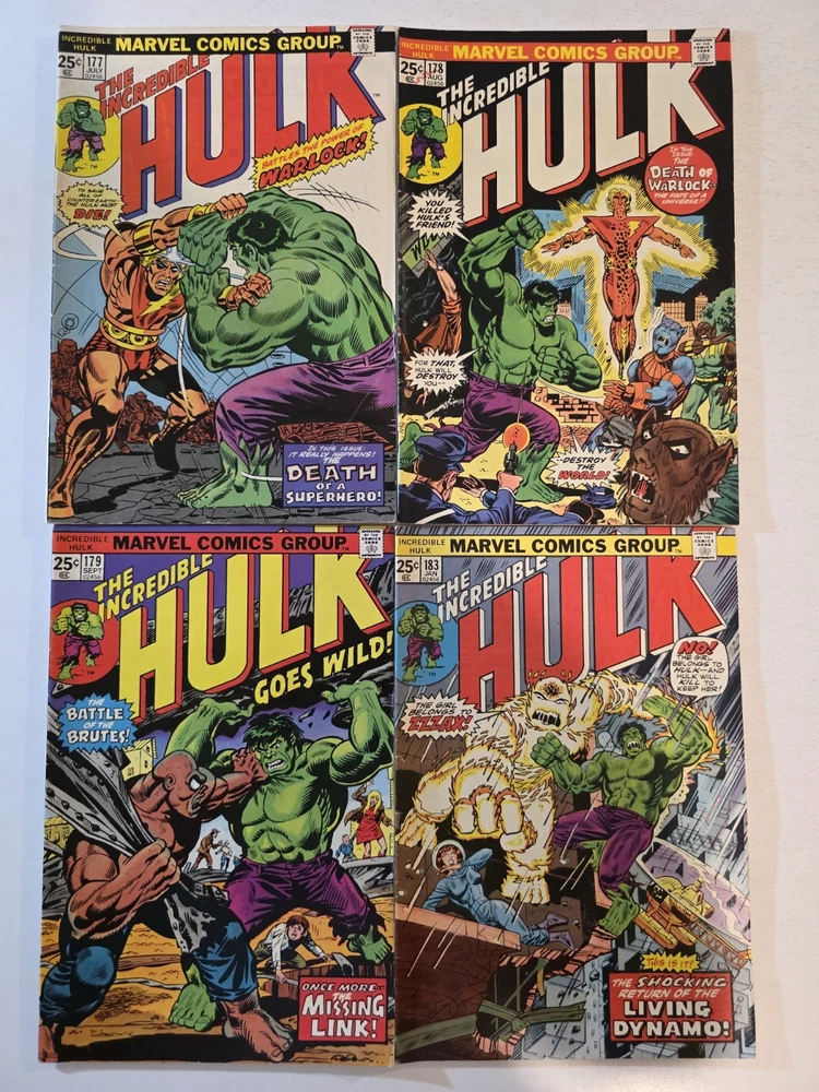 This product is a lot of 45 Incredible Hulk comic books from the Silver Bronze Age, spanning issues #151-200*. The comics feature characters such as Hulk (Bruce Banner), Betty Ross, Dr. Doom, Iron Man (Tony Stark), and more from the Marvel Universe. With artwork by Herb Trimpe, these vintage comics are in Near Mint-, Very Fine to FINE- condition and are published by Marvel Comics in the United States. This lot includes first appearances of characters like Galaxy Master, Barbara Norriss Valkyrie, and Jim Wilson, making it a valuable addition to any comic book collection for fans of action and superhero genre. *Includes #151 VF- #152 VF- #153 VF+ #154 BF/NM #155 VF 1st Appearance of Shaper #156 VF-1st Appearance of Krylar #157 VF #158 VF #159 VF- Abomination Appearance #160 VF Tiger Shark Appearance #161 VF- #163 VF- #164 VF 1st Appearance of Captain Omen #165 FN 1st Appearance of Aquon #166 VF #167 FN+ MODOK Appearance #168 VG/FN #169 FN+ 1st Appearance of Bi-Beast #170 FN/VF #171 FN- Abomination #172 VG+ 2" tear top spine #173 VF #174 VF 1st Cobalt Man MVS Green Goblin #175 VF+ MVS RAWHIDE KID #176 VF- MVS CYCLOPS #177 FN/VF MVS IRONFIST #178 FN+ Death of Warlock #179 VF- MVS SHANG CHI #183 VF Living Dynamo App MVS THING #184 VF+ #185 VF+ #186 VF 1st App Devistator MVS Deathlock #187 VF+ #188 VF+ #189 VF/NM #190 NM- Glorian Appearance #191 NM- #192 NM- #193 VF/NM Doc Samson Appearance #194 VF #195 VF+ Abomination Appearance #196 VF+ #197 VF/NM Man-Thing Appearance #199 VF Annual #4 FN - ALL Complete, some spine wear and ticks, but interiors are stellar and staples intact, see pictures - Bagged and boarded - Shipped with Gemini packing to insure no damage during shipping - UPS ground Check out our 1000s of comics in our store We combine shipping