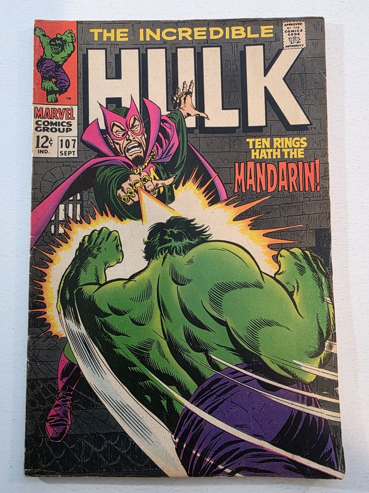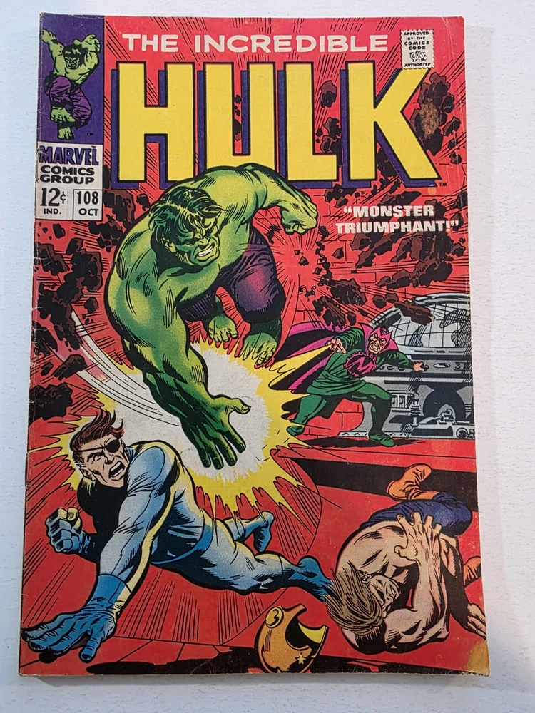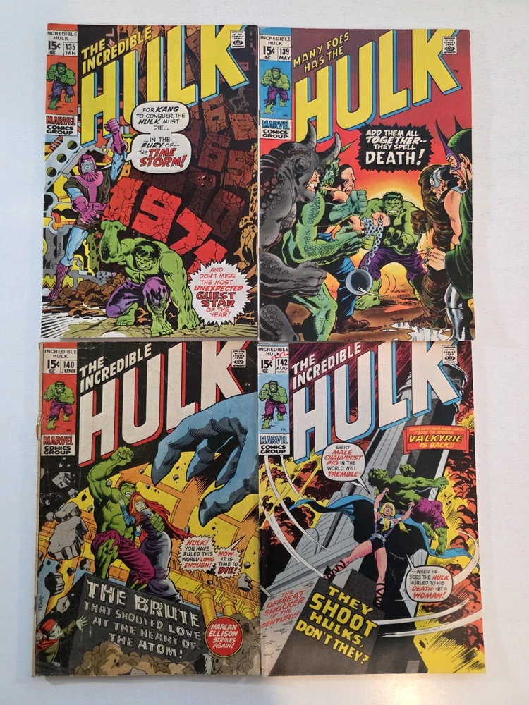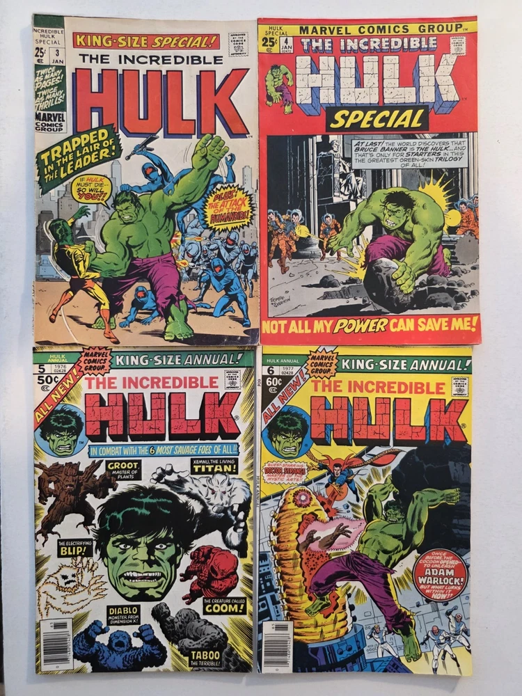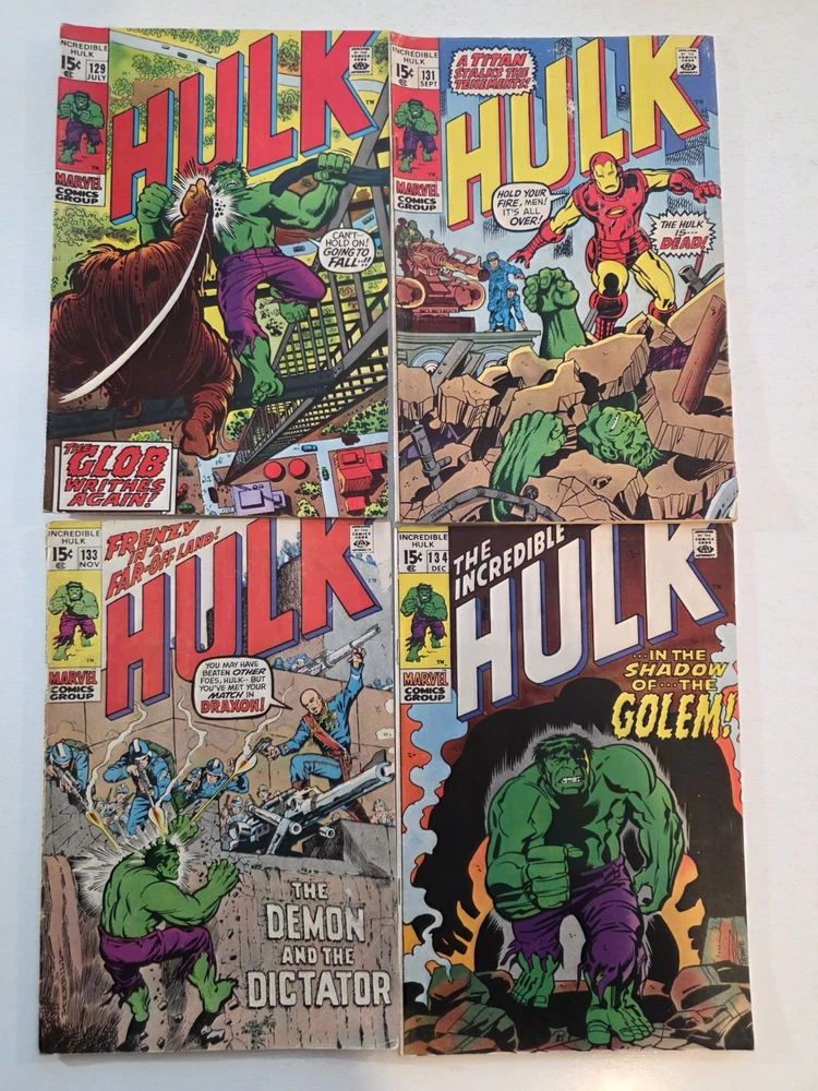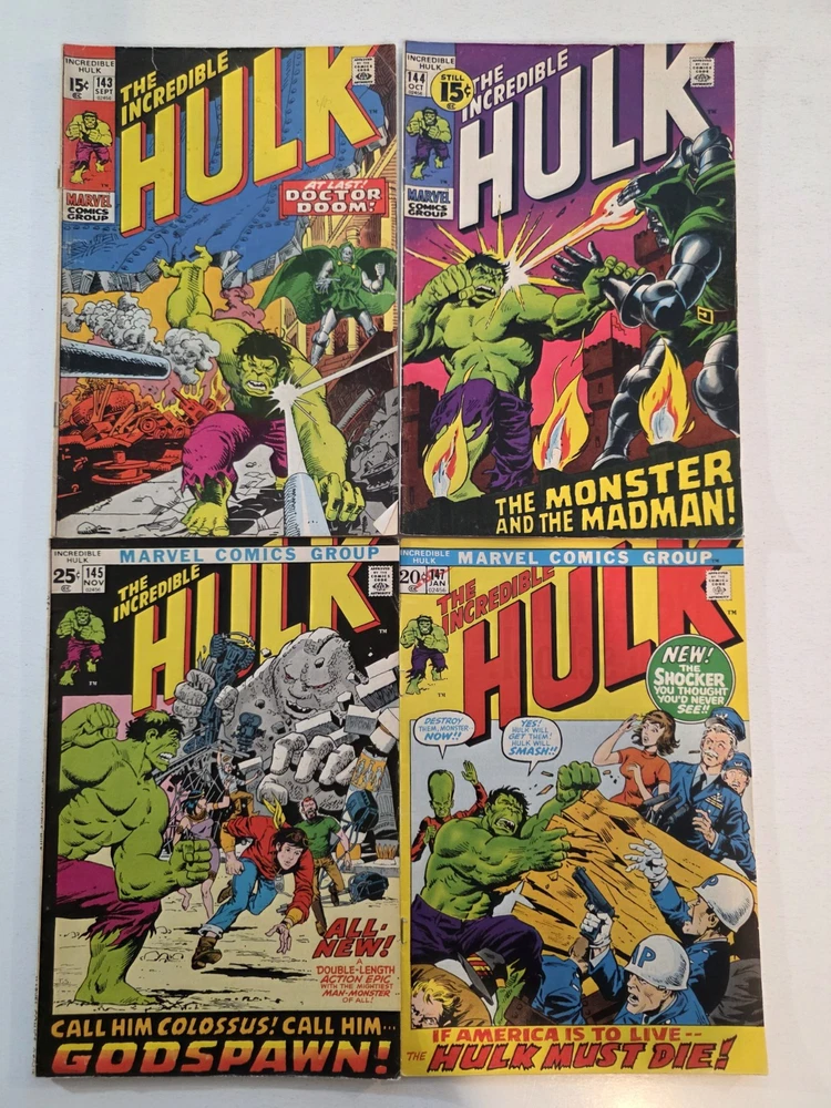 This product is a lot of 40 Incredible Hulk comic books from the Silver Bronze Age, spanning issues #104-151*. The comics feature characters such as Hulk (Bruce Banner), Betty Ross, Dr. Doom, Iron Man (Tony Stark), and more from the Marvel Universe. With artwork by Herb Trimpe, these vintage comics are in Fine to Very Fine+ condition and are published by Marvel Comics in the United States. This lot includes first appearances of characters like Galaxy Master, Barbara Norriss Valkyrie, and Jim Wilson, making it a valuable addition to any comic book collection for fans of action and superhero genre. *Includes #104 FN+ RHINO APPEARANCE #105 FN+ #106 FN+ MISSING LINK APPEARANCE #107 FN/VF MANDARIN APPEARANCE #108 FN #109 VF+ KAZAR APPEARANCE #110 VF- UMBU APPEARANCE #111 VF 1ST APP GALAXY MASTER #112 VF GALAXY MASTER APPEARANCE #114 FN/VF #119 VF- MAXIMUS THE MAD APP #121 VG GLOB APP #123 FN- THE LEADER APPEARANCE #124 VF- RHINO APPEARANCE #125 VF- ABSORBING MAN APPEARANCE #126 FN BARBARA NORRISS VALKYRIE APP #127 FN- MOGUL APPEARANCE #128 G/VG detached cover #129 VF THE GLOB APPEARANCE #131 FN- IRON MAN COVER #132 VG/FN #133 VG+ 1st APPEARANCE OF DRACON #134 VF+ GOLEM APPEARANCE #135 VF KANG APPEARANCE #139 FN/VF LEADER APPEARANCE #140 VG-top staple detached #142 VF VALKYRIE APPEARANCE #143 VG+ top staple detached #144 VF-DR. DOOM APPEARANCE #145 FN 1st Appearance of GODSPAWN #147 VG/FN top staple detached #151 FN- small tear bottom left corner Annuals #3 VG, 4 VF, 5FN/VF, 6 FN/VF - Complete, some spine wear and ticks, but interiors are stellar and staples intact, see pictures - Bagged and boarded - Shipped with Gemini packing to insure no damage during shipping - Usps Priority insured Check out our 1000s of comics in our store We combine shipping