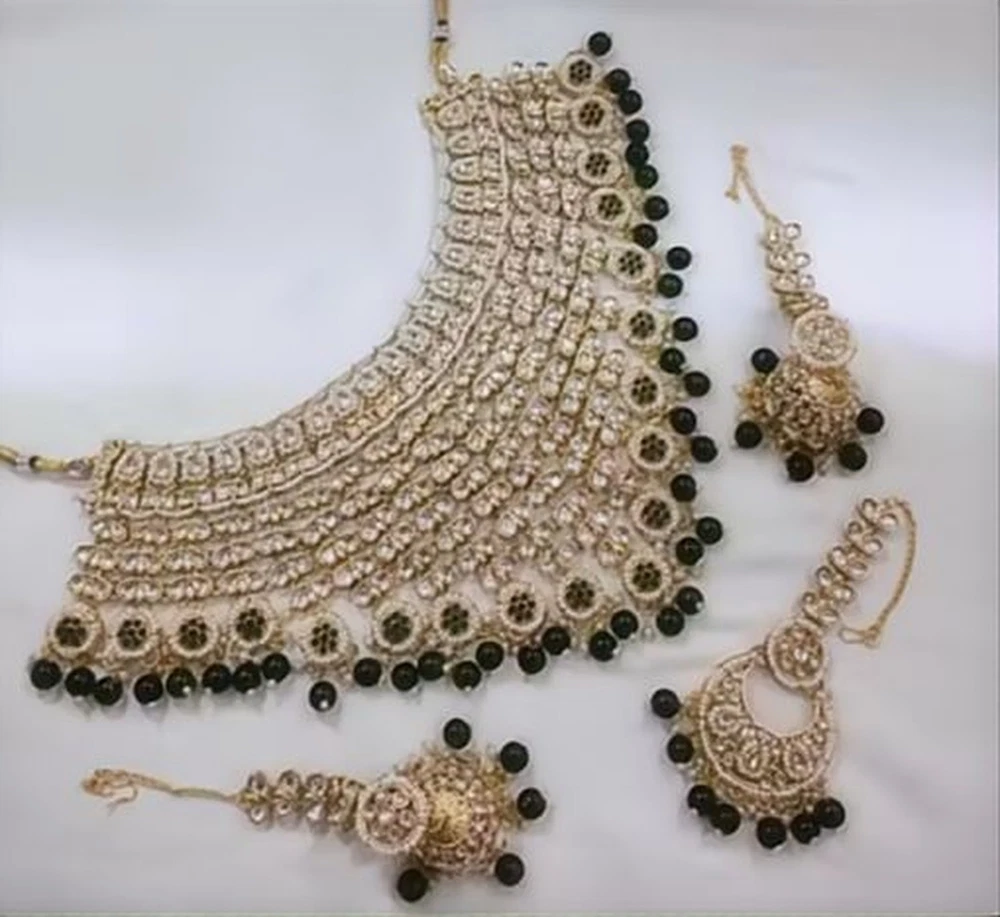 Rates are Inclusive of Shipping, And All Delivery Duties Paid. Handcrafted Gold-Plated Kundan Bridal Jewelry Set – Heavy Choker Necklace with Green Bead Drops, Jhumka Earrings & Maang Tikka | Traditional Ethnic Wedding/Party Wear | Indian Jewelry Product Description Step into celebration-ready glamour with this handcrafted gold-plated Kundan jewelry set featuring a regal, wide choker necklace, matching jhumka earrings, and a coordinating maang tikka. Multiple rows of premium Kundan-style stones create a jeweled cascade, finished with deep green bead drops for a luxurious bridal look that shines at every angle. Key Features Product type: Women’s 3-piece set – heavy choker necklace, jhumka earrings, maang tikka. Design: Layered Kundan setting with intricate filigree, scalloped edge, and rich green bead hangings for movement and color contrast. Materials: High-micron gold plating on skin-friendly alloy; hand-set Kundan-style stones; color-fast beads; smooth anti-tarnish finish; secure earring backs; adjustable dori for a custom fit. Look & feel: Premium, photo-ready sparkle with comfortable wear for long events. Styling: Complements bridal lehengas, sarees, anarkalis, shararas, and Indo‑western gowns; pairs beautifully with bangles and a nath for a complete bridal ensemble. Occasions: Perfect for weddings, receptions, sangeet, mehendi, festive functions (Diwali, Navratri, Eid), parties, and special photoshoots. Gifting: A memorable “gift for her” for brides, bridesmaids, anniversaries, and milestone celebrations. Why You’ll Love It Royal aesthetic: The broad choker silhouette frames the neckline for an instant Maharani vibe. Versatile elegance: Classic gold-plated finish and green accents flatter all skin tones and outfit palettes. All-in-one set: Necklace, earrings, and tikka deliver a ready-to-wear bridal/party look in seconds. Style Tip Let the choker take center stage—pair with a deep neckline or off-shoulder blouse and sleek hair. Add a stack of gold bangles and a statement ring to complete the look. Own the spotlight—add this traditional, handcrafted gold-plated Kundan set to the cart now and dazzle at the next wedding, party, or festival
