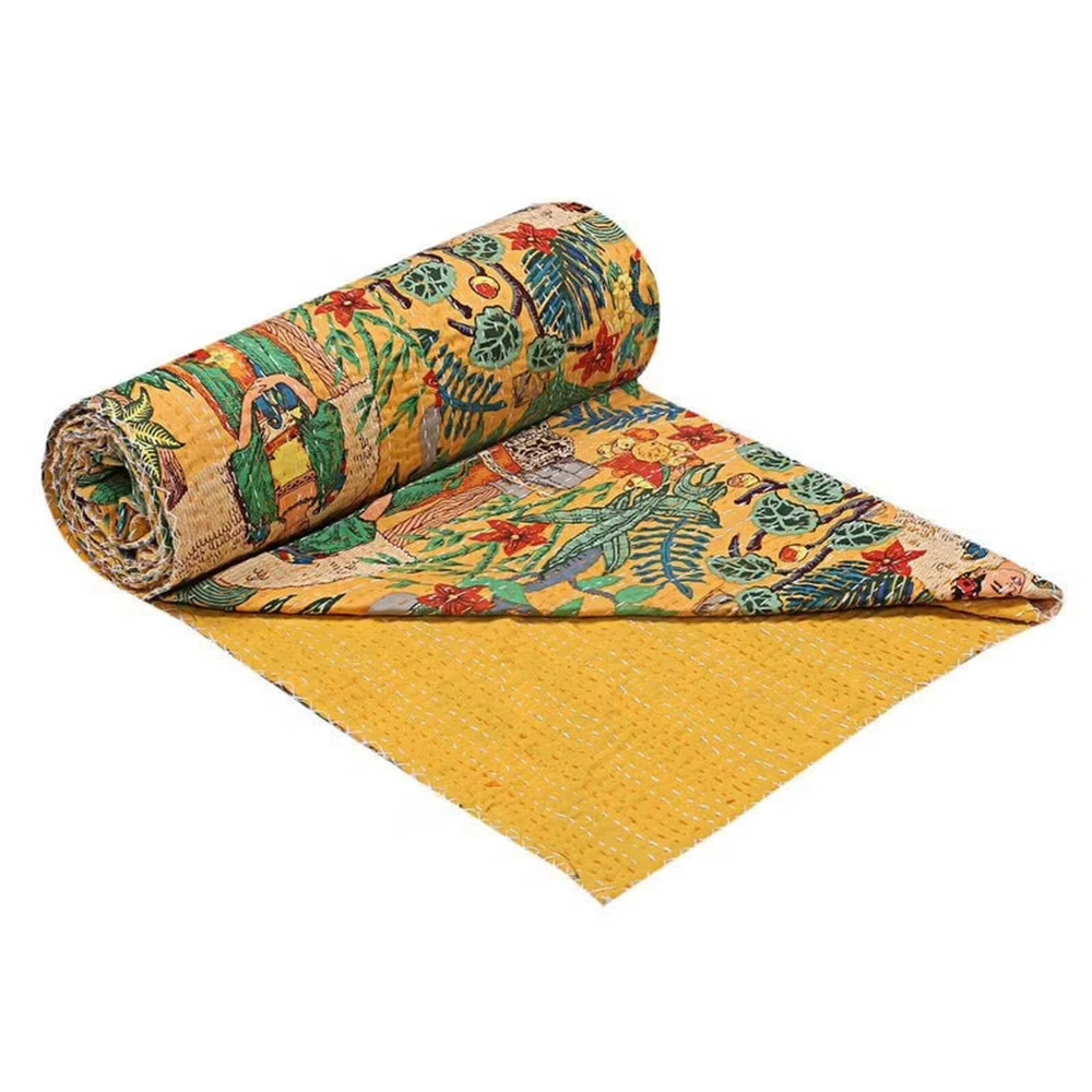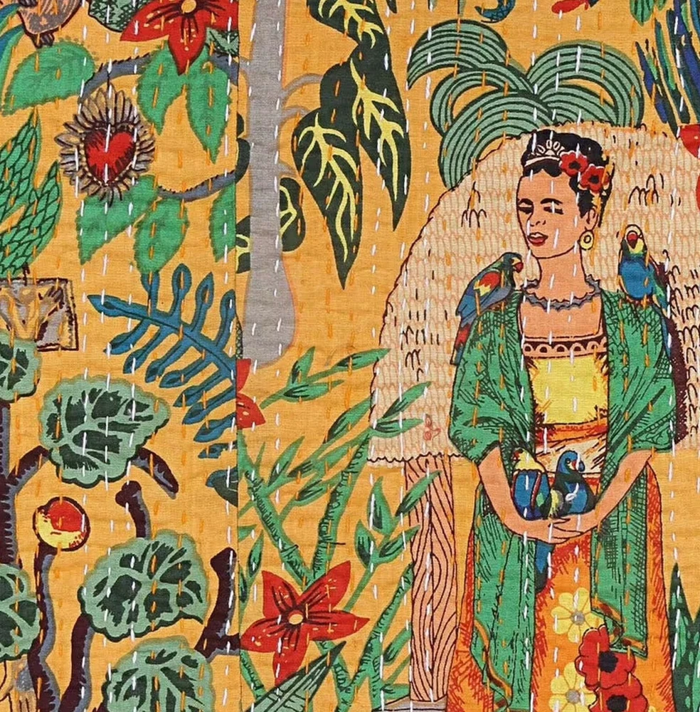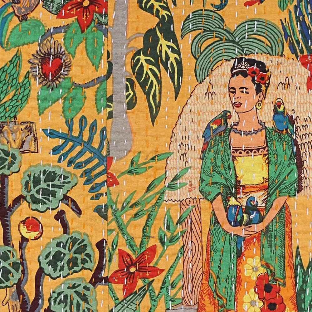 Add a touch of luxury to your bedroom with this beautiful Indian handmade vintage Kantha quilt. The quilt is made of 100% cotton and features a stunning Frida pattern in yellow. It is perfect for all seasons and comes in a queen size rectangular shape. The quilt is machine washable and quilted for extra comfort. It is also personalized and makes a great gift for teens, adults, unisex baby & toddler, and kids. The coverlet is designed with an eye-catching style and theme of luxury. This Indian-made coverlet will be a great addition to your bedding collection. This vintage Kantha quilt is a perfect addition to your home decor. It is machine washable and easy to maintain. The quilt is suitable for teens, adults, unisex baby & toddler, and kids. This bedspread is a great way to add a cozy and comfortable touch to your bedroom. Blanket Indian Twin Handmade Bedspread Kantha Work Bohemian Bed Decor Throw Blanket 60X90 inch => Frida Kantha Quilt => Material: 100% Cotton => Size:- Twin 60 x 90" Approx. => Size:- Queen 90 x 108" Approx. Note:-As this is Applique Hand Floral Kantha, There will be variation in patches Every Piece Comes Different Base Color will Be same. You Will Received Little Bit Differ As Shown In Picture. Note - loose threads to be expected. Note - The entire Two Layer of Silk and Cotton quilt is hand embroidered with end number of straight stitches to create a unique product, one of a kind, that it’s a perfect GIFT too. , All these make them a Patchwork Quilt. Note - There is no batting inside the two layers. Cotton fabric King Size Kantha Stitch Quilt , Blanket / Bedspread. , * Frida pattern on the front side. * Backing with solid pattern. * Colored threads are used to develop the Kantha pattern. NOTE: Once You Bought Item From Our Store You Will 100%Satisfied. And You Will Get As We Describe !