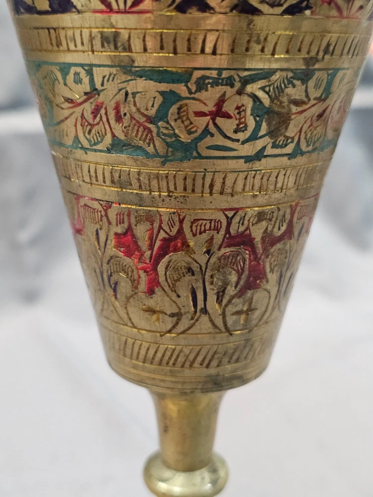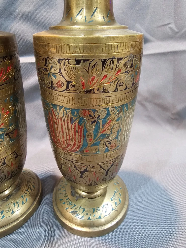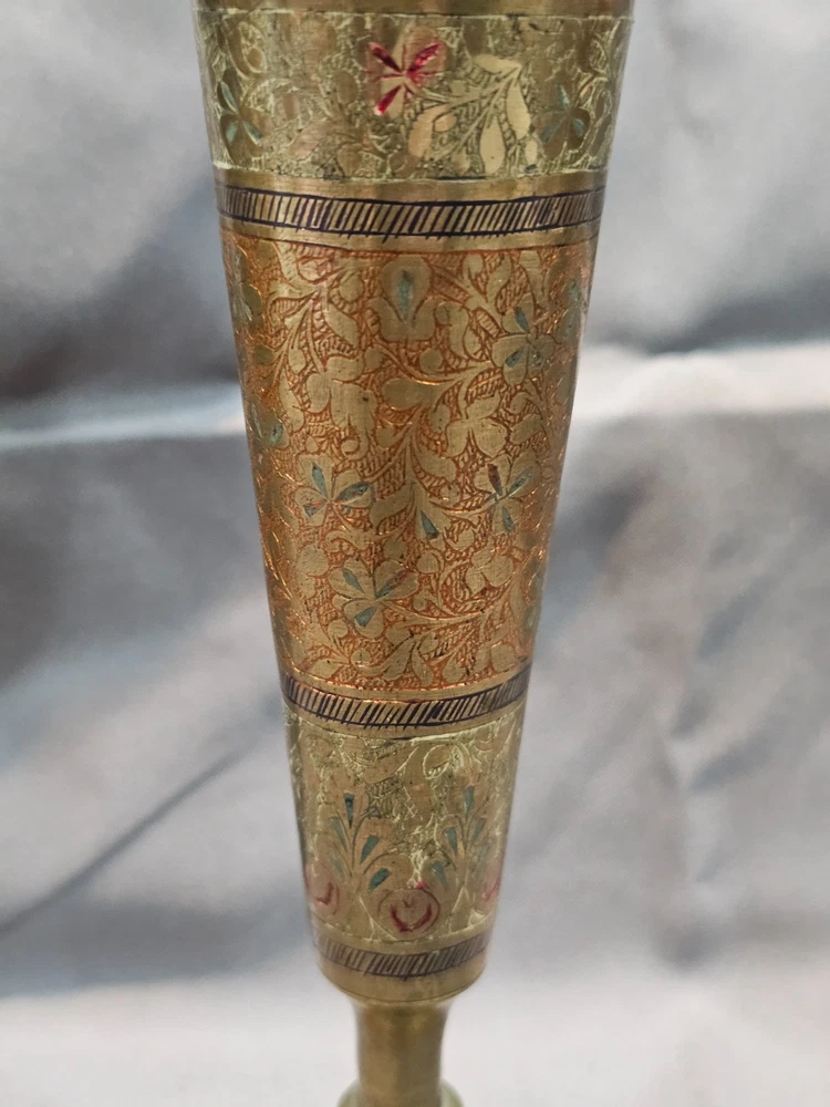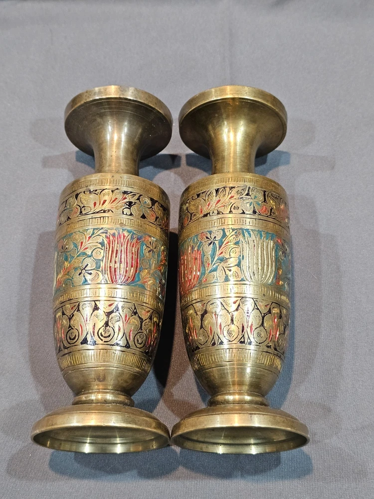 *Sizes are approximate Tall Vase: 12" x 4" Two Smaller: 7.5" x 2.5" Medium Vase: 9" x 3.5" Condition: Please keep in mind these authentic vintage brass items from India and/or China are pre-owned and display various signs of age and use. Each piece may have dents, scratches, discoloration, blemishes, or other imperfections that add to its character and patina. All items are sold in as-found condition; please review photos and descriptions carefully. If you have questions about a specific item’s condition, feel free to ask before purchasing. Please Read Before Buying: · All items are described and photographed to the best of my ability, including any known flaws, defects, or wear. Please review all photos and description details carefully before purchasing, as they represent the exact condition of the item. · Photos are considered part of the description — please zoom in to review them carefully before purchasing. · Item measurements, sizing, or fit are the buyer’s responsibility to confirm before purchase. · Color may vary slightly due to lighting, camera, or screen differences. · This item is sold as described in the listing. Returns are only accepted if the item significantly differs from the description, per eBay’s Money Back Guarantee policy. · The listing price reflects the condition, and all known defects are disclosed. · I cannot guarantee the item’s performance or longevity after purchase, as usage and care are beyond my control. · Only the items shown in the photos are included—no additional accessories, manuals, or boxes unless explicitly stated. · If you have any questions about the item’s condition, size, or features, please ask before placing your order. · As per eBay policy, buyers may still open cases under eBay’s Money Back Guarantee if the item significantly differs from the description. Buyer Advisory for Vintage Items and Antiques: · Please note that the information provided in this listing may be incomplete or inaccurate. It is recommended that you use the details as a starting point to form your own judgment. I appreciate any additional information that could enhance or clarify the history of the objects. · Given the uncertainty surrounding this piece, we advise potential buyers to proceed with caution. The purchase decision rests entirely with you, and you assume any associated risks. · We encourage interested parties to conduct their own research or seek expert opinion before making a purchase decision.