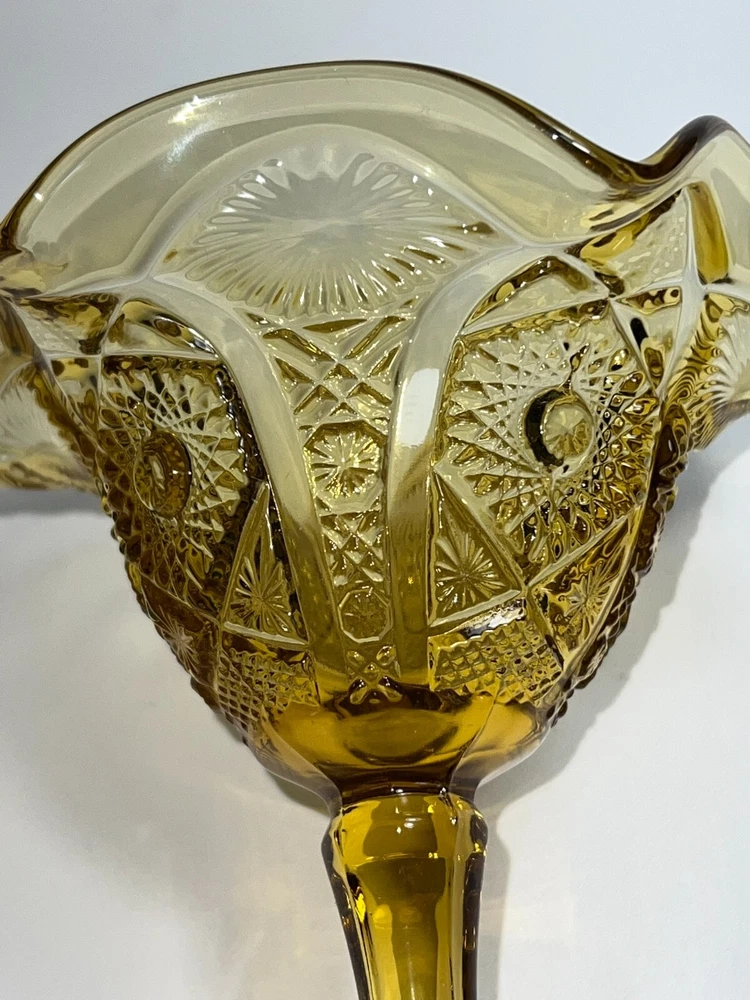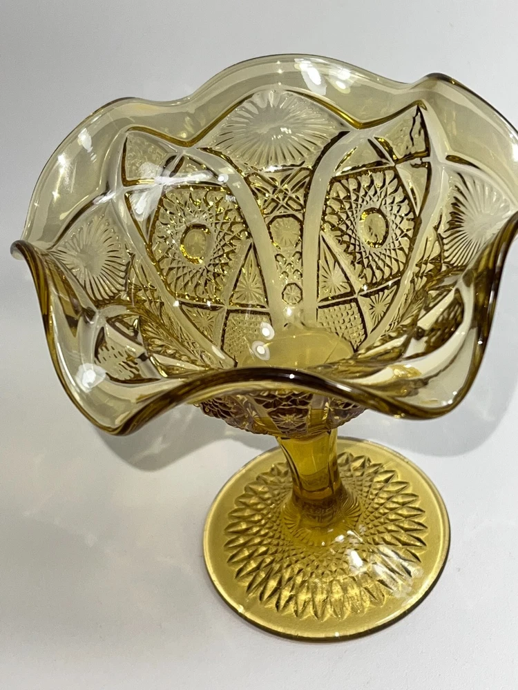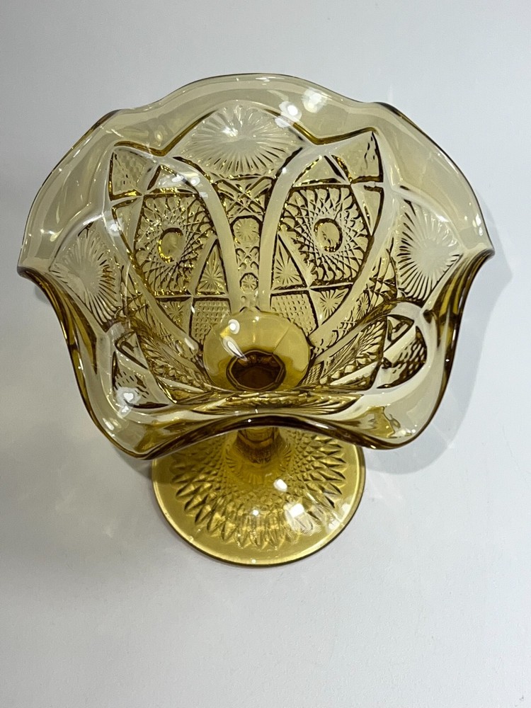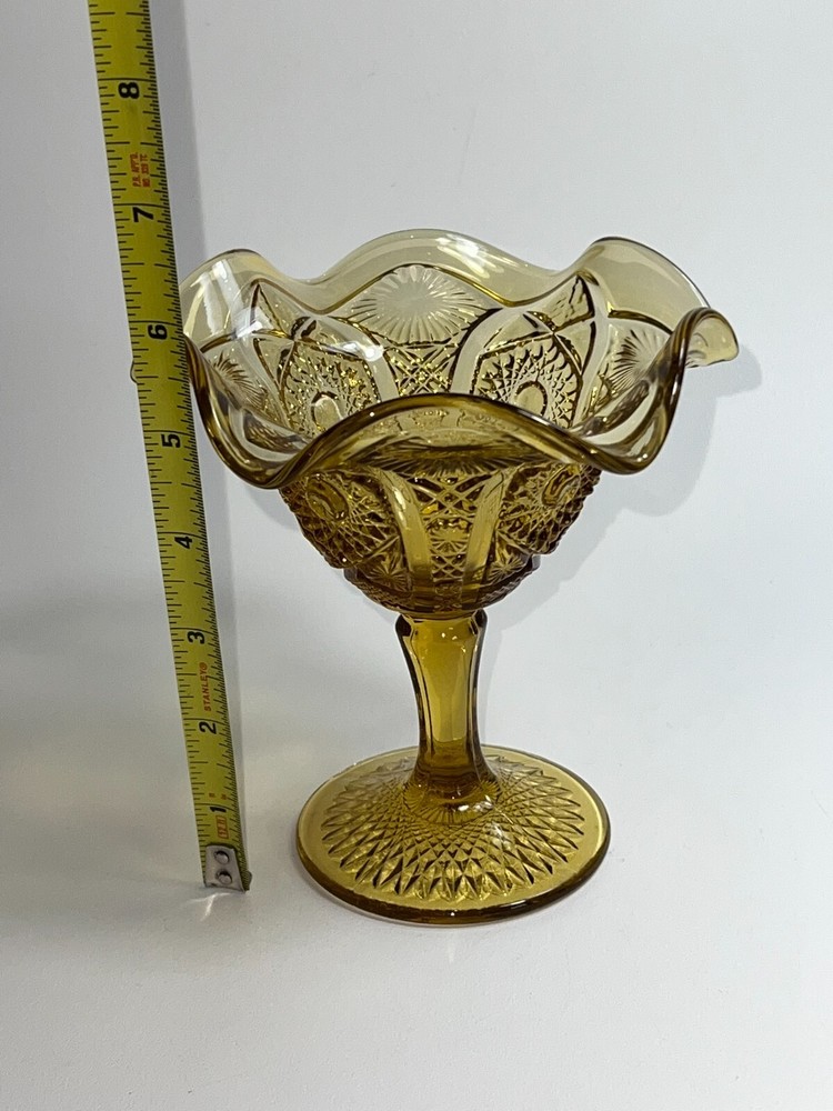 Indiana Amber Depression Glass Goblet Dessert Dish Compote Heavyweight Glass Gold ★ Material: Glass. ★ Approximate Size: 5.5" tall X 5.5" wide. ★ Brand/Maker: Indiana Glass. ★ Color: Amber/Gold. EXCELLENT VINTAGE CONDITION NO CHIPS, CRACKS, SCRATCHES, or CRAZING Photos part of the description