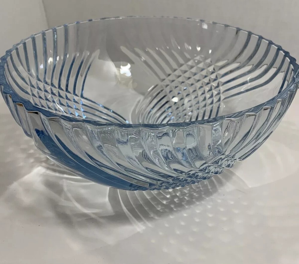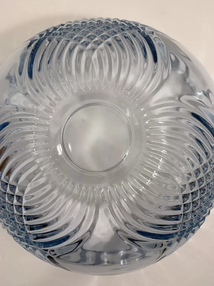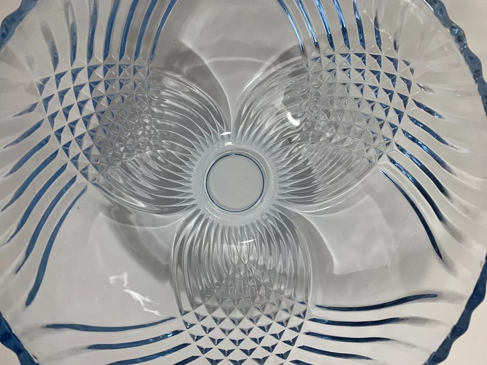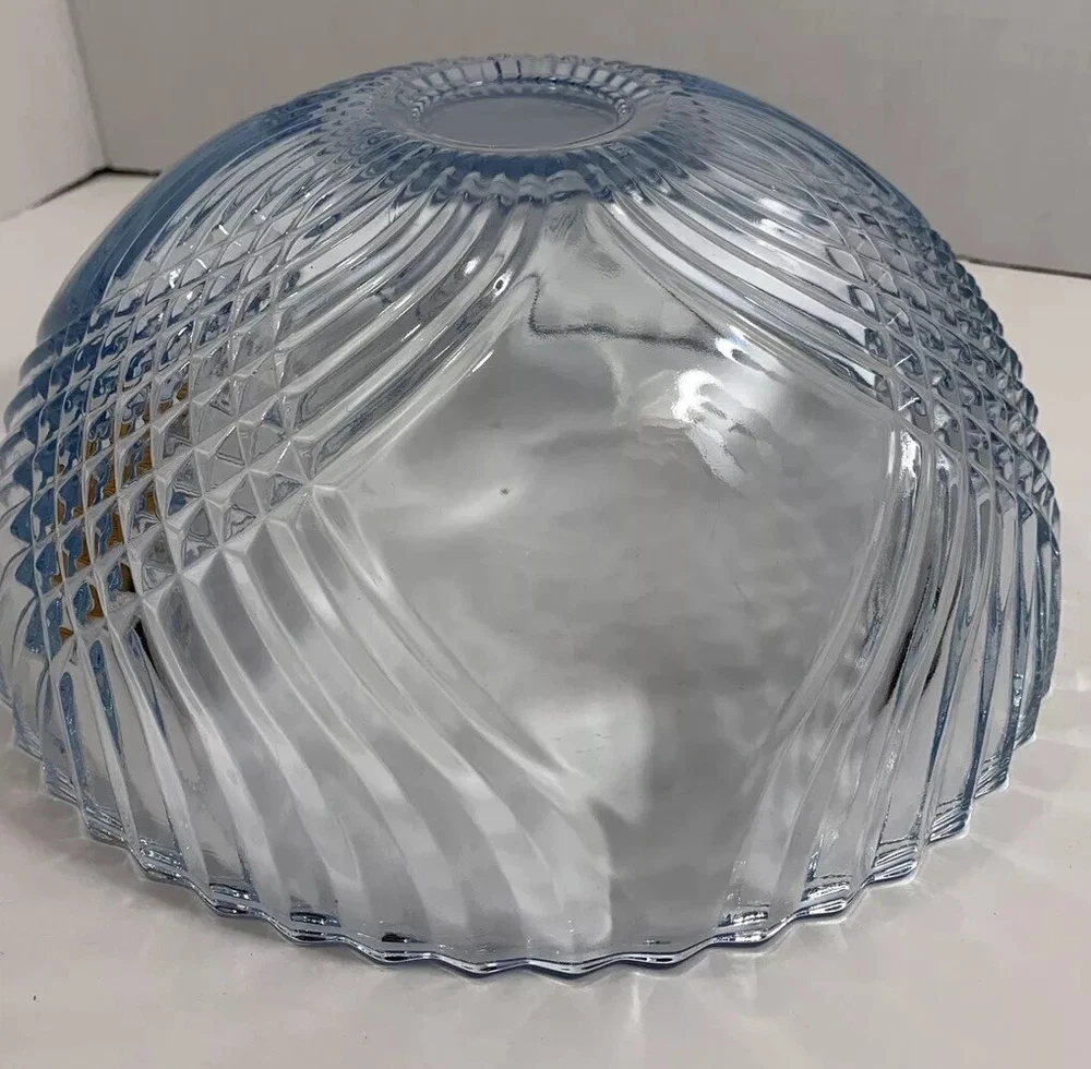 Indiana Glass Enchantment Blue Large Serving Bowl Preowned, and lightly used in very good clean condition. Some light scuffs and scratches on the bottom from normal use. There are no chips or cracks to the piece. Light blue glass with a pattern of swirled crisscrosses and diamond point. Dishwasher safe. Made in the USA Measures approx. 4-3/4" tall and is 10-1/2" wide. See photos for details and ask all questions before purchasing. "FREE SHIPPING" Thank you for shopping in my store. Check out the other items in my eBay Store! HAPPY BIDDING 1/16/25db