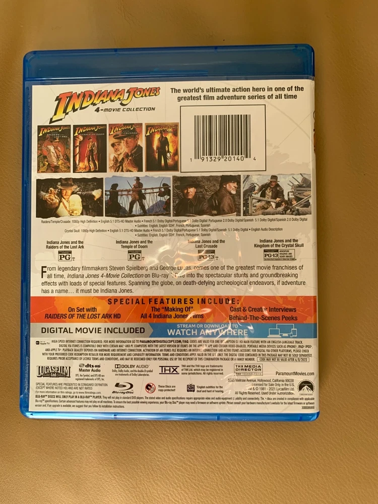 Indiana Jones: 4-Movie Collection Blu-ray Movie MPAA Rating: Pg-13 Genre: Action/Adventure Movie Studio: Paramount Pictures Run Time (minutes): 481 Format: Blu-ray/digital combo Language: English Subtitle Language: Portuguese, Spanish, French, English Origin: Made in the USA All the discs are in excellent condition, no scratches or marks. From a smoke-free and pet-free home. If you have questions about the item before purchasing,please feel free to contact me! (See photos for exact condition).