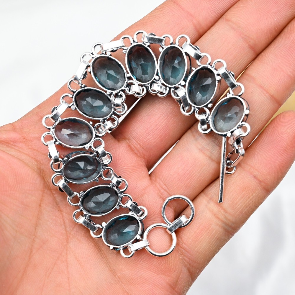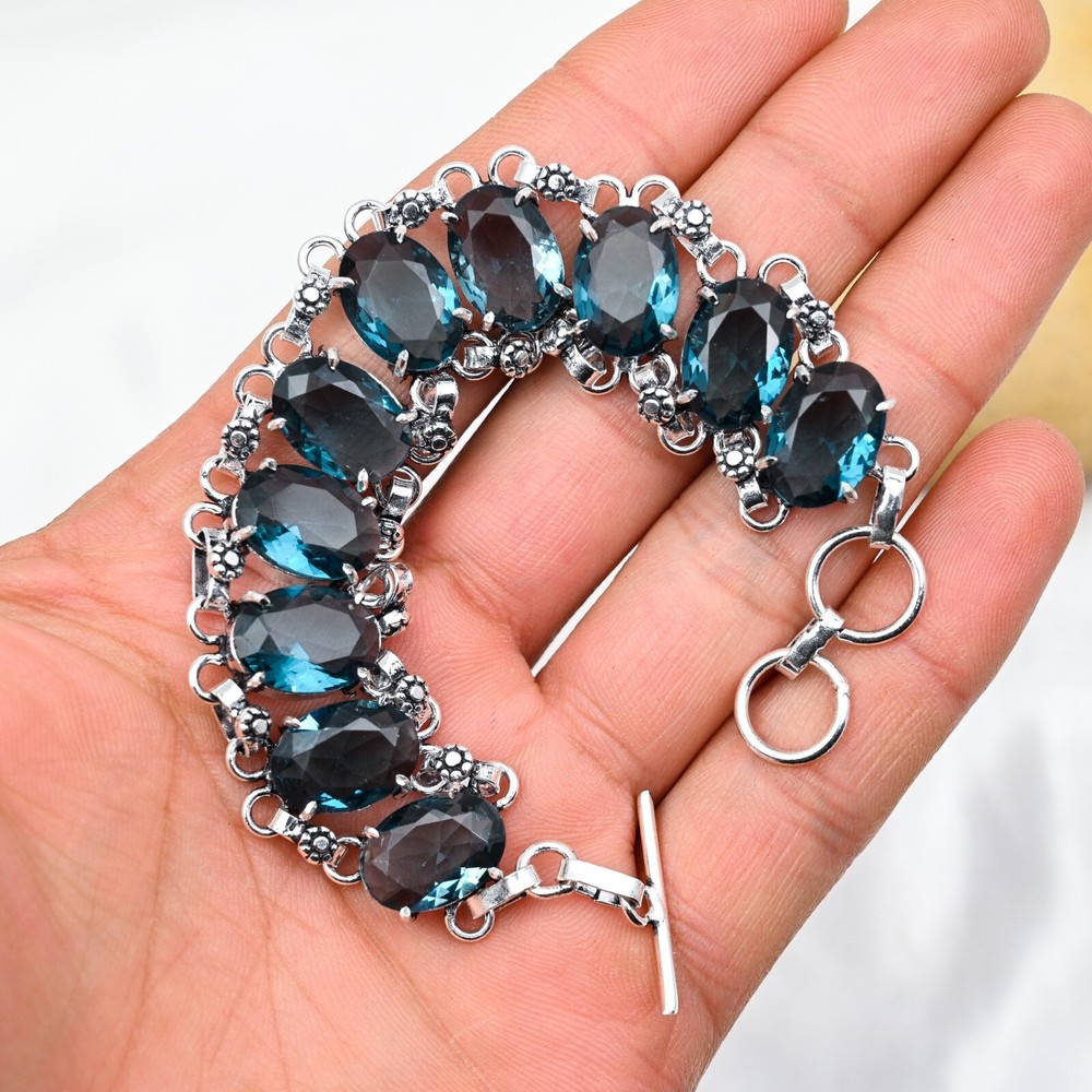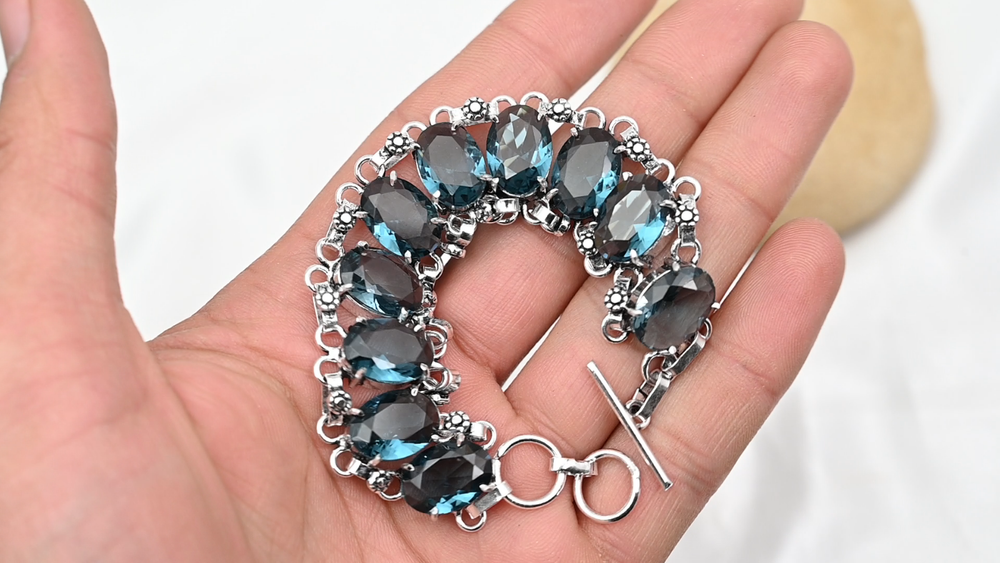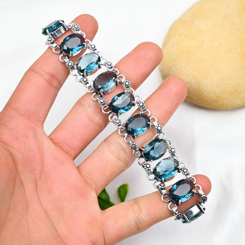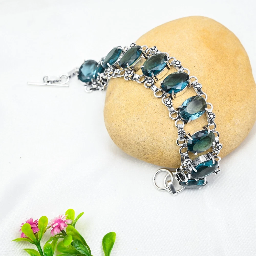 Number of Gemstones:10Diamond Color Grade:N/AColor:SilverTotal Carat Weight:10 carat and aboveMaterial:GemstoneMain Stone Depth:N/ACollection:HandmadeChain Type:N/AMain Stone Color:BlueCountry/Region of Manufacture:IndiaCertification:N/AType:BraceletTheme:Beauty, Bohemian, Ethnic, Halloween, LoveNumber of Diamonds:N/ACut Grade:ExcellentMain Stone Shape:OvalCountry of Origin:IndiaColored Diamond Intensity:N/AShape:Same As PictureStyle:ChainBase Metal:Sterling SilverOccasion:Anniversary, Birthday, Christmas, Engagement, Mother's Day, Valentine's Day, WeddingMetal:SilverBrand:HandmadeMain Stone Width:N/ASecondary Stone:Indicolite TourmalineMain Stone Creation:NaturalSetting Style:BezelCharm Type:Same As PictureItem Length:8 inches with Adjustable ChainMain Stone:Indicolite TourmalineDiamond Clarity Grade:N/AMain Stone Length:N/AMetal Purity:925Closure:ToggleMain Stone Treatment:Not EnhancedFeatures:Adjustable