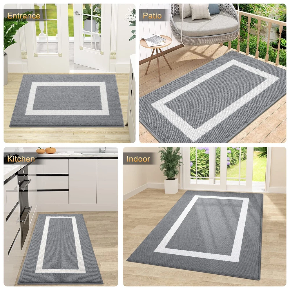 TO MAKE EVERYDAY LIFE EASIER We are dedicated to bringing our customers premium, high-quality, and functional household products at reasonable prices. Our vision is to continuously innovate and improve our products based on customer needs as well as current industry trends. With many different color and sizes to choose from, you will easily find mats to coordinate with your decor! FEATURES:- Constructed of 100% high-quality polypropylene fabric- Dimensions: 20" x 32" x 0.4" / 24" x 36" x 0.4"/ 32" x 48" x 0.4"/ 35" x 59" x 0.4"- Grey, Black and Khaki - Non-slip TP rubber backing- Ribbed weave to work as shoe scraper TAKE A LOOK AT SOME POPULAR QUESTIONS FROM OUR VALUED CUSTOMERS: ☛ HOW CAN I CLEAN THIS MAT? For a quick clean, simply vacuum with a hand-held or regular sized vacuum. Your mat can also be spot cleaned using a mild soap and a damp cloth. For deeper cleans, use a garden hose to rinse off outdoors. Always air dry. Never use bleach on the mat. ☛ CAN I USE THIS MAT UNDER LOW-CLEARING DOORS? Yes! Our mat is designed with a 0.4” sleek, low-pile for most low-clearing doors or entryways. This mat works in both interior and exterior spaces. ☛ HOW EFFECTIVE IS THIS MAT IN CAPTURING DIRT AND MOISTURE? Good question. We’ve intentionally designed our door mats with the solid and practical polypropylene fiber to help keep dirt and moisture trapped in the absorbent mat fabric and off your floors! [FRIENDLY NOTE] Upon arrival, your doormat may have some wrinkles due to being folded during packaging. No worries—this won't impact its functionality. Simply toss it in the washing machine, lay it flat for a couple of days, and let it naturally regain its shape. Alternatively, a quick pass with a hot iron will smooth out any remaining wrinkles. [SOFT TOPSIDES AND ELEGANT DECOR] Transform your space with 's indoor door mats, boasting a gentle yet sturdy topside. The refined geometric design brings an air of beauty and sophistication, establishing a warm and inviting atmosphere. Experience the harmonious blend of comfort and aesthetics as the soft topsides cradle your feet in luxurious elegance. [CAPTURES DIRT AND MOISTURE] Step into comfort with 's indoor door mat. Crafted to effectively capture dirt and rapidly absorb moisture, this mat is perfect for your entryway. Ensure your shoes are promptly rid of water, dust, grit, muck, sand, and more. Elevate your entrance with 's versatile doormat. [EFFORTLESS ELEGANCE] 's door mat features a slim 0.4-inch profile complemented by reinforced overlock edges, presenting a chic and streamlined aesthetic. The considerate design guarantees smooth door operation while keeping the mat securely in place. Cleaning is a breeze – a quick shake, a sweep with a broom, or a pass with a handheld vacuum maintains its fresh appearance. For a deeper clean, toss it in the washing machine with cold water and tumble dry on low heat. [PERSONALIZED WELCOME] Craft a personalized welcome for your home with 's door mat. Its neutral yet stylish design seamlessly complements any decor, providing a platform for expressing your unique taste. Versatile and suitable for all weather conditions, this door mat fits effortlessly as a front door mat, outdoor mat, welcome mat, indoor entryway mat, shoe mat, dog doormat, or floor mat. Ideal for use in various areas, such as the mudroom.