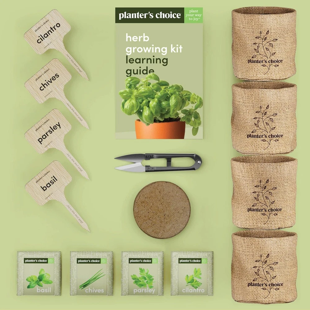 EVERYTHING YOU NEED TO EASILY GROW 4 CULINARY HERBS AT HOME, IN ONE SLEEK BOX: 4 durable burlap pots, 4 moisture-proof seed packets, 1 soil disc that expands when watered to fill all four pots, 4 beautiful bamboo plant markers, pruning shears and a beautiful, comprehensive instruction booklet. Grow the following 4 tasty herbs: Basil, Cilantro, Chives and Parsley. #1 GROWTH PERFORMANCE: The Planters’ Choice kit has the best growing success rate on the market. We package the seeds in our seed-safe pouches to ensure proper germination. A UNIQUE GIFT FOR THAT UNIQUE SOMEONE: For your best friend or loved one, this beautifully packaged indoor herb garden kit is the perfect gift. See the excitement in their eyes as they receive this elegant gift box. For mom, dad, him or her, this is the perfect gift to give on birthdays, anniversaries, holidays or any other occasion. Ideal for beginners, masters and children alike. NO GREEN THUMB NEEDED: Our instruction booklet is the most comprehensive, detailed and beautifully-designed on the market so that you can follow along on the journey of each seed, its history, and the best way to plant it to ensure it germinates. This book will teach the beginner and entertain the master. We have extended all our effort in this kit to make it the best in class and we are positive that you will love it. If you struggle with any aspect of the process, don't hesitate to contact us. We promise to help you out until you receive the results that you want. Product Description