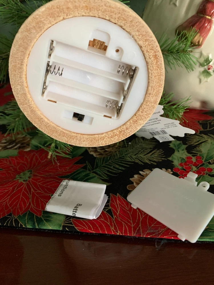Indoor Lighted Mini Christmas Tree 10 warm white LEDs and 6 brown pinecones Battery operated - three AAA batteries (not included) 17" tall, 9" wide 3 1/2" diameter wood base