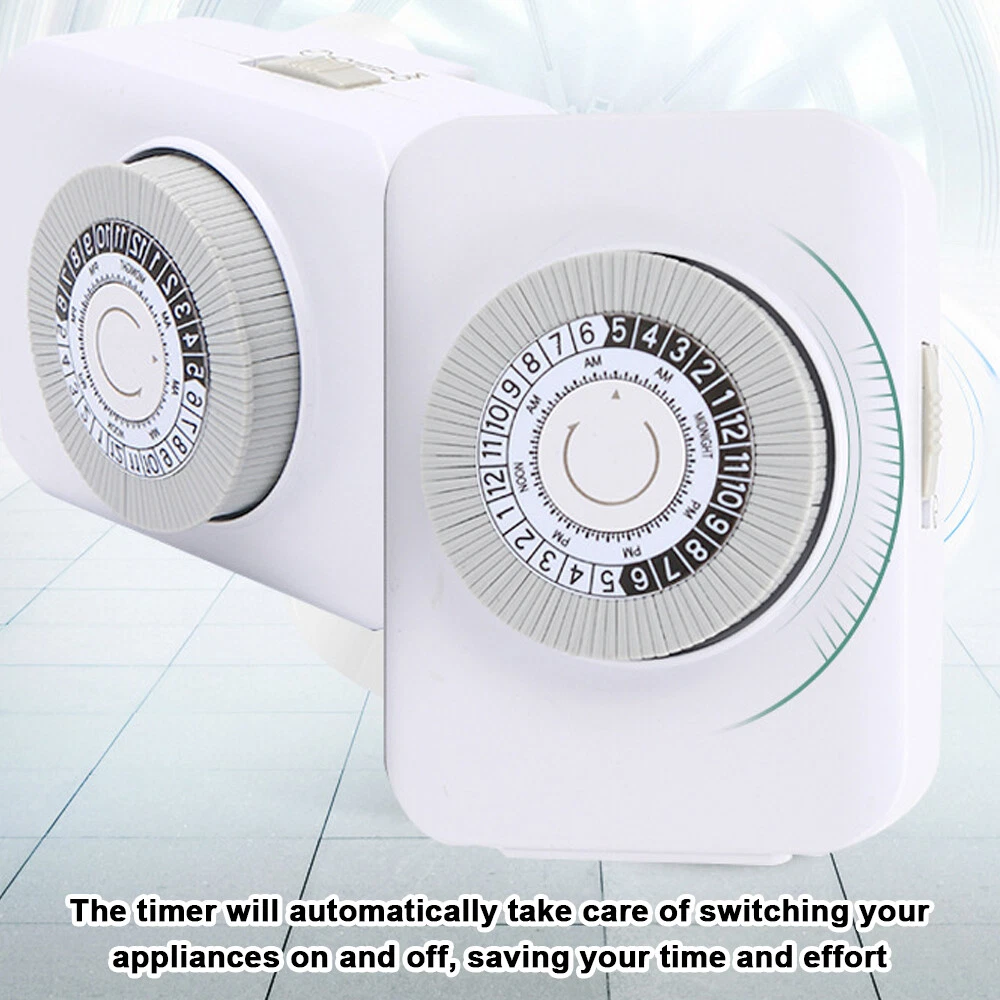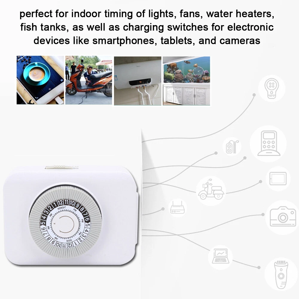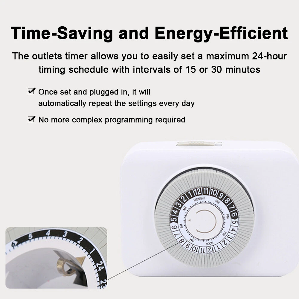 Features: -Saving and Energy-Efficient: The outlets timer allows you to easily set a maximum 24-hour timing schedule with intervals of 15 or 30 minutes. Once set and plugged in, it will automatically repeat the settings every day. No more complex programming required! Hassle-free Operation: With the timer, you can effortlessly control your devices by simply pulling out the pins to indicate off and pressing it back in for power on . The timer will automatically take care of switching your appliances on and off, saving your and effort. Versatile and Convenient: Designed with a 2-prong socket, it is perfect for indoor timing of , fans, heaters, fish tanks, as well as switches for electronic devices like smartphones, tablets, and cameras. It's a -and- solution for all your timing needs. Compact and Space-Saving: It features a compact and stylish design that helps save socket space without blocking adjacent outlets. Experience the convenience without sacrificing other needs. Reliable and Safety: Crafted with high-quality PC -retardant material, the timer ensures safety and durability. The built-in conductive material ensures stable electrical conductivity, providing long-lasting performance. Specifications: Color: White Material: PC Interval: 15-Min/30-Min(optional) Timing : 15-Min: 15min-24H 30-Min: 30min-24H Rated Voltage: , 60Hz Rated Current: 15A Environmental : 0-55℃ Item Size: 80.4 * 58 * 60.6mm/ 3.2 * 2.3 * 2.4in Package Size: 140 * 120 * 80mm/ 5.5 * 4.7 * 3.1in Package Weight: 180g/ 6.3oz Packing List: 1 * Outlets Timer