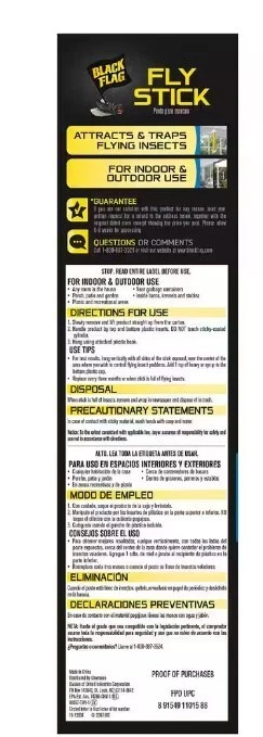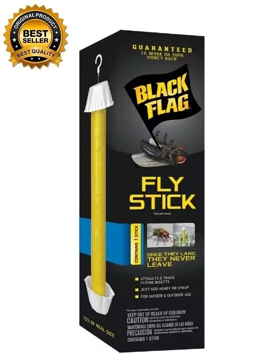 About This Product Insects invading your corner of the world? Whatever insect you're fighting, Black Flag products are dedicated to providing the tools you need to regain control. With formulas that act fast and never back down, Black Flag insect controls have been arming homeowners in the battle against invading bugs for more years than any other brand.Flies and other flying insects can be a real aggravation when they raid your picnic, porch or patio. Black Flag Fly Stick attracts and traps houseflies and other flying pests indoors or outdoors anywhere flying insects are a nuisance. Simply add honey or syrup to attract them to the stick - once they land, they never leave. Hang in any room of the house; near your porch, patio or garden; around recreational areas; near garbage containers; and inside barns, kennels and stables. Replace every 3 months or when the stick is full. Just remove, wrap in newspaper and dispose of in trash. For best results, hang vertically with all sides of the stick exposed, near the center of the area where you wish to control flying insect problems. Add 1 tsp of honey or syrup to the bottom plastic cup. Highlights Traps flying insects: once they land, they never leave ATTRACTS FLYING INSECTS: Just add honey or syrup. USE INDOORS AND OUTDOORS: Use anywhere flying insects are a nuisance. HOOK INCLUDED FOR HANGING: For best results, hang vertically with all sides of the stick exposed.