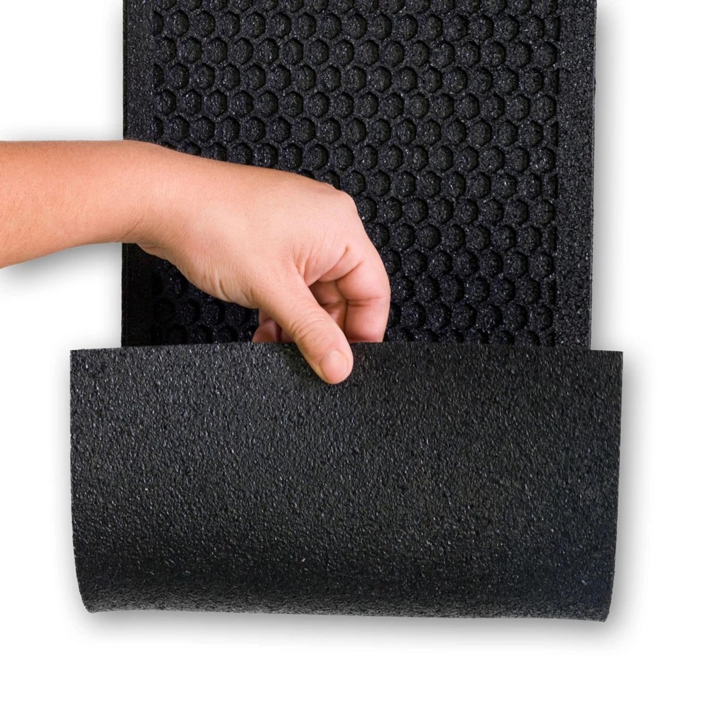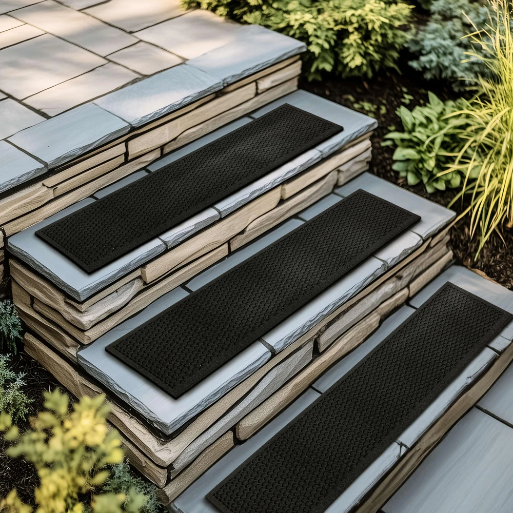 Enhance your staircases with premium Honeycomb stair treads by , expertly crafted from durable recycled rubber to deliver exceptional traction and long-lasting resilience in high-traffic areas. Designed for versatility, these stair treads not only improve safety in residential settings but also provide essential functionality in commercial spaces. With their robust construction, grooved honeycomb surface, and dependable non-slip grip, they ensure peace of mind against slips and falls, offering secure footing with every step. Whether in a functional home environment or a bustling commercial setting, these stair treads are the perfect solution for enhancing safety and durability while maintaining a sleek, modern aesthetic. ROBUST CONSTRUCTION: Resilient recycled rubber material offers long-lasting waterproof performance for both indoor and outdoor use, standing strong against all weather conditions—sun, rain, sleet, and snow! SECURE TRACTION: The grooved honeycomb surface, paired with a non-skid backing, improves stair safety by providing reliable stability and a secure grip with every step. SLEEK DESIGN: Low-profile build provides optimal functionality for high-traffic areas by minimizing tripping hazards and eliminating entryway obstructions, allowing doors to open and close effortlessly. MULTIPURPOSE USE: Ideal for indoor and outdoor staircases in both residential and commercial spaces, offering enhanced convenience and functionality for a variety of applications. EASY CARE & CLEAN: Vacuum, sweep, shake out, or spray off debris outdoors with a garden hose and air dry.