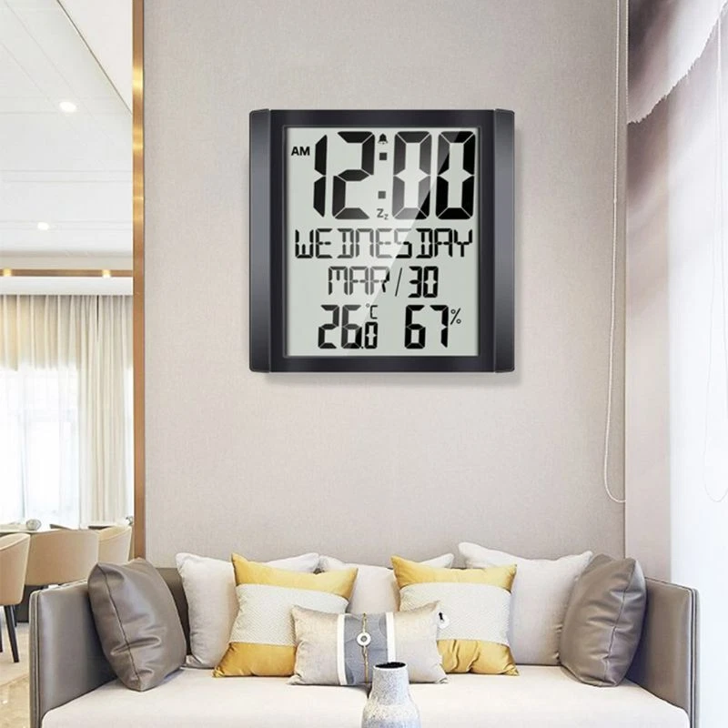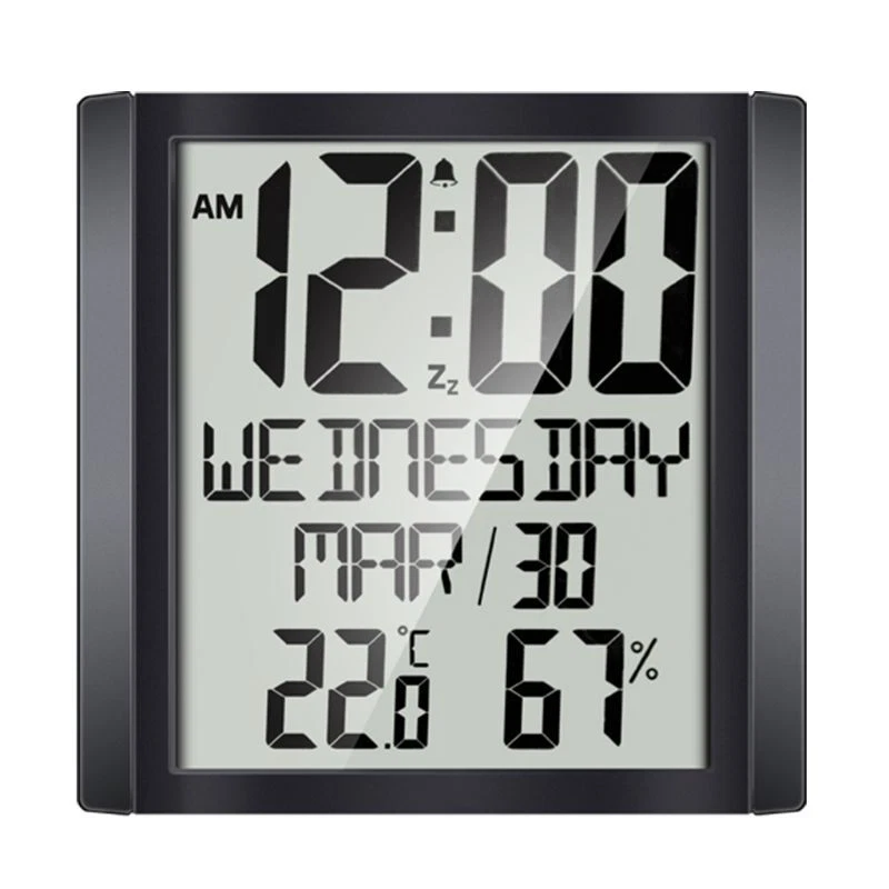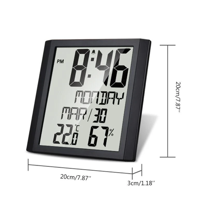 Indoor Room Electronic Temperature Humidity Meter Digital Thermometer Hygrometer Wall Clock for Extra Large Digital Display for Time Day Calendar Indoor Thermometer Hygrometer Table Desk Stand & Wall Hanging Feature: Large screen display, alarm clock function, snooze function; Indoor thermometer and hygrometer function. Specification: Product model: TS-8608 ABS+electronic components Size: 20*20*for cm/7.87*7.87" Packing size: 22.5*22.5*5cm/8.86*8.86*1.97" Colour: Black Power supply: 3 x 1.5V AAA batteries (not included), insert batteries, it will emit a beep sound and then to the standard display and display the temperature and relative humidity of INDOOR. Default display when turned on: Time: 0:00 January 1st, 2020 Week language: for Time format: 24HR Date display format: Month-Date Unit: temperature (℃), relative humidity Temperature and humidity detection instruction: INDOOR temperature detection -1~+48 ℃ (+30.2~+118.4 ℉) If the detection temperature of INDOOR is -1℃ (+30.2℉), it will display LL.L℃ & ℉; if above +48℃ (+118.4℉), HH.H℃ & ℉ Humidity of INDOOR: 20%~95% The temperature and humidity detection cycle of INDDOR is 60 seconds. When the alarm sounds, the temperature and humidity detection is not performed, and the INDOOR temperature and humidity value is not updated. If the detection humidity of INDOOR is lower than 20%, it will display 20%; than 95%, and also display 95% Notice: 1. When the characters are unclear, fuzzy, flashes madly or a symbol appears, it is recommended to replace the 2. For both table placing and wall hanging. 3. It has no backlight. 4. Week display is only available in English. Note: 1. There may be slight size due to manual measurement, different measuring methods and tools. 2. The picture may not reflect the actual color of the item because of different photographing light, and display