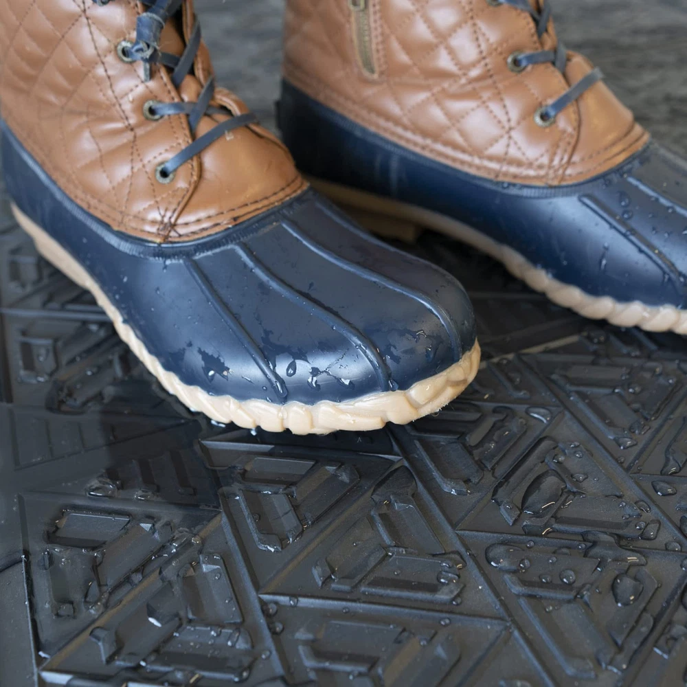 From slick rain boots to muddy dog paws, protect your floors and create a safe walking surface with Outdoor Rubber Scraper Door Mats. Designed with triangular ridges to trap mud, dirt, snow, and grime - your flooring is protected while offering traction for walking on what could have otherwise been a slippery surface. Crafted with a proprietary blend of rubber material, this commercial black rubber scraper mat is built to withstand frequent use and most weather conditions without deteriorating. Suitable for both commercial and residential use - collect dirt and mud from shoes in breezeways, mudrooms, and office entrances. Provide a non-slip matting surface in garage flooring and industrial flooring. Place the outdoor door mat outside your patio doorway to collect dirt from shoes and paws before they enter your home. When the mat is dirty, simply spray with a hose to clean. With quality, durability, and safety in mind – the Outdoor Rubber Scraper Door Mat has your floors covered. RUBBER SCRAPER MAT: Large rubber mat with triangular design traps water, mud, dirt, snow, sand, and grime to keep your indoor flooring mess-free. Designed for outdoor entrance ways, this doormat is able to withstand most outdoor environments INCLUDES: (1) heavy duty, commercial 3' x 4' black rubber scraper mat made with a proprietary blend of recycled materials COMMERCIAL USE: Heavy duty door mat can be used as commercial entry mats, industrial floor mats, or outdoor non-slip garage mats RESIDENTIAL USE: Black rubber mat is perfect to use as a front entrance way or garage floor mat EASY TO CLEAN: Simply spray with a hose to remove mud, dirt, snow, sand, and grime from the scraper mat