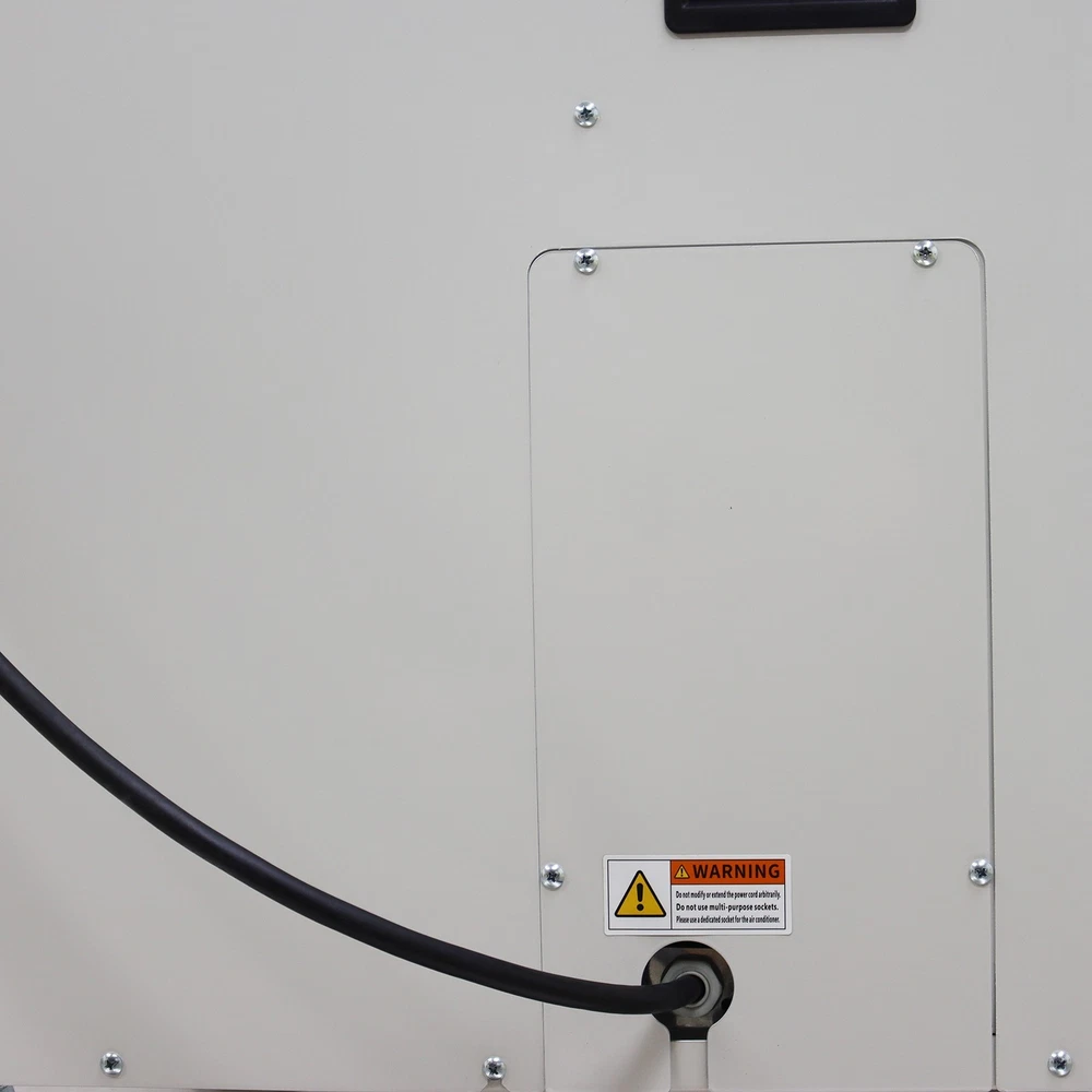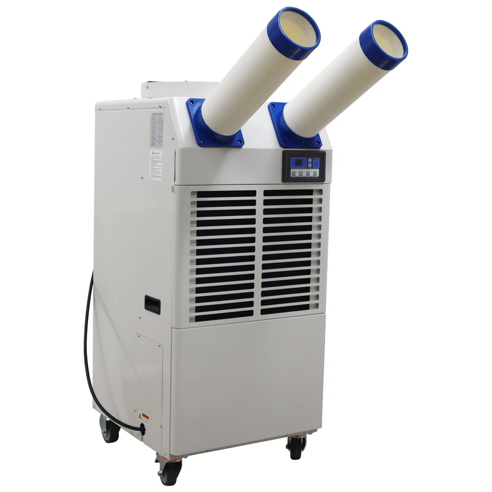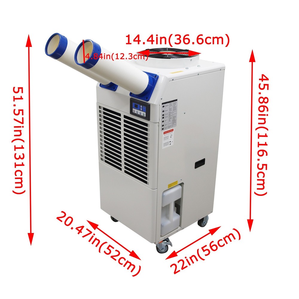 Industrial Air Conditioner Portable Spot Cooler for Workshop Warehouse Factory The industrial air conditioner is an efficient and professional cooling device specifically designed for the industrial scenarios. It features long-term continuous operation, quick cooling and wide coverage range and has the core functions of controlling the environmental temperature, stabilizing the operation of equipment and ensuring the comfort of the environment. The industrial air conditioner is suitable for research institutes, disaster scene ambulances, automobile repair centers, manufacturing engineering, temporary offices, factory production workshops, canteens, warehouses, on-site offices, outdoor activities such as golf practice fields, various celebrations, temporary greenhouses, etc. Model MAC-55C Voltage AC 110V 60Hz Cooling capacity 18700BTU Cool air flow 950m³/h Hot air flow 2300 m³/h Current 6.6A Maximum current 7.4A Power 1800W Compressor Fully enclosed rotary Condensate treatment method 14L Storage bucket Refrigerant R410A Exhaust pressure 3.0MPa Suction pressure 0.9MPa Maximum operating pressure 3.7MPa Using environment 18˚C~45˚C Machine size 52*56*116.5cm (20.47*22*45.86 inches) Net weight 79.5kg (175.27LBs) Product Features 1. Simple operation, long service life, high efficiency, power saving. 2. Easy and convenient to install. 3. The cooling air duct can be expanded to adapt to different working environments. 4. Effective dust filtering and dehumidifying. 5. Great for times when temporary cooling is needed. 6. Caster wheels allow for easy movement and fixing. 7. Equipped with pulleys, light and flexible. 8. Large air volume, strong refrigeration, low energy consumption, low noise, long life and stable operation. 9. Using R410A refrigerant, the temperature is comfortable. 10. The compressor can be used for refrigeration in a high temperature environment of 45˚C. 11. Using a fully automatic control system with the automatic diagnosis function, effectively prevent damage to the machine due to wrong operations. Control Panel The control panel is compact in structure and integrates the functions of speed regulation, temperature control and air volume adjustment. The operation is easy and convenient, and the alarm function is also fulfilled. Air Outlets The air outlets are soft and flexible, the length and direction can be freely adjusted, the air outlets can well adapt to different working environments and meet different cooling requirements, and the air volume is higher. Centrifugal Fan The high-quality centrifugal fan is adopted to achieve efficient heat dissipation and exchange and improve the heat exchange efficiency of the cooling system. The protective net plays a good role in safety protection. Storage Bucket The storage bucket has a large storage capacity of 14L and can collect the condensate water to keep the working environment clean. The hidden design effectively reduces the occupied area and greatly saves the space. Handles The groove type handles are designed for easily carrying the machine to different working environments, meet the ergonomic standards and are resistant to wear and impact. Universal Wheels The universal wheels are used for allowing the machine to move to different scenarios, effectively improving the movement flexibility and environmental adaptability. Operation Method 1. Power switch Turn on the power, the power switch indicator light is on, and press the button to turn on and off the machine. 2. Air volume selection Press the button to select the air volume of the strong and weak grade, while the indicator shows strong and weak. 3. Cold air temperature setting Press the cold air temperature setting key, and the cold air temperature indicator is on. At this time, press the upper and lower temperature adjustment button, you can set the required outlet temperature, that is, set the temperature mode to run cold. Cold air temperature can be set from 0℃ -30℃. When the cold air temperature is higher than the set temperature of 1℃, the compressor works, the outlet outputs cold air; when the cold air temperature is below the set temperature of 1 ℃, the compressor stops working, and the outlet outputs the natural wind. 4. Environmental temperature setting Press the button, the machine detects the inlet air temperature, while the inlet air temperature indicator is on. Press the upper and lower temperature adjustment button, you can set the required inlet temperature, that is, to set the temperature mode of operation, the inlet temperature can be set to the range of 18℃ ~ 35℃. When the inlet air temperature is higher than the set temperature of 1 ℃, the compressor works, the outlet outputs the cold air; when the inlet temperature is lower than the set temperature of 1 ℃, the compressor stops working, the outlet outputs the natural wind. 5. Alarm indicator When the machine is full of water, overcurrent, overheating, high pressure, the alarm indicator is on, the machine stops running, and LED display shows the corresponding fault code. Precaution 1. This product is industrial cooling and air-conditioning equipment, not a houseware. 2. This product is a piece of local cooling air-conditioning equipment. The cooling and heat dissipation are conducted on the same machine, which is different from the traditional household split air conditioner. 3. This machine cannot cool the whole space (if the whole space needs to be cooled down, it is necessary to install pvc hose or aluminum foil single tube at the hot air outlet to discharge the hot air outside, and this model needs to choose a 40cm size hose). 4. The design and use environment of this product is 18-45℃. If the temperature is lower than or higher than this temperature zone, the equipment will not operate normally, and the product itself is not malfunctioning. 5. The noise of this product is 60-70 decibels, which is not suitable for occasions that require noise (such as bedrooms, meeting rooms, office