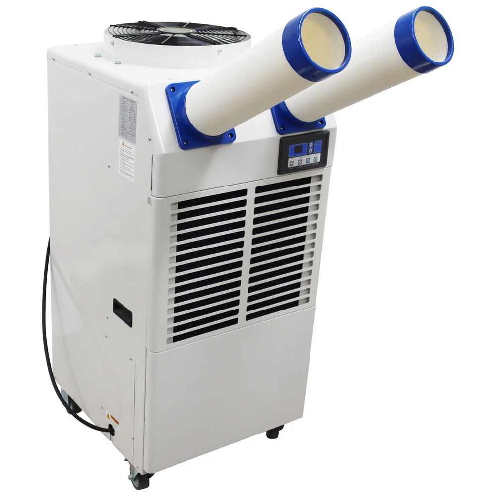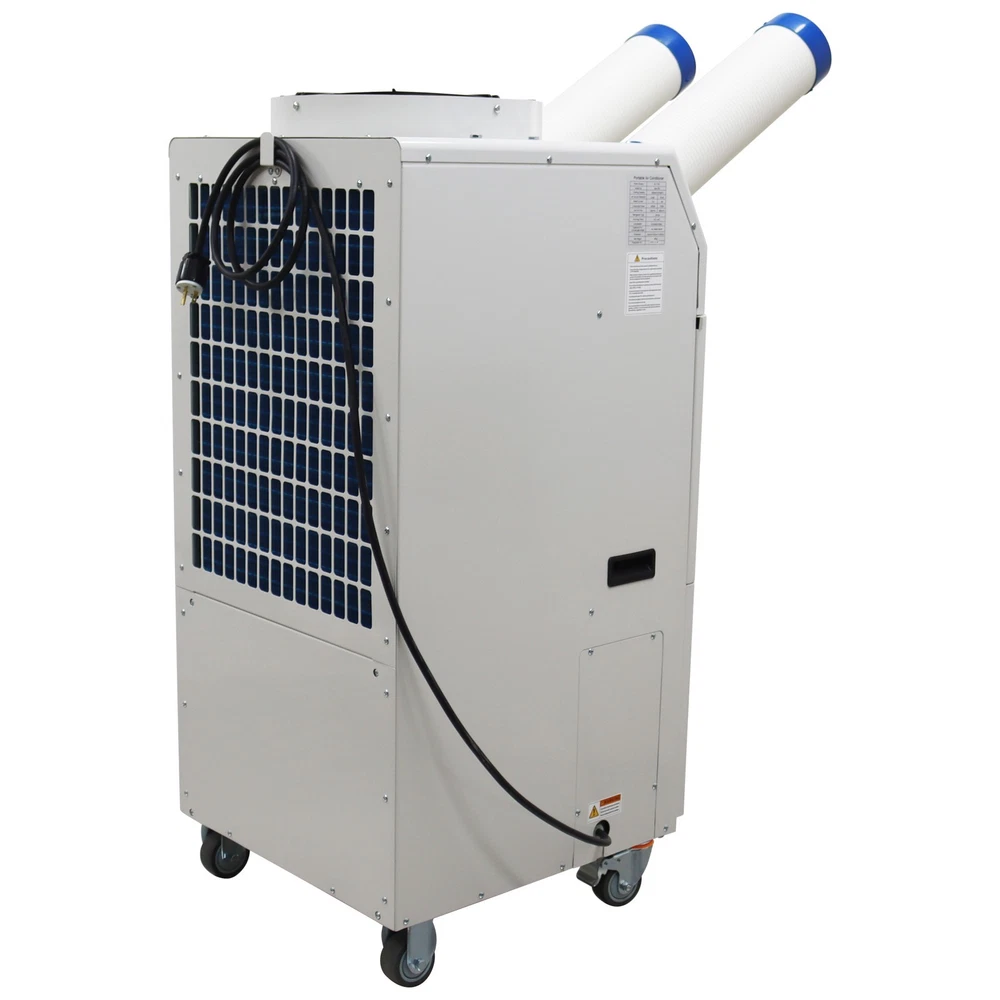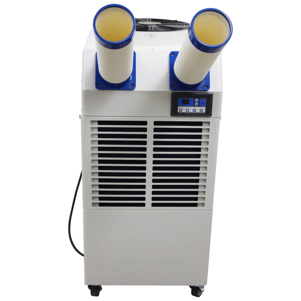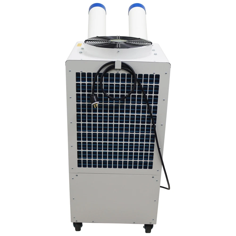 Industrial Air Conditioner Portable Spot Cooler for Workshop Warehouse Factory The industrial air conditioner is an efficient and professional cooling device specifically designed for the industrial scenarios. It features long-term continuous operation, quick cooling and wide coverage range and has the core functions of controlling the environmental temperature, stabilizing the operation of equipment and ensuring the comfort of the environment. The industrial air conditioner is suitable for research institutes, disaster scene ambulances, automobile repair centers, manufacturing engineering, temporary offices, factory production workshops, canteens, warehouses, on-site offices, outdoor activities such as golf practice fields, various celebrations, temporary greenhouses, etc. Model MAC-55C Voltage AC 110V 60Hz Cooling capacity 18700BTU Cool air flow 950m³/h Hot air flow 2300 m³/h Current 6.6A Maximum current 7.4A Power 1800W Compressor Fully enclosed rotary Condensate treatment method 14L Storage bucket Refrigerant R410A Exhaust pressure 3.0MPa Suction pressure 0.9MPa Maximum operating pressure 3.7MPa Using environment 18˚C~45˚C Machine size 52*56*116.5cm (20.47*22*45.86 inches) Net weight 79.5kg (175.27LBs) Product Features 1. Simple operation, long service life, high efficiency, power saving. 2. Easy and convenient to install. 3. The cooling air duct can be expanded to adapt to different working environments. 4. Effective dust filtering and dehumidifying. 5. Great for times when temporary cooling is needed. 6. Caster wheels allow for easy movement and fixing. 7. Equipped with pulleys, light and flexible. 8. Large air volume, strong refrigeration, low energy consumption, low noise, long life and stable operation. 9. Using R410A refrigerant, the temperature is comfortable. 10. The compressor can be used for refrigeration in a high temperature environment of 45˚C. 11. Using a fully automatic control system with the automatic diagnosis function, effectively prevent damage to the machine due to wrong operations. Control Panel The control panel is compact in structure and integrates the functions of speed regulation, temperature control and air volume adjustment. The operation is easy and convenient, and the alarm function is also fulfilled. Air Outlets The air outlets are soft and flexible, the length and direction can be freely adjusted, the air outlets can well adapt to different working environments and meet different cooling requirements, and the air volume is higher. Centrifugal Fan The high-quality centrifugal fan is adopted to achieve efficient heat dissipation and exchange and improve the heat exchange efficiency of the cooling system. The protective net plays a good role in safety protection. Storage Bucket The storage bucket has a large storage capacity of 14L and can collect the condensate water to keep the working environment clean. The hidden design effectively reduces the occupied area and greatly saves the space. Handles The groove type handles are designed for easily carrying the machine to different working environments, meet the ergonomic standards and are resistant to wear and impact. Universal Wheels The universal wheels are used for allowing the machine to move to different scenarios, effectively improving the movement flexibility and environmental adaptability. Operation Method 1. Power switch Turn on the power, the power switch indicator light is on, and press the button to turn on and off the machine. 2. Air volume selection Press the button to select the air volume of the strong and weak grade, while the indicator shows strong and weak. 3. Cold air temperature setting Press the cold air temperature setting key, and the cold air temperature indicator is on. At this time, press the upper and lower temperature adjustment button, you can set the required outlet temperature, that is, set the temperature mode to run cold. Cold air temperature can be set from 0℃ -30℃. When the cold air temperature is higher than the set temperature of 1℃, the compressor works, the outlet outputs cold air; when the cold air temperature is below the set temperature of 1 ℃, the compressor stops working, and the outlet outputs the natural wind. 4. Environmental temperature setting Press the button, the machine detects the inlet air temperature, while the inlet air temperature indicator is on. Press the upper and lower temperature adjustment button, you can set the required inlet temperature, that is, to set the temperature mode of operation, the inlet temperature can be set to the range of 18℃ ~ 35℃. When the inlet air temperature is higher than the set temperature of 1 ℃, the compressor works, the outlet outputs the cold air; when the inlet temperature is lower than the set temperature of 1 ℃, the compressor stops working, the outlet outputs the natural wind. 5. Alarm indicator When the machine is full of water, overcurrent, overheating, high pressure, the alarm indicator is on, the machine stops running, and LED display shows the corresponding fault code. Precaution 1. This product is industrial cooling and air-conditioning equipment, not a houseware. 2. This product is a piece of local cooling air-conditioning equipment. The cooling and heat dissipation are conducted on the same machine, which is different from the traditional household split air conditioner. 3. This machine cannot cool the whole space (if the whole space needs to be cooled down, it is necessary to install pvc hose or aluminum foil single tube at the hot air outlet to discharge the hot air outside, and this model needs to choose a 40cm size hose). 4. The design and use environment of this product is 18-45℃. If the temperature is lower than or higher than this temperature zone, the equipment will not operate normally, and the product itself is not malfunctioning. 5. The noise of this product is 60-70 decibels, which is not suitable for occasions that require noise (such as bedrooms, meeting rooms, office