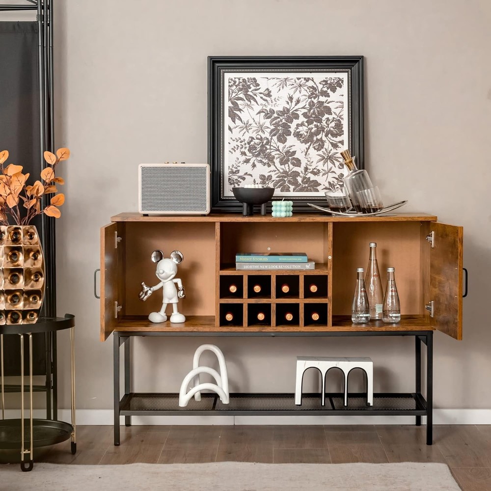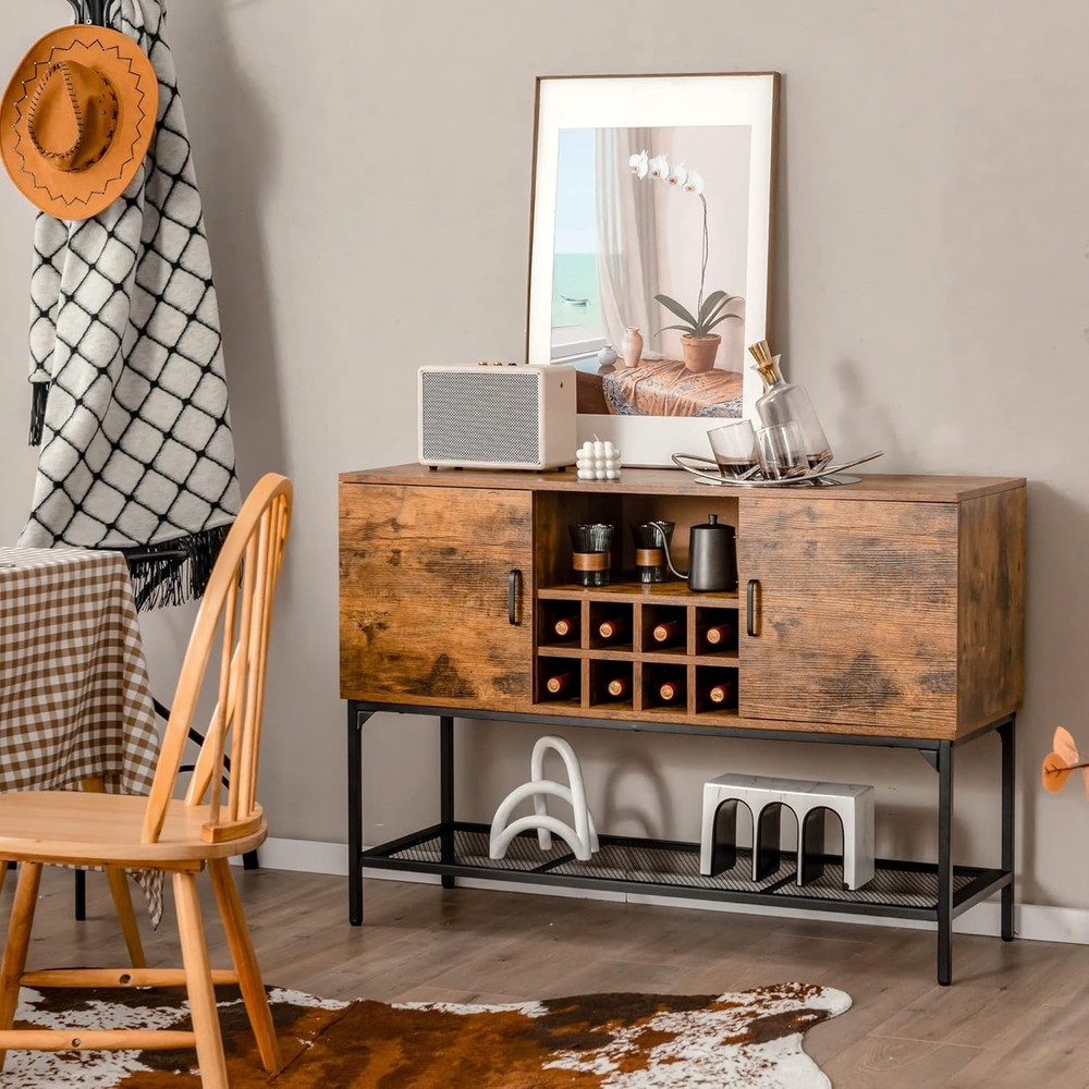 Product Description About this item [Using It as Wine Cabinet?]: Of course! The coffee bar cabinet boasts plenty of storage space, and the most particular part is the 8-bottle wine rack. There you can treasure your wine collections for a special moment to share with your family and friends! Meanwhile, you can also get 2 door cabinets, an open compartment as well as a mesh shelf for storage. [Fit It Where You Need]: With so many storage options, the buffet table will be of great help to tidy up your daily essentials, keeping chaos out of sight and bringing order back. You can put it in the kitchen or dining room for holding small appliances and tableware, or let it be in the living room or entryway for some grab-to-go items. [For Years It Still]: Be stylish and sturdy as it is first set up! The construction of thickened engineered wood and rustproof metal frame endows a large bearing capacity (up to 450lbs) to the kitchen buffet storage cabinet. Not to mention that there are reinforced features, including the triangular structure and the adjustable foot pads, to ensure superb sturdiness and stability. [Making Your Room More Welcoming]: We are dedicated to providing you with the most perfect combination of versatility and personality. With rustic brown wood grain and black metal frame, the buffet sideboard breathes a flair of natural vigor into your home, making it a warm and inviting place to live in. [Assemble with Ease]: Get relaxed! You are not helpless to assemble the buffet cabinet, since we spare no effort to make every step in the instruction easy to follow. And the accessories? They are easy to recognize with labels. If you have any problem, feel free to contact us! What We’d Like to Share: Refresh your space with this industrial bar cabinet! The collision of warm color and black frame makes the kitchen cabinet an eye-catching piece that creates a rustic and vintage atmosphere. Moreover, by providing you with various storage options open or enclosed, the buffet table is a good choice for your to build up an ideal home bistro or coffee station. The wide and flat tabletop is just appropriate for various household appliances, such as a coffee maker, while the 8 wine grids well accommodate the delicate bottles. Then, you’ll have a place to enjoy your leisure and pleasure moment and say bye-bye to chaos or trivial. Specification: Color: Rustic Brown Material: Engineered Wood + Metal Overall Dimensions: 48” x 16” x 33.5” (L x W x H) Open Compartment Dimensions: 16” x 14.5” x 7” (L x W x H) Clearance Between Cabinet and Mesh Shelf: 11” Clearance Between Floor: 4.5” Total Weight Limit: 450 lbs Weight Limit of Countertop: 140 lbs Net Weight: 68.5 lbs Package includes: 1 x Buffet Sideboard 1 x Instruction