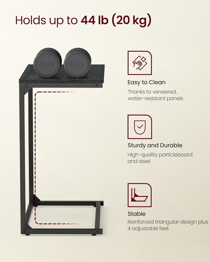 [C Shape Table]: The unique C-shaped side table have rustic brown boards and Black metal frame, Item dimensions 13.8"D x 21.7"W x 26"H [Variety of uses]: The side table can be used as an end table, couch table or bedside table in your living room or bedroom. Simply place your laptop on this table and pull it towards you [Assemble with ease]: No need to spend much time on the nuts and bolts, this laptop table comes with numbered parts and detailed instruction, will be ready for your online meeting in a moment [Adjustable feet]: This end table has adjustable feet that also compensate for unevenness, increasing the stability of the side table, and prevents the floor from being scratched. [What you get: A flexible side table that is perfect for working on the sofa or having breakfast in bed from our practical ALINRU Collection