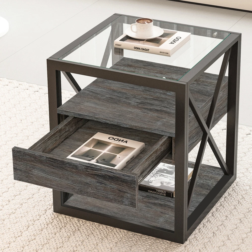 Modern End Table with Drawer Wood Nightstand Industrial Style Side Table Features 1. Stable Structure & Modern Aesthetics:Crafted from premium MDF and a sturdy metal frame, this piece features a tempered glass top that is smooth, scratch-resistant, and effortless to clean. The innovative X-frame structure not only adds visual depth but also reinforces structural stability, delivering exceptional load-bearing capacity and long-lasting durability. 2. Space-Saving Compact Design:Dimensions: 17.72"L × 17.72"W × 21.07"H.Load-bearing capacity: 110lbs. Its compact form adapts seamlessly to corners in living rooms, bedrooms, or home offices, maximizing space efficiency without sacrificing style or functionality. 3. Smart Tiered Storage System:Designed with a practical 3-tier structure, including a convenient pull-out drawer at the middle level for organized storage of books, remotes, or stationery—keeping essentials within reach while maintaining a clutter-free environment. 4. Vintage Industrial Charm with Versatility:The fusion of rustic wood-grain MDF and industrial metal piping offers warmth and rugged elegance. It blends harmoniously while serving as a striking accent piece. 5. Hassle-Free Assembly:All hardwares and accessories are provided. It comes with easy-to-follow instructions.
