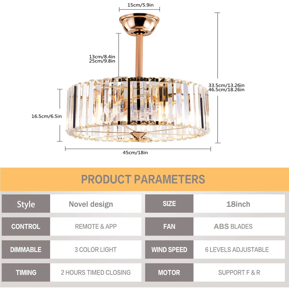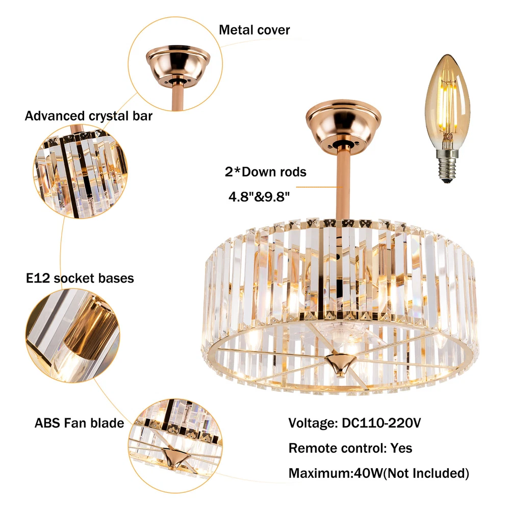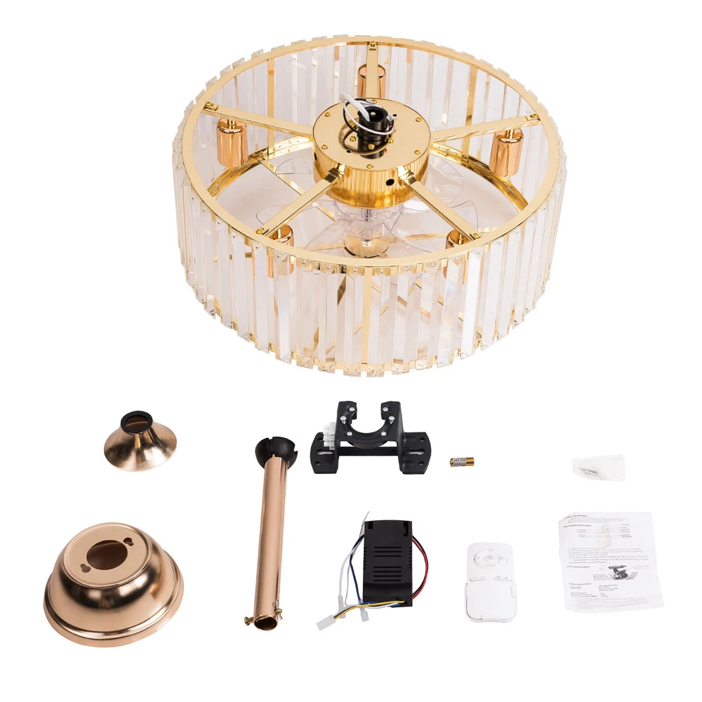 Specifications Color: Gold Material: Copper, Tempered Glass, ABS Surface Treatment: Solder Process Style: Retro Motor Type: Pure Copper&Reversible Motor Number of Fan Blades: 7 Mounting Type: Ceiling Mount Rated Voltage: 85-265V Rated Power: 40W Power Source: DC Wind Speed Gears: 6 Timing: 1/2/4h Bulb Size:5*E26/E27 (Not Included) Suitable Area: 10-15㎡/107-161ft² Electric Fan Design: Ceiling Fan Room Type: Bedroom, Living Room, Dining Room, Living Room, Kitchen Controller Type: Frequency Conversion Remote Control Efficiency: E Noise: About 40dB Base Size(L*H): 15*5cm/5.9*1.96inch Lampshade Size(L*H): 45*16.5cm/18*6.5inch Down-rod Length: 12cm/4.8inch, 25cm/9.8inch Product Height: 33.5cm/13.26inch, 46.5cm/18.26inch Package Included 1 * Ceiling Fan Light 1 *English Manual 1* Remote Control Caged Ceiling Fan with Lights Remote Control Industrial Bedroom Ceiling Fan Description This 2-in-1 ceiling fan light allows you to feel the bright light and enjoy the coolness at the same time. It has six gears of wind speeds with a timing function to meet your daily usage needs. It can be integrated with different decoration styles and is ideal to create an excellent life and sleep environment to accompany you in all seasons. Key Features Stylish Exterior: The cylindrical lampshade, retro color scheme (Gold), and delicate lines make it very luxurious, and the strips of tempered glass are like beating piano keys. It can be a good decorative piece to blend in with different decor styles and add color to your room. Great Durability : The lampshade is made of high-quality copper with a s oldering process and tempered glass with high transparency, which is heat-resistant , strong, durable, and not easy to deform. The fan blades are made of ABS, which has high strength, good toughness, and good formability, which can ensure a smooth surface and good gloss. Excellent Performance: The 7 fan blades and pure copper motor can provide strong wind, which can not only improve the air circulation in the room to keep the air fresh but also can be used with air conditioners to balance the indoor temperature. Meanwhile, the reverse function can promote heat circulation in cold winters High Safety: It is enclosed with 7 ABS blades hidden in the cage to avoid an accident caused by getting involved in the blades, so it's much safer than traditional fans to protect your family away from the fan blade's danger. 2-in-1 Function: The ceiling fan light has the function of fanning and lighting. It can not only illuminate you but also reduce heat, which can save you a lot of space. Adjustable Speed&Working Time: It has 6 gears of wind speed and you can choose low speed to enjoy the comfortable breeze or high speed to cool down quickly. Meanwhile, You can control its working hours in advance (1/2/4 hour), which can bring you great convenience. Large Applicable Area: The item can serve an area of 10-15㎡/107-161ft². So you can feel the coolness and illumination over a considerable area. Easy to Clean : The smooth and flat shell, as well as the detachable fan blades, make this product easy to clean. You only need to clean it with a dry cloth, saving you lots of time and effort. Guaranteed Customer Service: We aim to provide quality products and services. If you have problems, please feel free to contact us. We will reply and solve the problem for you as soon as possible. Details Remote Control: It allows you to remotely control the timing, wind speed, etc, saving you lots of effort. Down Rods: This product is equipped with two down-rods with different lengths for different ceiling heights. Pure Copper Motor: It has stable performance, low-temperature rise, and low noise(About 40dB), providing a quiet working and sleeping environment. Meanwhile, there are a lot of heat dissipation holes on the motor shell, which can provide a good heat dissipation effect to ensure the stable operation and long service life of the motor. Application It is suitable for the living room, dining room, kitchen, study bedroom, small bedroom, conference room, and other places of 10-15㎡/107-161ft². Payment Delivery details Terms of sales About us Contact us Payment We accept ebay payment 。 Fees such as import duties, taxes are not included in the item price or shipping costs. These charges are the buyer's responsibility. Delivery details Shipping: 2-9 working days to: USA Terms of sales We maintain high standards of excellence and strive for hundred percent customer satisfaction. Feedback is very important to us. We hope that you contact us immediately before you give neutral or negative feedback, so that we can address your concerns. It is impossible to address issues if we do not know about them! About us Your satis faction is our ultimate goal. We work hard to earn your trust and future business. Our certified technicians have tested each item before shipping. The unit comes with 1 year limited warranty on all manufacturing defects. a) If you receive a defective item, you may return it or ask for a discount. Please contact us within 14 days after you receive the package. b) What you returned must be intact and in its original packaging as re? u. Customer is responsible for shipping costs of the returned item. c) We will cover the cost of shipping back t with the shipping rate indicated in the registration page. We will send you a new unit or refund the full payment you paid. Thank you. Contact us Business Hour Business Hour: Monday To Friday: 8:30 AM to 5:00 PM (Beijing China time) Due to time zones, our reply to your questions may not be immediately. But within above working time, we will reply your email within 24 hours. If it's non-workdays, please kindly be patient and wait till Monday. Please contact us with ebay message. Please feel free to contact us if you have any questions. Monday To Friday: 8:30 AM to 5:00 PM (Beijing China time) Due to time zones, our reply to your questions may not be immediately. But within above working time, we wi