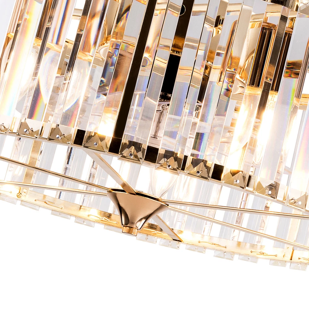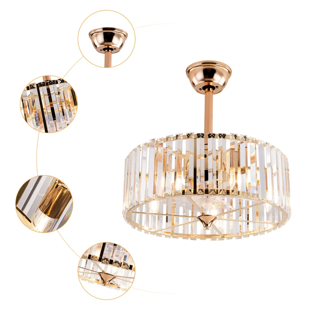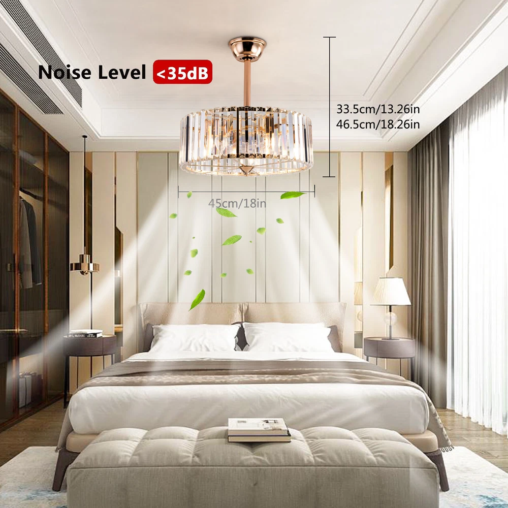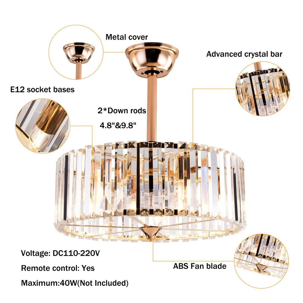 Specifications Color: Gold Material: Copper, Tempered Glass, ABS Surface Treatment: Solder Process Style: Retro Motor Type: Pure Copper&Reversible Motor Number of Fan Blades: 7 Mounting Type: Ceiling Mount Rated Voltage: 85-265V Rated Power: 40W Power Source: DC Wind Speed Gears: 6 Timing: 1/2/4h Bulb Size:5*E26/E27 (Not Included) Suitable Area: 10-15㎡/107-161ft² Electric Fan Design: Ceiling Fan Room Type: Bedroom, Living Room, Dining Room, Living Room, Kitchen Controller Type: Frequency Conversion Remote Control Efficiency: E Noise: About 40dB Base Size(L*H): 15*5cm/5.9*1.96inch Lampshade Size(L*H): 45*16.5cm/18*6.5inch Down-rod Length: 12cm/4.8inch, 25cm/9.8inch Product Height: 33.5cm/13.26inch, 46.5cm/18.26inch Package Included 1 * Ceiling Fan Light 1 *English Manual 1* Remote Control Caged Ceiling Fan with Lights Remote Control Industrial Bedroom Ceiling Fan Description This 2-in-1 ceiling fan light allows you to feel the bright light and enjoy the coolness at the same time. It has six gears of wind speeds with a timing function to meet your daily usage needs. It can be integrated with different decoration styles and is ideal to create an excellent life and sleep environment to accompany you in all seasons. Key Features Stylish Exterior: The cylindrical lampshade, retro color scheme (Gold), and delicate lines make it very luxurious, and the strips of tempered glass are like beating piano keys. It can be a good decorative piece to blend in with different decor styles and add color to your room. Great Durability : The lampshade is made of high-quality copper with a s oldering process and tempered glass with high transparency, which is heat-resistant , strong, durable, and not easy to deform. The fan blades are made of ABS, which has high strength, good toughness, and good formability, which can ensure a smooth surface and good gloss. Excellent Performance: The 7 fan blades and pure copper motor can provide strong wind, which can not only improve the air circulation in the room to keep the air fresh but also can be used with air conditioners to balance the indoor temperature. Meanwhile, the reverse function can promote heat circulation in cold winters High Safety: It is enclosed with 7 ABS blades hidden in the cage to avoid an accident caused by getting involved in the blades, so it's much safer than traditional fans to protect your family away from the fan blade's danger. 2-in-1 Function: The ceiling fan light has the function of fanning and lighting. It can not only illuminate you but also reduce heat, which can save you a lot of space. Adjustable Speed&Working Time: It has 6 gears of wind speed and you can choose low speed to enjoy the comfortable breeze or high speed to cool down quickly. Meanwhile, You can control its working hours in advance (1/2/4 hour), which can bring you great convenience. Large Applicable Area: The item can serve an area of 10-15㎡/107-161ft². So you can feel the coolness and illumination over a considerable area. Easy to Clean : The smooth and flat shell, as well as the detachable fan blades, make this product easy to clean. You only need to clean it with a dry cloth, saving you lots of time and effort. Guaranteed Customer Service: We aim to provide quality products and services. If you have problems, please feel free to contact us. We will reply and solve the problem for you as soon as possible. Details Remote Control: It allows you to remotely control the timing, wind speed, etc, saving you lots of effort. Down Rods: This product is equipped with two down-rods with different lengths for different ceiling heights. Pure Copper Motor: It has stable performance, low-temperature rise, and low noise(About 40dB), providing a quiet working and sleeping environment. Meanwhile, there are a lot of heat dissipation holes on the motor shell, which can provide a good heat dissipation effect to ensure the stable operation and long service life of the motor. Application It is suitable for the living room, dining room, kitchen, study bedroom, small bedroom, conference room, and other places of 10-15㎡/107-161ft². Payment Delivery details Terms of sales About us Contact us Payment We accept ebay payment 。 Fees such as import duties, taxes are not included in the item price or shipping costs. These charges are the buyer's responsibility. Delivery details Shipping: 2-9 working days to: USA Terms of sales We maintain high standards of excellence and strive for hundred percent customer satisfaction. Feedback is very important to us. We hope that you contact us immediately before you give neutral or negative feedback, so that we can address your concerns. It is impossible to address issues if we do not know about them! About us Your satis faction is our ultimate goal. We work hard to earn your trust and future business. Our certified technicians have tested each item before shipping. The unit comes with 1 year limited warranty on all manufacturing defects. a) If you receive a defective item, you may return it or ask for a discount. Please contact us within 14 days after you receive the package. b) What you returned must be intact and in its original packaging as re? u. Customer is responsible for shipping costs of the returned item. c) We will cover the cost of shipping back t with the shipping rate indicated in the registration page. We will send you a new unit or refund the full payment you paid. Thank you. Contact us Business Hour Business Hour: Monday To Friday: 8:30 AM to 5:00 PM (Beijing China time) Due to time zones, our reply to your questions may not be immediately. But within above working time, we will reply your email within 24 hours. If it's non-workdays, please kindly be patient and wait till Monday. Please contact us with ebay message. Please feel free to contact us if you have any questions. Monday To Friday: 8:30 AM to 5:00 PM (Beijing China time) Due to time zones, our reply to your questions may not be immediately. But within above working time, we wi