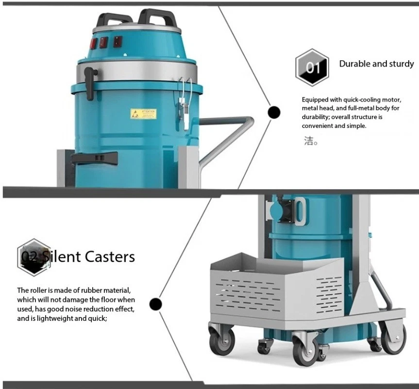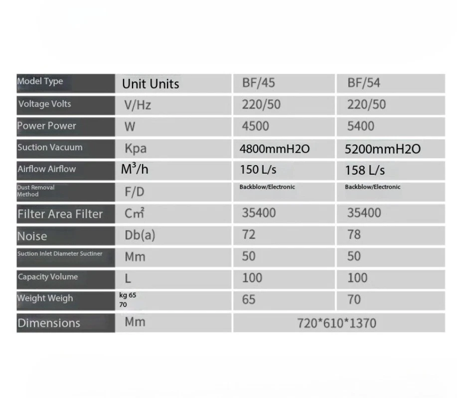 Industrial Vacuum Cleaner BF/54 High-Power Factory Workshop Dust Extractor Model BF/45 Voltage 220V/50Hz Power 45 00W Suction Power 4800mmH₂O kPa Airflow 150 liters/second m³/h Cleaning Method Reverse Air/Electronic Filter Area 35400 cm² Noise Level 72 dB(A) Inlet Diameter 50 mm Capacity 100 L Weight: 65 kg Gross weight: 130 kg Dimensions: 720 × 610 × 1370 mm