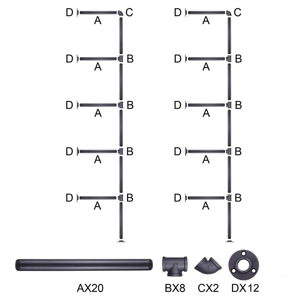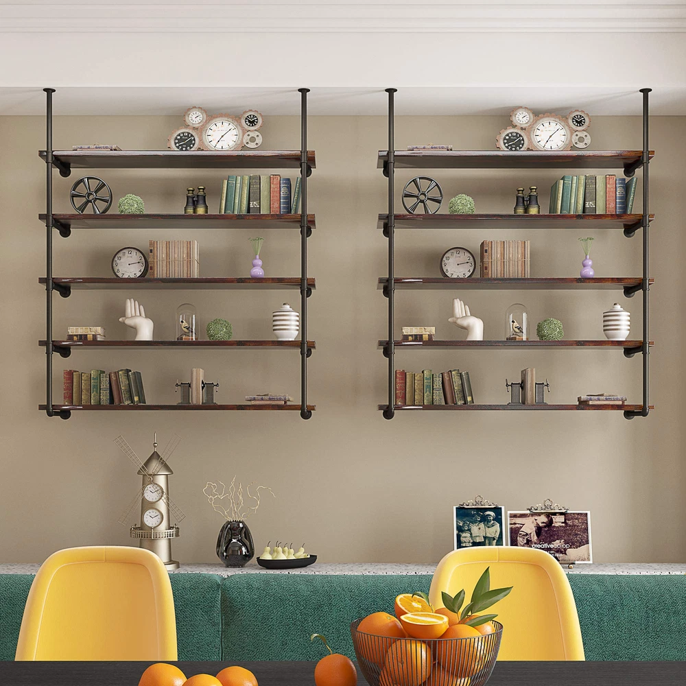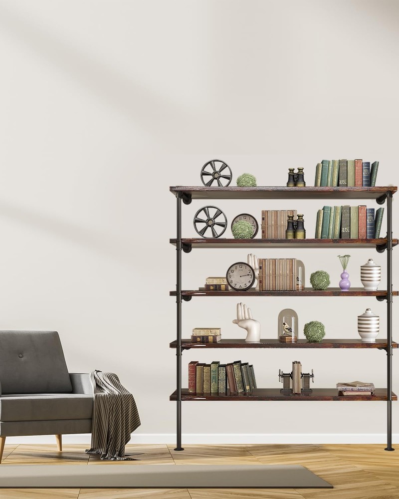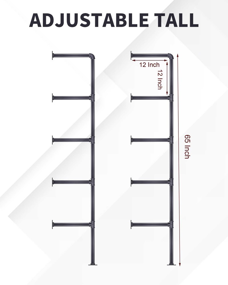 STYLISH CONTEMPORARY DESIGN - Our wall-mounted pipe shelf has a contemporary design with its unique look and build. These vintage bookshelf brackets make your wall look more spacious. SPACE-SAVING STORAGE SOLUTION - This pipe shelf brackets won’t take any floor space. It’s perfect for small spaces and tiny nooks. Now you can have a mess-free home or workplace! DIY OPEN SHELVING MADE SIMPLE - Easily set up a 5-tier pipe shelving brackets. Our kit is complete with 20 cast iron pipes, 12flanges, 8 tees, and 2 elbows. Wood planks are NOT included BUILT TO LAST - Made of 100% iron, our brackets are stable and extremely sturdy. These iron pipe shelves are built to stand the test of time! No need to deal with costly repairs or replacements. SEVERAL WAYS TO USE IT - This iron pipe shelf bracket set isn't just a bookcase. Use it as pantry storage, living room display, open cabinet, or bathroom towel holder. Showcase your personality!