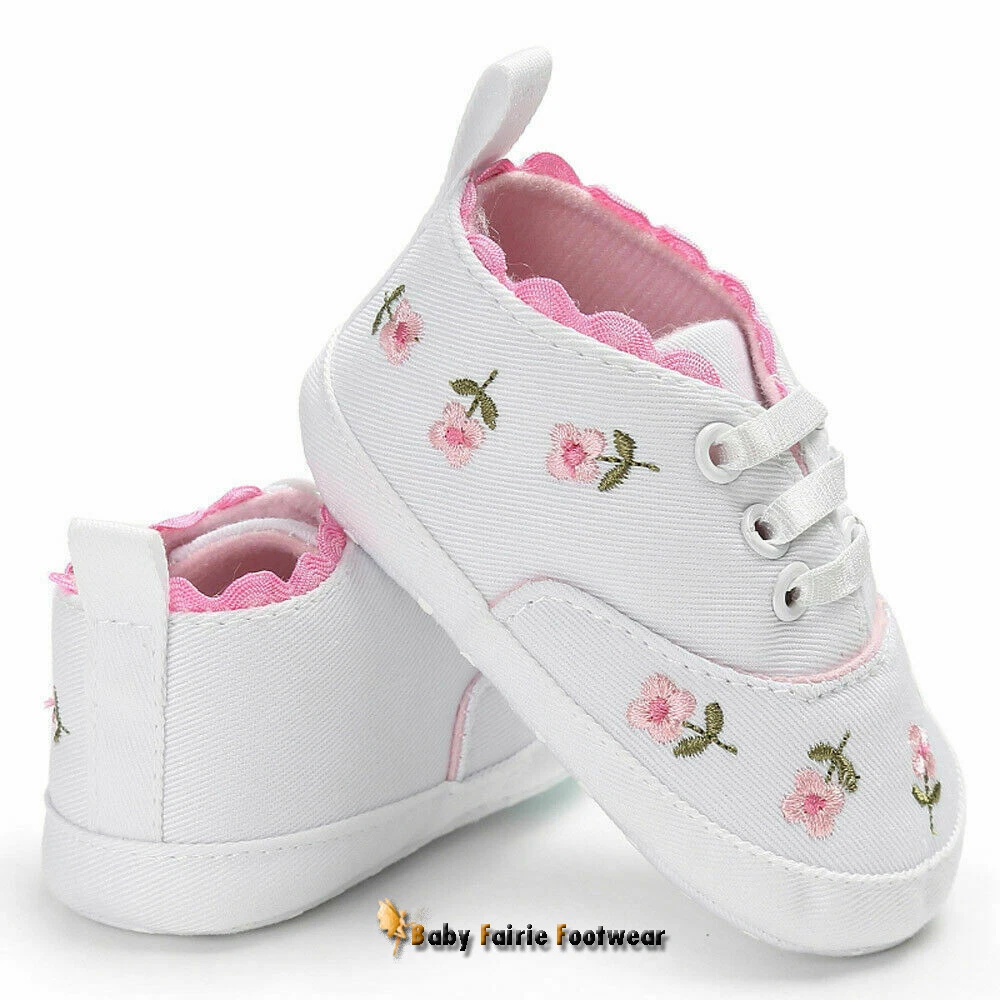 These infant baby girl sneakers are the perfect addition to your little one's wardrobe. The soft sole and elastic band closure make them comfortable for all-day wear while the floral pattern adds a touch of style. These casual shoes are suitable for all seasons and are great for pre-walkers. The cotton fabric lining and upper material keep your baby's feet cozy. CLEARANCE SOLD AS IS. DISCOLORATION ON THE BOTTOM OF THE SHOE.