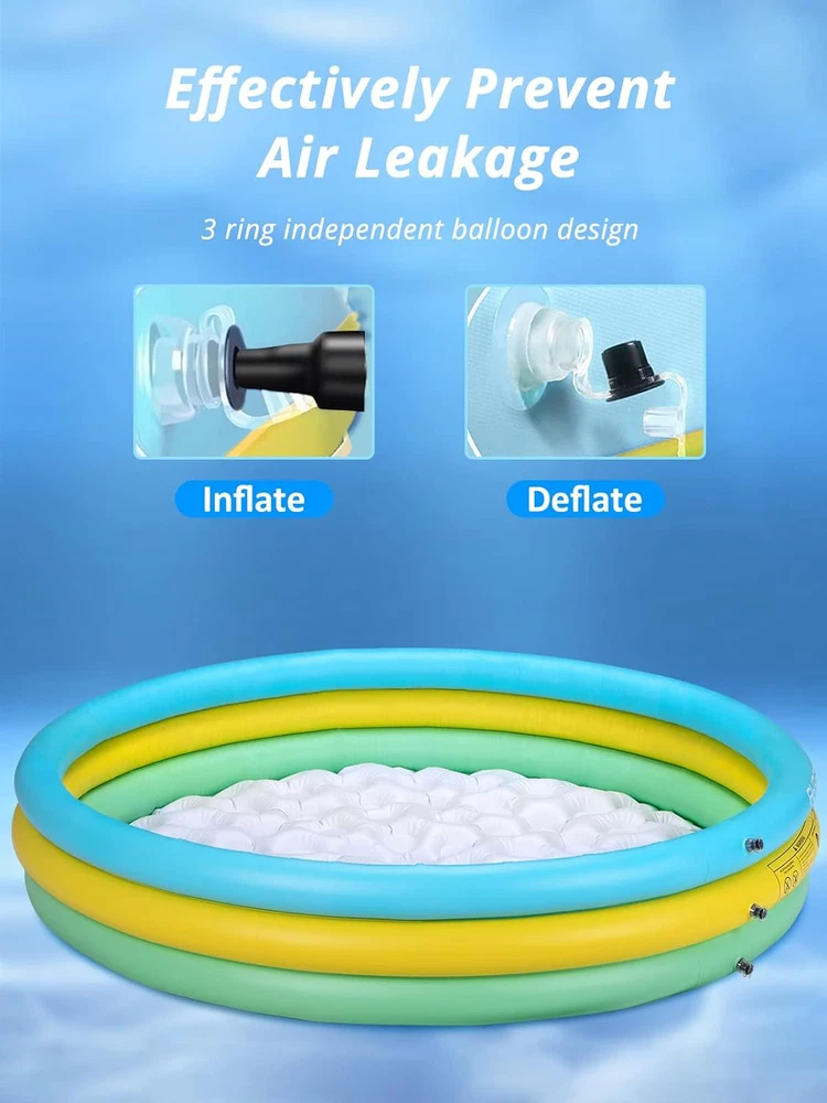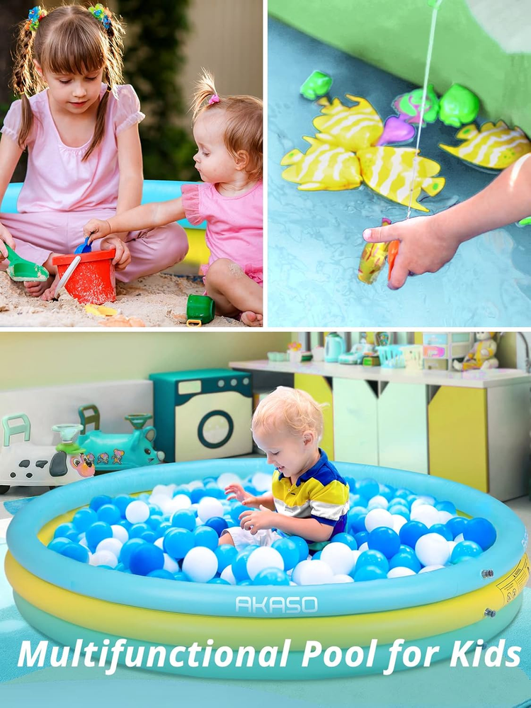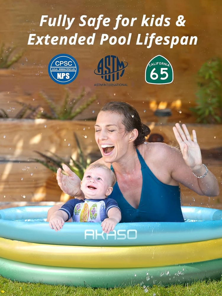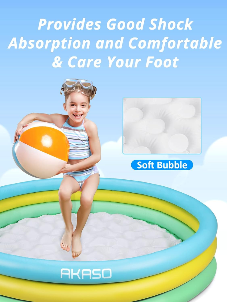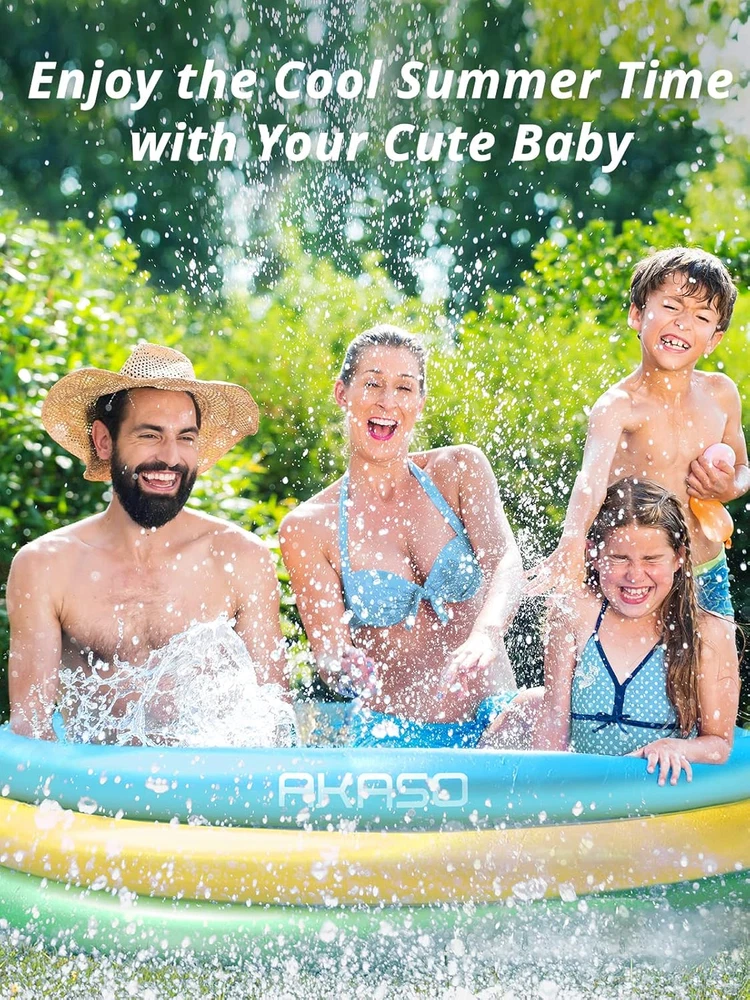 Kiddie Pools, 59'' x 13'', Inflatable Swimming Pools for Boys, Girls, Toddlers, Easy Set Up Inflatable Baby Ball Pit Pool for Ages 2+, Garden, Backyard, Outdoor Summer Water Party Upgraded, High-Quality Material: AKASO Kiddie Swimming Pool is made of high-quality, environmentally friendly, BPA-free, durable, non-toxic (CPSIA, CPC and ASTM certificates) PVC material that meets the international standards of children’s toys. This tough, durable 0.28mm PVC material greatly reduces the risk of punctures and ensures a longer product life. Soft Inflatable Floor: Our swimming pool has a bubble bottom design that provides an air cushion between you and the hard surface beneath the pool. This comfortable floor is non-slip and wear resistant. It provides good shock absorption and a comfortable, safe surface for toddlers to walk on. Parents love the design of this inflatable pool for children. Unique Compartmentalized Design: This kids’ inflatable pool has 3 independent air rings, each with double-layer valves to prevent air leakage. It’s a structurally stable pool that can reliably withstand extra weight. User-friendly Size for Kids: Our high-quality, inflatable, outdoor, deluxe family pool is 59*13inches. It can hold up to 76 gallons of water with room enough for 3 - 4 kids to play in. It’s an ideal choice for helping young learners and swimmers to become independent in the water. Multipurpose Swimming Pool: This inflatable pool is not only for kids and toddlers to swim in, it can also be used as a ball pit or a sandbox for children. You can also use it as a house for your dog, cat, or other small pets. The swimming pool can be used outdoors, indoors, in the house, on a balcony, at the beach, lakeside, etc. Product Description AKASO KIDDIE POOL-Give your kids a fun summer Water Capacity: 287L/76Gal For Age: 2+ Thickness: 50% thicker than others Chambers: Three Manual Trimming Using the manual trimming process, every stitched part is smoothed to leave no sharp edges, in order to avoid scratching the baby's skin. Wide Side Design Inflated, the width of the side wall is 15cm, which can bear a relatively large weight, allowing your child to lean against the inner wall comfortably without collapsing the wall. Leakproof, Double-Layer Air Valve Design Our swimming pool is equipped with 3 independent air chambers, and each one is equipped with a leakproof, double-layer inflation valve to effectively prevent air leakage. Single-layer air leakage will not affect pool use. How to Use Our Inflatable Pool Step 1: There are 3 leakproof, double-layer air valves; each inflatable ring has one valve. Make sure the air valves are facing out. Inflate the rings with an electric air pump beginning with the bottom layer (green) up to the top layer (blue). Step 2: Before filling the pool with water, ensure that the drain valve (at the bottom) is tightly closed. When you are ready to fill the pool, please fill it slowly, and do not fill it above the middle ring to avoid water overflow. Check to see whether the water is level. When filling the pool, do not lean over or squeeze the inflation or deflation valves to avoid injury or water overflow. Step 3: Remove the cap from the drain valve on the bottom of the pool. Avoid draining the water directly onto leaves or watering the same area repeatedly. When the water stops draining, start lifting the pool from the side opposite the drain, so that any remaining water flows to the drain, emptying the pool completely. Finally, release air from the 3 inflation rings and the bottom of the pool. Step 4: Before storage, please be sure that all parts of the pool are completely dry. Air dry the liner in the sun until it’s completely dry before folding. You can sprinkle some talcum powder on the pool to prevent the vinyl from sticking together and to absorb residual moisture. Item model number K1 Product Dimensions 59.05"L x 59.05"W x 13"H Capacity 76 Gallons Assembly Required Yes Color Multicolor Special Feature Inflatable Material Polyvinyl Chloride (PVC) Country of Origin China Occupancy 4 person Item Weight 5.03 pounds Shape Round Manufacturer recommended age 24 months and up Frame Material Polyvinyl Chloride (PVC) Age Range (Description) Kid Target Audience Unisex-Kids Release date January 16, 2021 59.05 "h x 59.05 "h x 13.0 "h. Weight: 5.03 lb Shipping from the USA All of our products are shipped from the USA, ensuring quick delivery to your destination. Payment We offer the following payment methods: PayPal, credit card, bank transfer, and eBay's secure payment system. Free Shipping & Free Returns Shipping within the USA is FREE. Additionally, any return is absolutely free for you. Risk-Free Purchase You have the option to return an item within 30 days without any justification. We cover the return shipping costs! Fast Shipping We ship immediately upon receipt of payment. Generally, the package is delivered within 2-3 days in the USA. If it takes longer, we will contact you. Quality and Costs Made in Europe, USA, China No customs fees or additional charges Total satisfaction guarantee Invoice with declared VAT available upon request in .pdf format Feedback Your feedback is very important to us. After you pay for your purchase, you will automatically receive positive feedback from us.