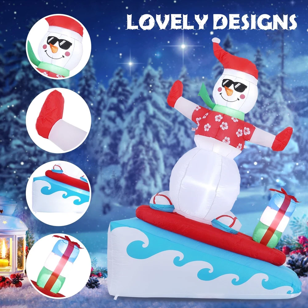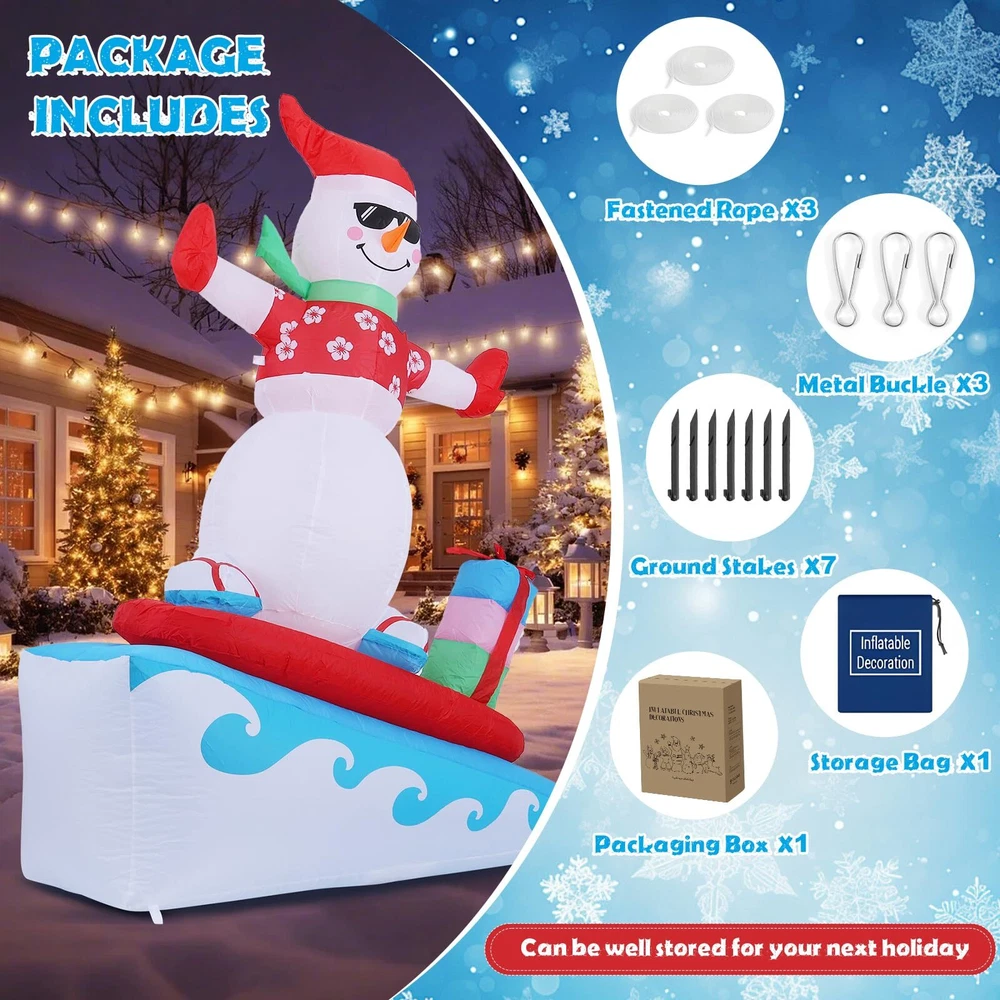 6FT Inflatable Snowman with LED Lights Surfing Snowman Blow Up Yard Decorations Xmas Decorations for Xmas Party Indoor Outdoor Home Garden Lawn Surfing Snowman Inflatable: This 6FT Christmas inflatable outdoor decoration seems to have just returned from surfing in the ocean and brought Christmas presents for you and your family, which will certainly give you, your family and guests a good mood. Your children may also hope to have a cute inflatable friend to accompany them at Christmas. This snowman inflatable is an ideal Christmas gift for kids, its vivid and funny appearance will make them love it at the first sight. Inflatable snowman with LED Lights: The built-in warm white LED lights help this Christmas decorations outside inflatable light up your garden and create a happy and warm Christmas atmosphere in the evening, which will easily catch the eyes of children, neighbors and guests. All of you can dance or talk happily in the warm light forgetting all troubles. Our light up snowman is ideal for both outdoor and indoor family Christmas party decorations to enliven the festival atmosphere. High-quality Inflatable Christmas Decorations: Made of high-quality umbrella cover fabric, this Christmas inflatables snowman can be used without worries in snowy or rainy days. With excellent stitching umbrella fabric, this inflatable christmas ornament won’t be torn apart or fade, and will accompany your family at Christmas next few years. What a perfect inflatable Christmas yard decoration. Christmas outdoor inflatables with Good Stability: There are 1 built-in sndbag, 3 6.6ft ropes and 7 stakes to help to fix the blow up snowman. You can easily install the outdoor snowman on the lawn, in the yard or in the garden. The inflatable snowman outdoor will be firmly fixed on the ground and won’t be blown down by the wind. Just let this Christmas inflatable snowman bring you laughter and joy at Christmas and enjoy a happy and wonderful Christmas party! Fast Inflation and Deflation: The snowman inflatable is quipped with a powerful air blower. Plug in and zip up, you'll see a inflatable snowman in 30s. Unplug and zip up, the snowman blow up can be quickly deflated. The 6.6ft power cord reduces the distance limit of power supply. Just feel free to have a Christmas party in the yard. Putting the Xmas inflatable snowman in front of the door of your store, shopping window will make them more eye-catching and attract more customers. Precautions: 1. Do not cover the surface of the blower during inflation. 2. Keep away from sharp objects. 3. Keep the plug and blower away from water. guarantees to serve you! If you have any questions, suggestions, ideas, please feel free to contact us!