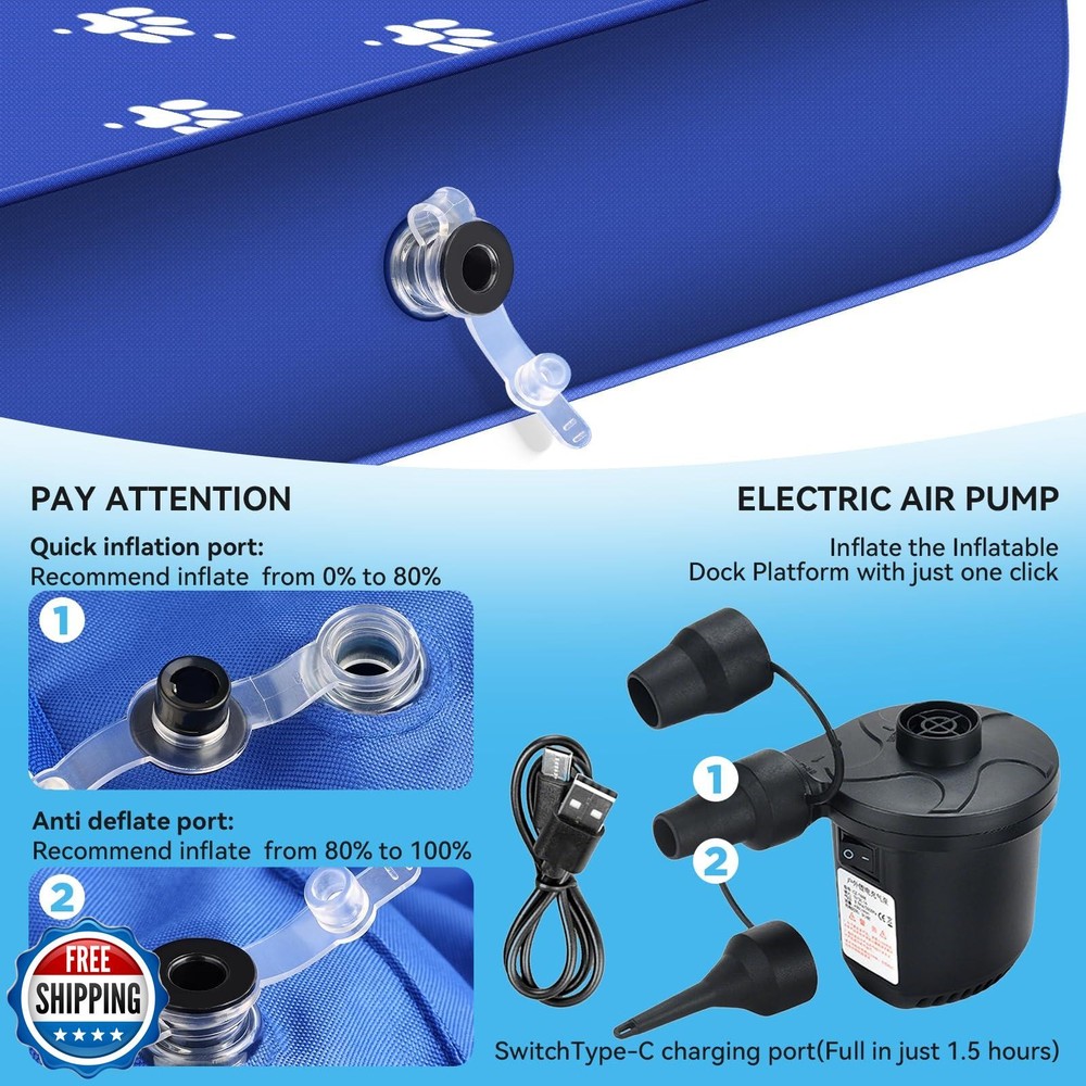 NGNFZQ Inflatable Dock Platform with Electric Pump, Dog Boat Ramp Floating Non-Slip Oxford and PVC with Water Ramp for Dogs Pool, Dock, Lake with Traction Rope Blue (4.7ft x 3ft x 6in) Features [Joint-Support Water Access] - Specially angled ramp reduces stress on hips and joints, allowing puppies to senior dogs to exit water effortlessly. Hydrodynamic grooves stabilize movement - perfect for arthritic dogs or post-surgery recovery [Effortless & Time-Saving Inflation] Say goodbye to tedious manual pumping! Our electric dog float pump inflates most dog floats in just ~2 minutes—2x faster than manual options—so you can spend less time prepping and more time splashing with your pup. Just press start, and watch it fill evenly and quickly. Perfect for busy pet parents, beach days, or lake adventures where every minute counts—get your furry friend water-ready in a flash! [Safety Inflatable Dock Platform] - The surface is made of anti slip Oxford cloth, which helps prevent slipping when climbing in and out of the water surface. Dual non-slip Oxford and PVC entry system combines stabilizing mesh, graduated traction platforms, and low-profile buoyancy control. Ensures confident water entry/exit for dogs of more sizes while preventing ramp displacement [200LBs Loading Capacity] - Engineered with an expanded 4.7 ft long x 3ft wide x 6 in high anti-tip platform, this dog ramp delivers high-grade buoyancy to securely support pets from Chihuahuas to Great Danes (up to 200lbs). Dual-layer Oxford & PVC structure. 17% heavier loads than standard docks - folds to 16"x12" for instant trunk/boat locker storage [Sustainably Usable for Years] - Durable oxford and PVC construction delivers featherlight maneuverability without compromising durability. Features collapsible design with integrated grab handles and compact storage bag – deploy your portable dog marina quickly. Perfect for RV trips or spontaneous beach days [Fully Equipped - 2025 Pro Series] - This inflatable dog ramp for pool comes with a manual pump, 10fT*2 tie-down ropes, and a storage bag. Equip with D-rings anchor securely to docks/boats, great for a variety of water environments. Secure your dog float wherever you go, including pools, boats, marinas, lakes, the ocean and the RV Shipping Free & Fast Shipping: We offer free shipping to most of the USA with a normal delivery time of 3-7 days. However, due to the current situation, additional delivery time (up to 3 weeks) may be required for some items. Alternative Carriers: We may use alternative carriers (e.g., USPS, FedEx, UPS) to ensure your package arrives safely and on time. Due to the use of multiple carriers, we are unable to provide a tracking number automatically. Handling Time: Orders are processed and shipped within 1-2 business days of receiving cleared payment. Shipping Restrictions: Shipping to Alaska, Hawaii, Puerto Rico, Guam, and other US territories may incur shipping charges or delivery restrictions. Please contact us before ordering, or your order can be refunded/cancelled. State Restrictions: Certain items may not be shipped to California due to state regulations. Contact for Tracking Updates: If you require tracking updates or have any concerns about the delivery of your order, please feel free to contact us, and we will be happy to assist you. Return Policy 30-Day Hassle-Free Returns: If you are not completely satisfied with your purchase, you can return the item for free within 30 days of receiving it for a full refund or exchange. Easy Return Process: Contact us, and we will provide you with a prepaid return shipping label and detailed instructions. No Restocking Fee: There are no restocking fees for returns. However, the buyer is responsible for return shipping costs if the return is not due to a seller"s error. Refund Processing: Refunds will be processed within 1 business day of receiving the returned item in its original condition. Feedback Your feedback is extremely important to us. We strive to provide the best products and customer service possible. If you are satisfied with your purchase, please take a moment to leave us a positive review. If you have any concerns or issues with your order, please contact us before leaving negative feedback. We are committed to resolving any problems and ensuring your satisfaction. Contact Us If you have any questions or concerns, please feel free to reach out to our customer support team. You can contact us through the eBay messaging system. We are available Monday to Friday, 9:00 am to 5:00 pm EST, and we will do our best to respond to your inquiry within 24 hours. Thank you for supporting our small family business!