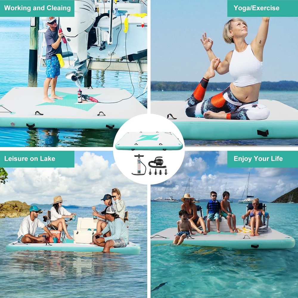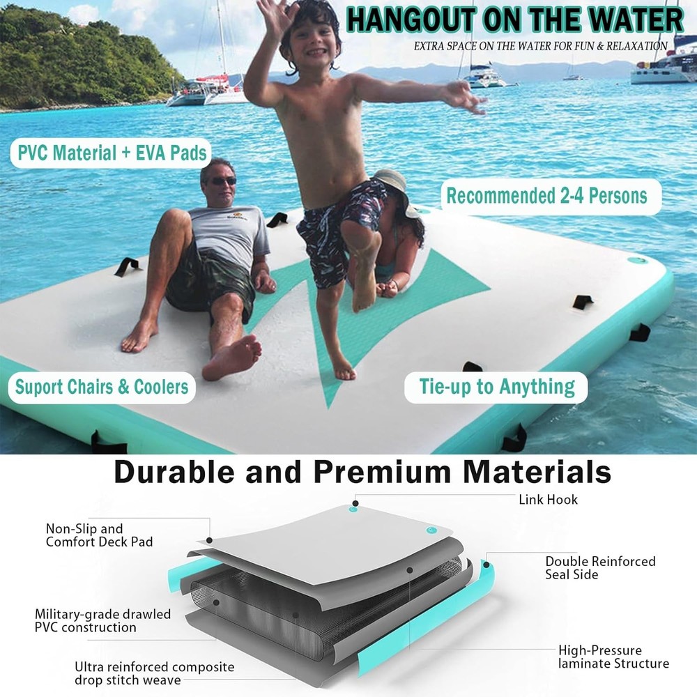 Inflatable Floating Dock Platform, 8'L x 5'W x 6"D, Mint Green Description Inflatable Floating Dock Platform, Floating Island for Lake, 6 inch Thickness, Enlarged & Non-Slip Inflatable Dock with Manual and Electric Air Pump for River, Pool, Beach, Ocean Features: Size: 8‘L x 5'W x 6"D, Weight: 32LB 【Durable/Non-SlipP/Stable】: Super-durable PVC material, double-layered 1.2mm thickness inflatable dock with enlarged and non-slip surface. No-leak after full of air, more stable and safe to protect kids or adults from falling into the water. 【Versatile Usage】: Our 6 inches thick inflatable islands make perfect giant lake inflatables dock , constructed from UV resistant high pressure layered PVC drop stitch. perfect for parties, swimming, yoga, lake lounging, tanning, getting on/off paddle boards, or as a floating deck off a boat. 【Multiple Options】: We provide 5 different size floating docks, that's mean the load capacity of them is different. For example, this floating platform size is 8*5ft, his maximum load capacity is at 500lbs, we recommend up to four adults use it at the same time. 【Thoughtful Design】: The inflatable dock is fitted with six stainless steel D-rings, using safety ropes with alloyed steel hooks to quickly connect the boat/dock; The platform has strong webbing handle on each of sides, easy to grip while in the water, makes it safer for you to play on the water. 【Easy to Operate】We provide a hand pump & an electric air pump to quickly inflate and deflate the dock for you, can use a manual inflatable pump at the beach and an electric inflatable pump at the poolside, bringing convenience to use and saving your time. In addition, the inflatable floating dock also provides a maintenance kit and a storage bag that is easy to store and carry. Product Details: Size: 8'L x 5'W x 6"D Color: Mint Green Brand: ZAFIED Material: Polyvinyl Chloride Product Dimensions: 96"L x 60"W Manufacturer: ZAFIED Weight Limit: 5E+2 Pounds Item Package Dimensions L x W x H: 22 x 15.5 x 9.5 inches Package Weight: 15.88 Kilograms Item Dimensions LxWxH: 96 x 60 x 0.04 inches Brand Name: ZAFIED Country of Origin: China Model Name: FT-8x5 Part Number: ZAF-FT-8x5 Style: 8'Lx5'Wx6"D Included Components: 1 x storage backpack, 1 x inflatable port nut adjuster, 1 x hand pump, 1 x electric air pump, 2 x PVC repair patch, 3 x inflatable adaptor nozzle Outer Material: PVC Sport Type: Boating Skill Level: Advanced Grip Type: Nylon Grip Size: 8'L x 5'W x 6"D Color: Mint Green Brand: ZAFIED Material: Polyvinyl Chloride Product Dimensions: 96"L x 60"W Manufacturer: ZAFIED Weight Limit: 5E+2 Pounds Handling We will ship all orders within 1 business day of payment. Delivery We Do Not Ship Outside of the Continental US. Return Policy All items qualify for returns within 30 days of receipt. Buyer is responsible for return shipping on any item that is not damaged. Feedback We take our reputation seriously, we buy and sell online, so we understand the value of trust. If you are unsatisfied with your order, please contact us and we will work with you to resolve it to your satisfaction.