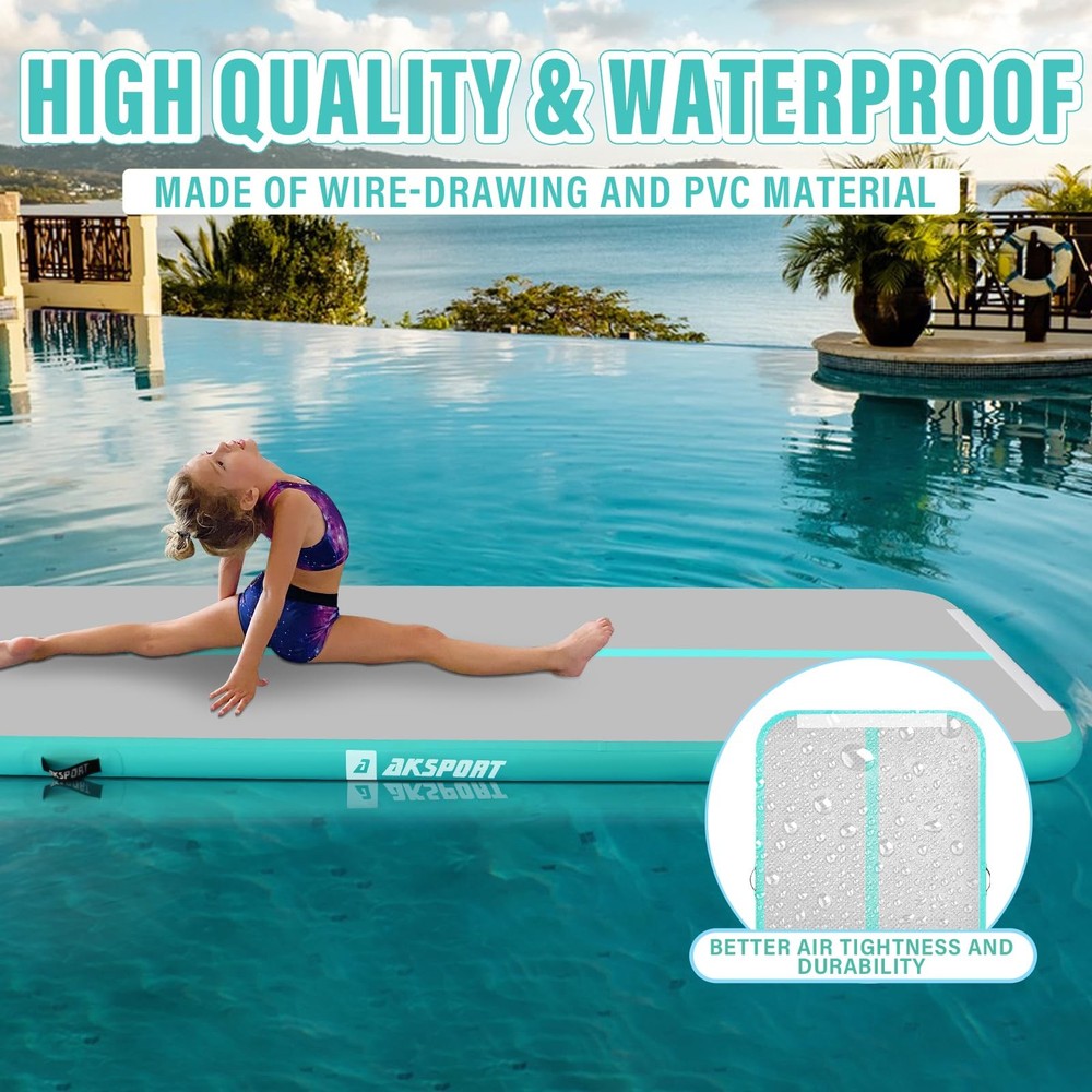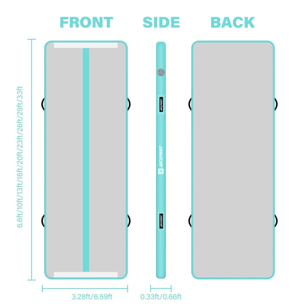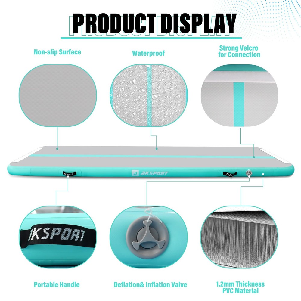 Inflatable Gymnastics Tumbling Mat,Helps Your Training Life More Enjoyful! Multi Sizes and Colors for Choice: 3.28ft-L1xW0.6xH0.1m 10ft-L3xW1xH0.1m 13.12ft-L4xW1xH0.1m 16.4ft-L5xW1xH0.1m 20ft-L6xW1xH0.1m 23ft-L7xW1xH0.1m 26ft-L8xW1xH0.1m 29ft-L9xW1xH0.1m 33ft-L10xW1xH0.1m 36ft-L11xW1xH0.1m 39ft-L12xW1xH0.1m Mint green/Light blue/Pink/Purple/Yellow/Black Features of Gymnastics mat : 1.Set up in your living room, back yard, beach, anywhere,whether indoor or outdoor. 2.Easily portable from gym to gym. The Air Floor is so light and small it will easily fit on the back seat of your car. 3.Inflating and deflating is done in a single minute. 4.You can set the pressure to anything between rock-hard and bouncy-soft. 5.Jumps can be repeated more often with less chance of overuse injuries than on traditional training equipment, martial arts, fitness. 6.Recommended for gymnastics/recreational gym/pre-school gymnastics/cheerleading/ free running/martial arts/elderly gym/fitness ...AND MORE! Electric Air Pump: Voltage 110V Max Pressure: 3.2 PSI / 0.22 BAR Weight:3.08LBs/ 1.4KG Package Include: 1 x Inflatable Air Mat 1 x Air Pump 1 x Carry Bag 1 x Repair Kit(not glue) NOTE: -Make sure there is no fire around or sharp things,whenhave it in use. -If the product damage within 0.3ft, you can use there pair glue and repair film, in the damaged and repair film coated with special glue. ✔【IDEAL GIFTS】Due to the variations in thickness and pressures, air tumbling tracks can be bouncy and safe to land on. It is also the best gift for teenagers to practice gymnastics or tumbling. We provide different sizes for different training demands. Air tumbling track can be connect end-to-end by Velcro connector, which can meet your demand of connecting two different mats together to make it longer. ✔【WIDE APPLICATION & ALL SIZES】Inflatable Air Mat Tumble Track Can be used in the Gymnasium/Home/School/Garden/Backyard Grass/Park/Beach/Pool/Fitness Clubs/Dance Clubs/Gymnastic Training/Yoga/Cheerleading/Exercises/Outdoor Sports.Lots of sizes for choice(Due to manual measurement,please allow 1-3cm difference) ✔【HIGH QUALITY & NON-DEFORMATION】inflatable gymnastic mat is made of 1000D(thicker&stronger) Filament Grade Double-Wall Material (also know as drop stitch material) and 0.9mm high-quality PVC tarpaulin, better air-tightness and durability since reinforcement are made for all seams. It's extremely safe when you using it because this mat is leak-free and it is no smell because high-grade material. ✔【COMPLETE & FAMOUS BRAND ACCESSORIES】You will get one electric air pump,one carry bag and one repair kit(without glue) for free when you purchase air mat.With famous brand valve(BRAVO),just take several minutes to inflate or deflate,and it can protect the inside filament coz the safety device of valve,valve leak-proof function will avoid air leak when you take away the pump nipple.With carry bag, it is convenience to take your gym mat with you. ✔【PROFESSIONAL CUSTOMER SERVICE】 Please feel free to contact us first if you have any questions about the product, we will be responsible for our product