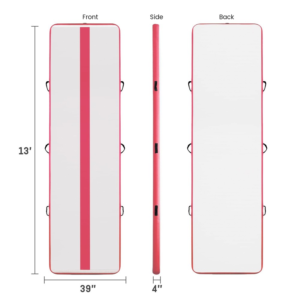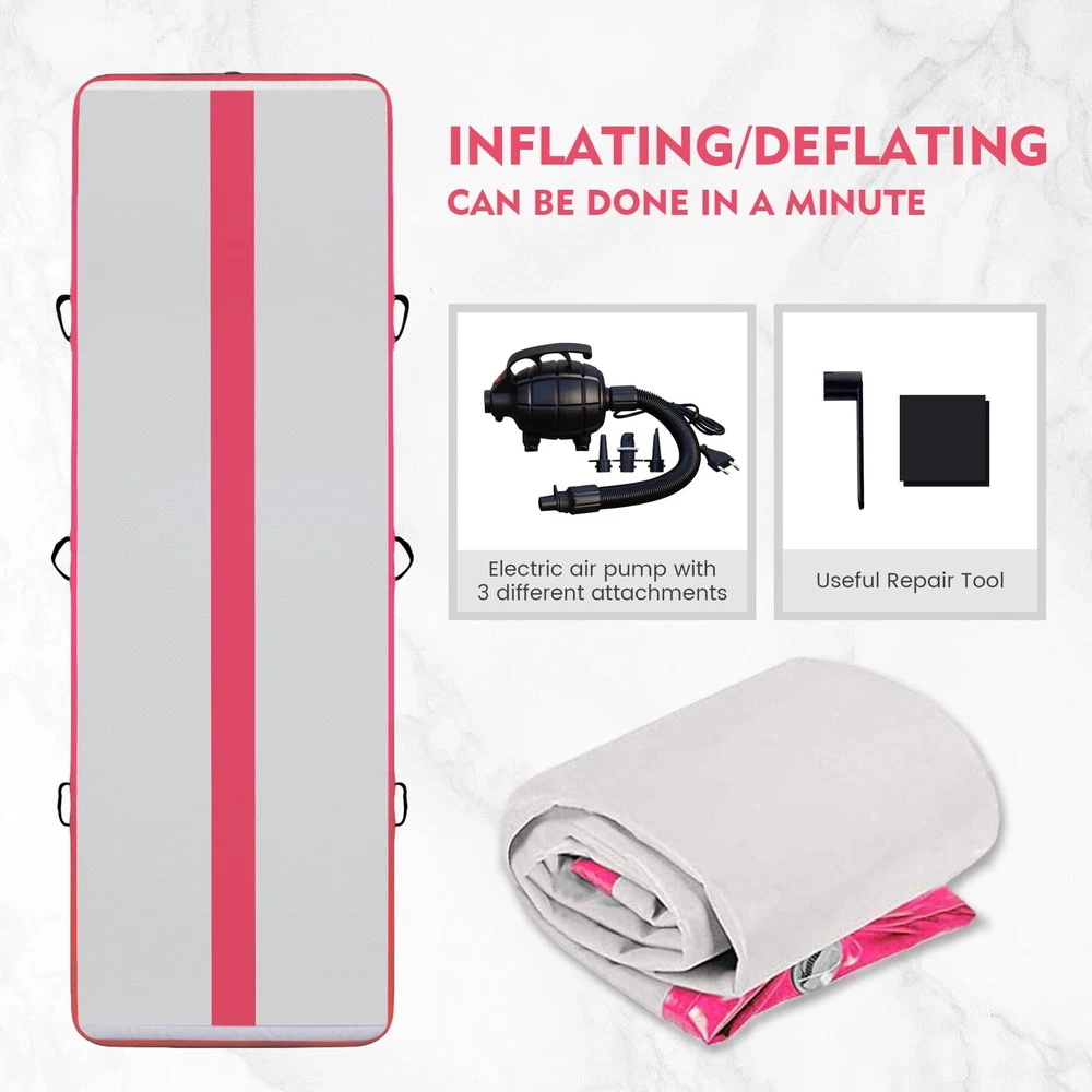 gym home air tumble track, make your gym training easier any where Home-edition gymnastic mat different size: DIFFERENCES WITH THE AIRBOARD The Airfloor is 10-15 cm high, gives more bounce . Features of Gymnastics mat : a. Set up in your living room, back yard, at the beach, anywhere, whether indoor or ourdoor. b. Easily portable from gym to gym. The Air Floor is so light and small it will easily fit on the back seat of your car. c. Inflating and deflating is done in a single minute. d. You can set the pressure to anything between rock-hard and bouncy-soft. e. Jumps can be repeated more often with less chance of overuse injuries than on traditional training equipment, martial arts, elderly gym, fitness ...AND MORE! 1. Air floor 2.Electric pump 3. Handle carry bag 【Skin-friendly and waterproof design】10ft/13ft/20ft inflatable gymnastic mats are made of filament-grade and high-quality PVC tarpaulin, which has better air tightness and durability due to the reinforcement of all seams. Compared to other sports equipment, gymnastic air cushions increase repetition frequency and reduce the chance of injury. Its 100% waterproof design can be used in swimming pools. 【Wide application 】 You can place the air floor on the artistic gymnastics floor,the gym floor, in high-performance training, fitness clubs,dance clubs, schools,gymnastic exercises,home entertainment, leisure centers, gymnasium, professional training, park or rental business. Also, it could be used on beach or water,backyard, grass land. 【Easy to store】The inflatable air tumbling mats can be fold and unfold quickly, optimum air pressure in all conditions, up to 5psi.Compared with the traditional foam-based mats, they take up much less space after deflating so the storage and transportation become pretty simple and economic. The electric air pump makes inflate easier. 【Package including 】Mat, backpack, grenade pump. 【Warranty】All air tumbling mat are backed by our 30-Day money back guarantee and 1 year product replacement warranty.