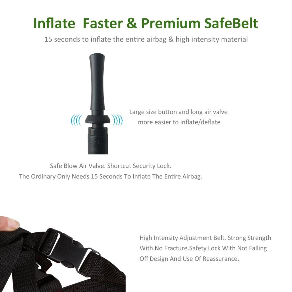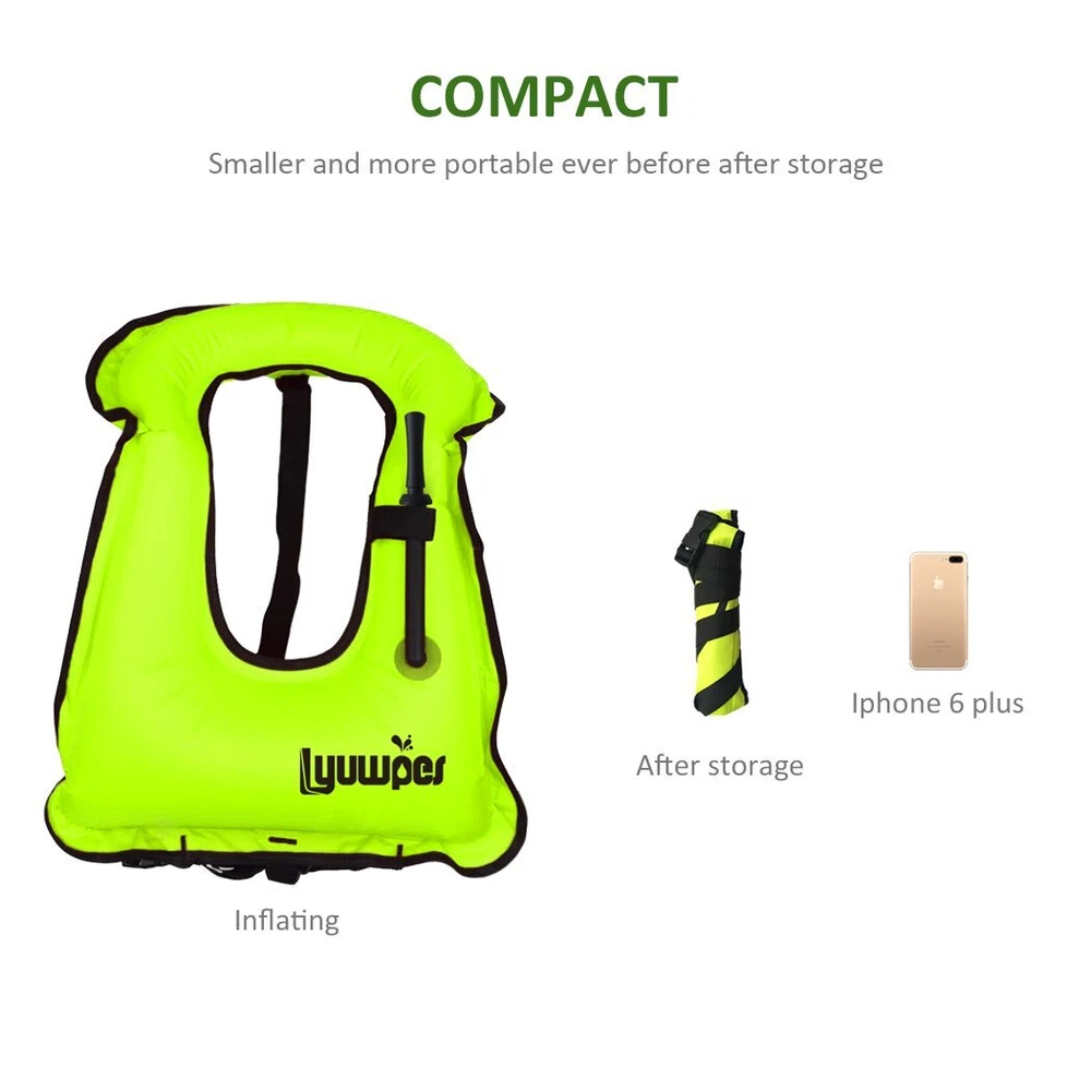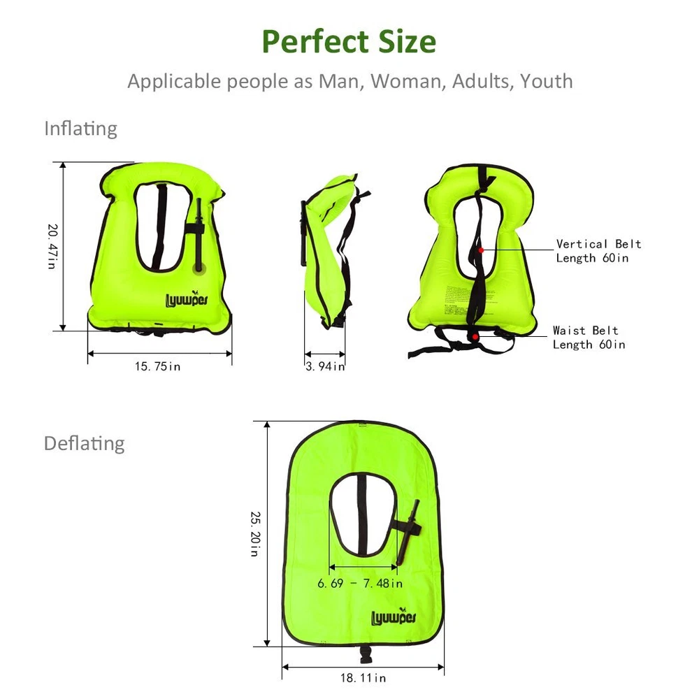 How to wear: 1.Loosen the straps to make them bigger; 2.Put your head through the hole and the crotch strap falls behind you; 3.Find the waist strap and bring it around you, secure the male buckle to the corresponding female buckle, do the same as the crotch strap; 4.Adjust the straps length to your most comfort; 5.Press down the air valve to inflate or deflate the air and when loosening your fingers, the valve will automatically lock the air in. What is the purpose: To ensure the water safety and prevent accidental events. To elevate your confidence and self-reliance in the water. Warm Tips: 1.Before the purchase, check the size chart carefully; 2.Why there is a crotch strap rather than leg strap and mesh fabric on the back? Because our goal is to maximize your exploration passion and challenge potential by wearing a diving suit without fear of direct sunlight on your back; on the contrary, leg straps can restrict your foot movements, if the size of them is not suitable, it may even strangle the skin of the thighs; alternatively, due to uncoordinated leg posture, the leg straps may break easily; and furthermore, like some styles, they rely solely on waist straps, it is difficult to control and balance the vest to ride up or slip away under the push of water waves, and it may even compress your chest until you feel suffocated and chocked. So, we apply the crotch strap, and it can effectively solve these obvious problems; 3.Do remember not to adjust the straps too loosely or too tightly. Wearing it with a wetsuits can achieve much superior comfort; 4.To grip tightly along the valve to inflate or deflate and do not shake it vigorously to avoid damaging the internal press mechanism; 5.Do remember not to inflate excessively, otherwise you will be afloat on the water rather than stay face down to snorkel. Proper buoyancy can meet your best snorkeling experience. Snorkeling Vest: small footprint, large buoyancy (from 80 to 220 lbs) while snorkeling; fluorescence colors provide excellent visibility, great for learners & swimmers Fast Inflation, Fast Deflation: snorkel vest supports the body, just right fully inflated without the need of excess air, convenient mouthpiece location Horse Collar Style Over The Neck: all snorkel vests and zippered jackets on the market adopt this design style, simple to put on and take off, very comfortable without skin abrasions, fitting well for most adults (not all adults) Adjustable Waist & Crotch Straps: latch straps vertically and horizontally, providing a secure and worry free, easy pinch buckles for fast removal Flexible, Lightweight & Compact: easy to pack, a little smart companion for journey (bonus mesh bag included) Proper Use & Warm Warning: inflatable snorkeling vest is not certified as a professional life jacket or life preserver and is just designed for leisure and other low-impact water activities. Prior to each use safe, take a test to make sure inflatable snorkel vest is inflated and deflated properly. In short, the buddy rule, never swim alone and always remember that do not rush to use it anywhere and anytime.