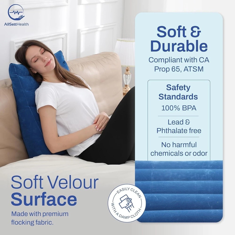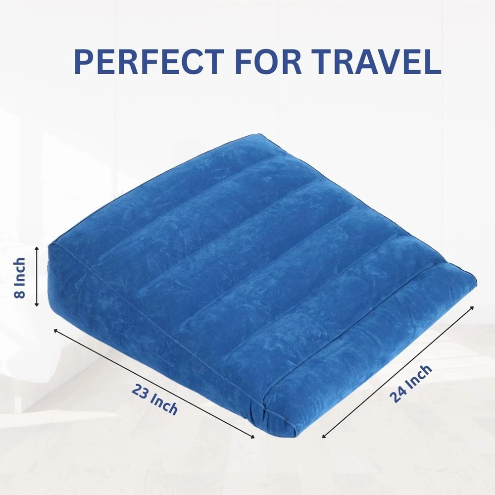 Multiused Wedge Pillow: When blowing up the inflatable wedge pillow, it assumes a triangular shape that offers a nice surface on which to support. That makes the inflatable wedge good enough for your relaxation. It lends appropriate support to your neck, knees, and back whether lying down or sitting. Alleviates a Wide Range of Problems: It's so versatile that you can use the inflatable wedge pillow in multiple ways. Moreover, the inflatable bed wedge has so many health benefits. Assists with symptoms of acid reflux, heartburn, Gerd, snoring, pregnancy, back pain, muscle aches, and more. Premium Material: The inflatable pillow wedge is made with a soft-flocked surface, it's comfortable to use as a backrest when reading or watching TV. No harmful chemicals or odor. Moreover, its premium quality material makes it very durable. Lightweight & Convenient: this wedge pillow is portable and weighs less than 1 pound with the dimensions of 21″x23″x7″when fully inflated. And comes with a great carry bag. Perfect for travelers or home use.