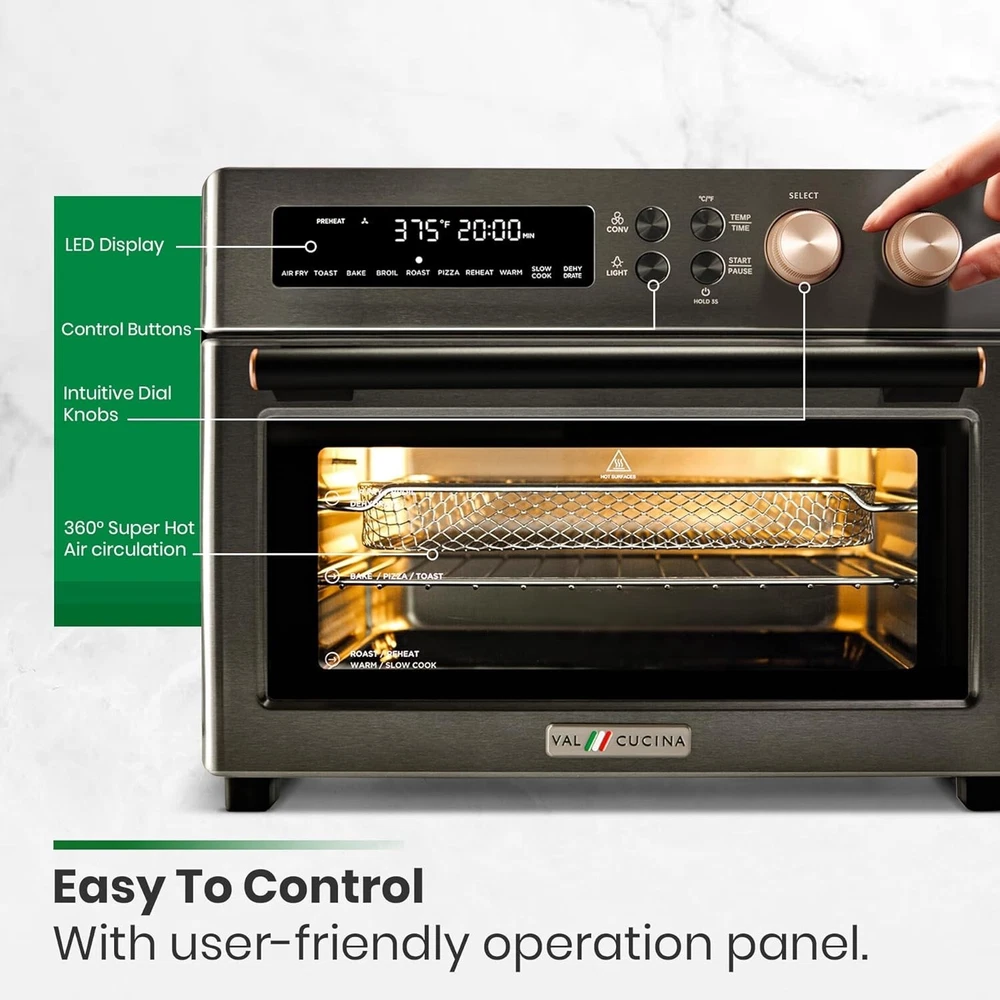Infrared Heating Air Fryer Toaster Oven, Extra Large Countertop Convection Oven 10-in-1 Combo, 6-Slice Toast, Enamel Baking Pan Easy Clean with Recipe Book, Black Matte Stainless Steel [INFRARED HEATING + TRUE CONVECTION AIR FRY] Our cutting-edge technology features a powerful and effective heat radiation system, coupled with a high-velocity heated-air circulation, which results in a quick and deliciously flavorful brown crust while preventing food from becoming overcooked or dried out. It ensures that the interior of food remains tender and juicy, stays succulent and moist up to 35%, providing a perfect balance of texture and taste. [SUPER VERSATILE “10-in-1” AIR FRYER CONVECTION TOASTER OVEN] Unlike typical air fryer or oven with a single function, we take it up a notch by offering 10 preset digital functions that include Air Fry, Toast, Bake, Broil, Roast, Reheat, Warm, Slow Cook, and Dehydrate. This versatile 10-in-1 combination allows you to prepare a variety of dishes with ease and convenience, making your cooking experience more enjoyable than ever before. [FAMILY & PARTY SIZE CAPACITY] stands out on the market with a 30%-60% larger capacity. You can easily roast a 5-6lb chicken, toast 6 slices of bread, cook a large batch of French fries, 20 chicken wings, or bake a 12-inch pizza, all in one go. This larger capacity is perfect for families, entertaining, or meal prepping, making it a versatile and essential addition to any kitchen [CRUNCHY and HEALTHY COOKING EXPERIENCE]Our Air Fry feature is a healthier alternative to traditional frying, reducing fat by up to 75%. Enjoy all your favorite foods guilt-free, including deep-fried favorites like fries. With intensive and efficient infrared heating combined with true convection, our air fryer toaster oven delivers perfectly crispy and golden results every time. This delivers an exquisite blend of texture and flavor, ensuring a superb culinary experience. [FAST, SAFE & EASY to USE] With 1750W of power and six heating elements, the Air Fryer toaster oven cooks 40% faster than traditional ovens. The even distribution of heat reduces preheating time by up to 30%, saving your valuable time in the kitchen. Our user-friendly digital display and analogue controls make cooking effortless and enjoyable. countertop oven boasts a variety of accessories: an Enamel Baking Tray, Wire Rack, Air Fryer Basket, Crumb Tray.