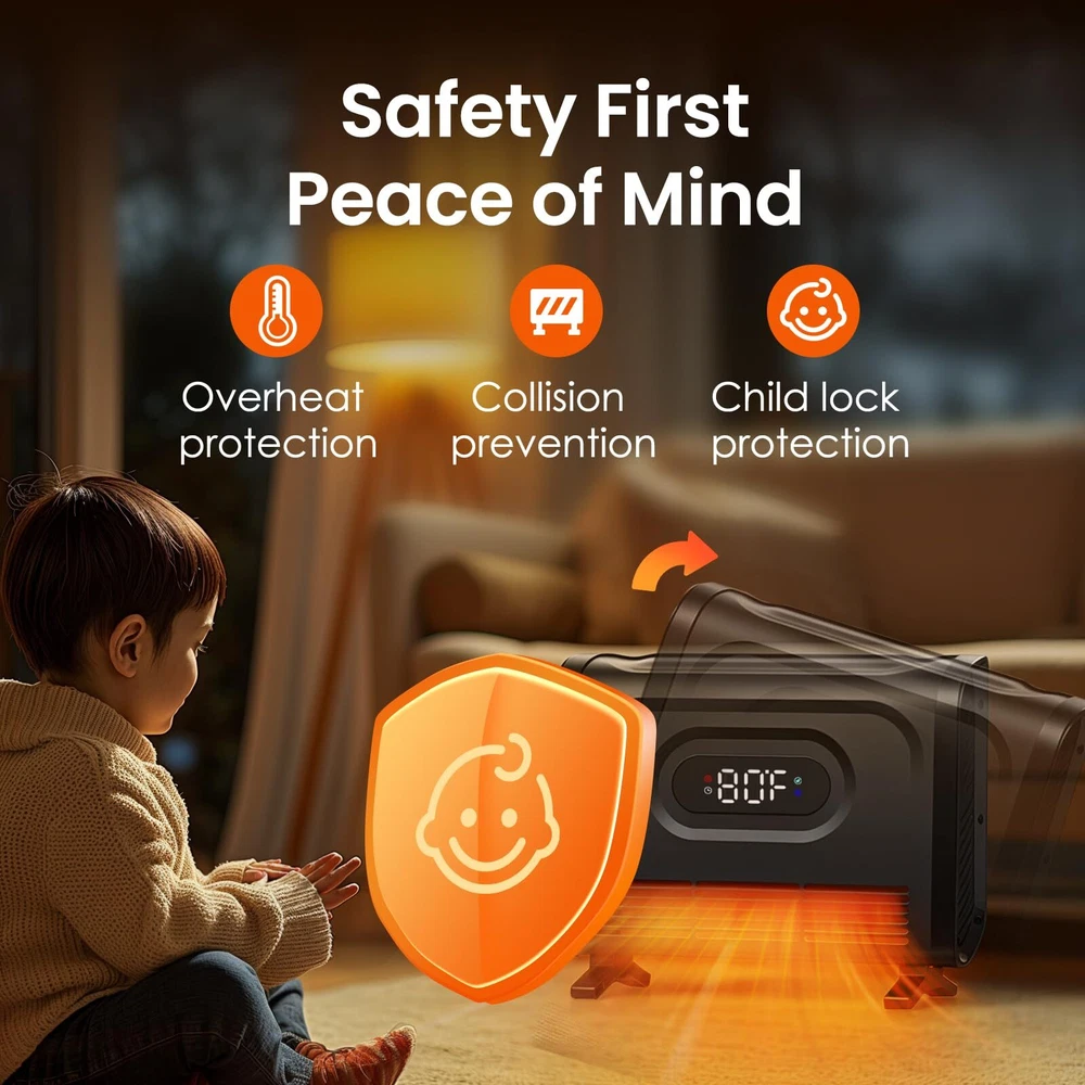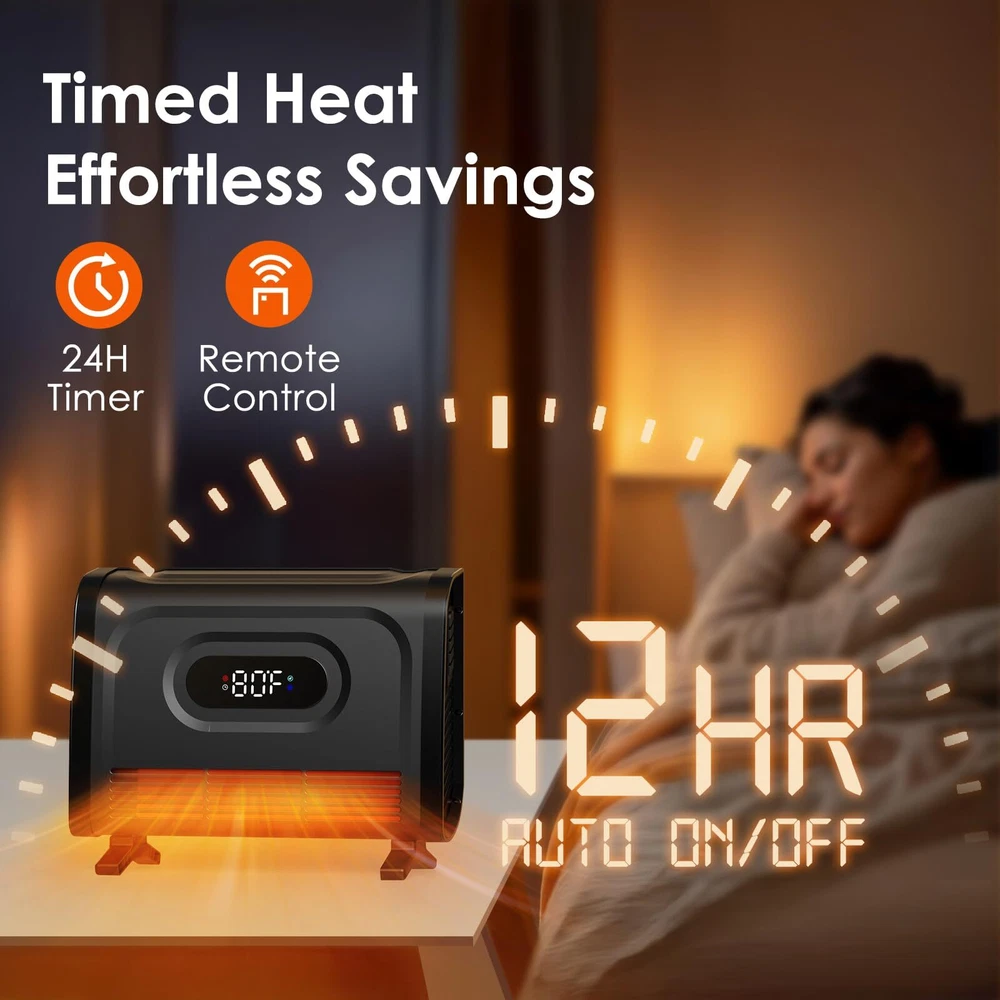 Quick & Efficient Heating: The 1500W space heater quickly warms rooms up to 160 sq. ft., using a built-in turbofan and quartz tube for even, rapid heat distribution. Its compact design includes a convenient handle for easy portability, delivering warmth without taking up extra space Versatile 2-in-1 Design: Whether mounted on the wall to save space or used freestanding with the included base, this electric heater offers flexible placement options. Installation is quick and hassle-free, making it ideal for bathrooms, garages, basements, or offices during colder months Customizable Comfort: Choose from 3 heat settings (low, medium, high) and a fan-only mode to suit your needs. The adjustable thermostat lets you fine-tune temperatures in 1°F increments, from 59°F to 86°F, ensuring the perfect level of warmth User-Friendly Controls: The large, clear LED display makes it easy to monitor and adjust settings from across the room. With the included remote control, you can easily change settings without leaving the couch or bed, providing ultimate convenience at your fingertips Enhanced Safety Features: Stay comfortable with peace of mind, thanks to built-in safety features like tip-over and overheat protection, as well as a child lock. This electric heater ensures a secure, worry-free experience for your whole family