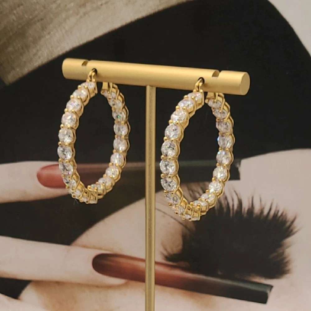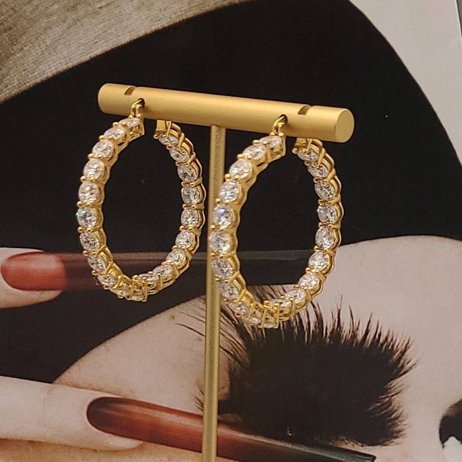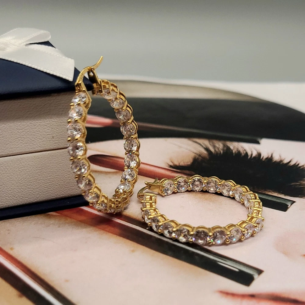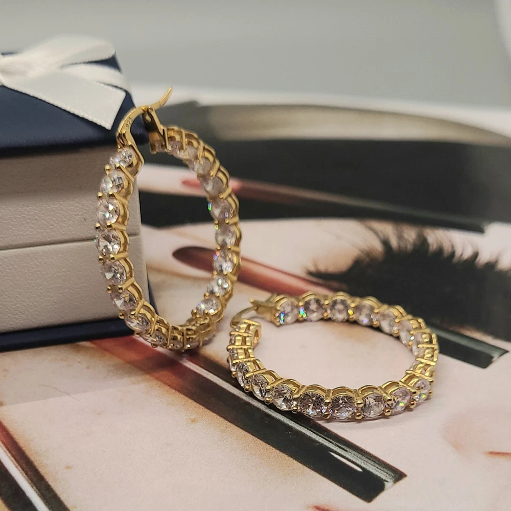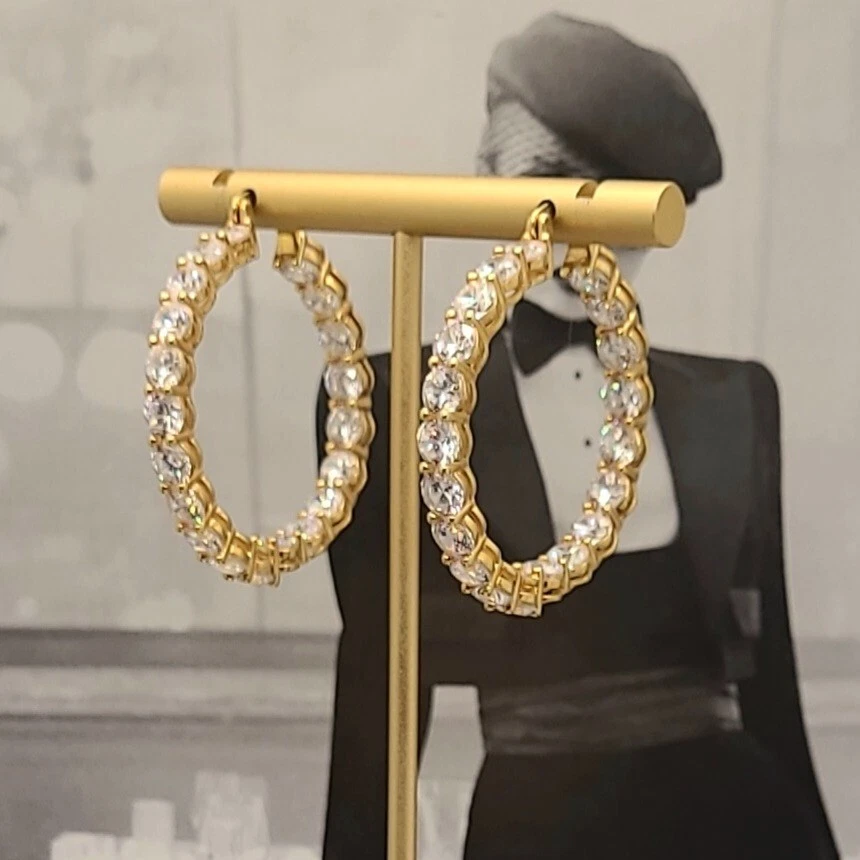 Add a touch of elegance to your look with these stunning hoop earrings. Crafted from 14K gold over sterling silver, these earrings feature lab-created simulated diamonds with a prong setting. The earrings are designed in a hoop style with a secure lock back closure, making them perfect for any occasion like Christmas, anniversary or birthday. The white/colorless simulated diamond adds a touch of beauty to the earrings, making them perfect for the lobe area. The earrings are 2 inches in length and are part of the Sterling brand. Give yourself a gift of beauty with these Inside Outside 23.20CTW Diamond Hoop Earrings.