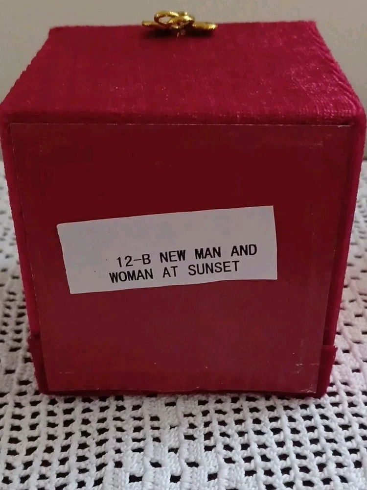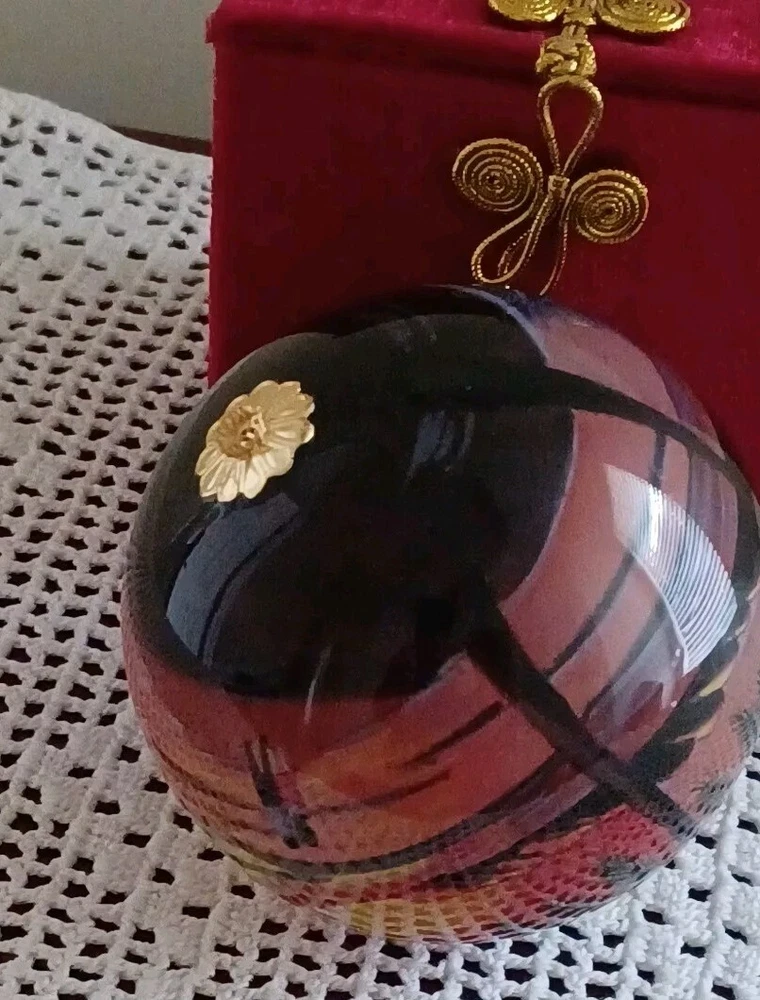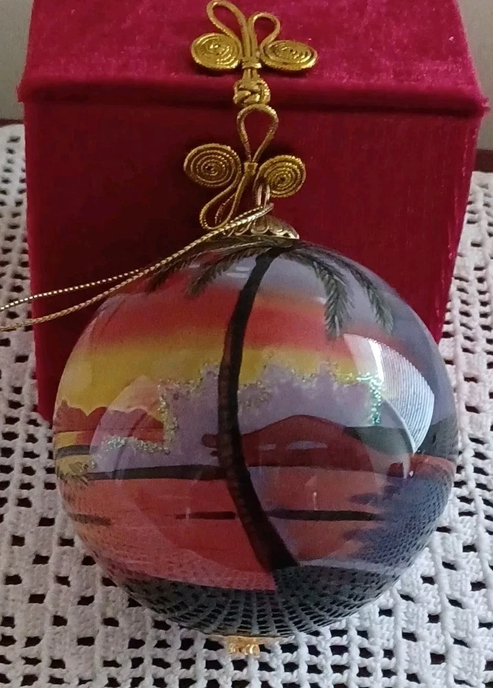 Beautiful inside painted round hand blown glass ornament. Design features an adult couple on the beach, palm trees, an amazing sunset, and mountains. Small area of glue next to the gold accent is somewhat noticeable. Red velvet box is included. Please review the pictures and reach out with questions