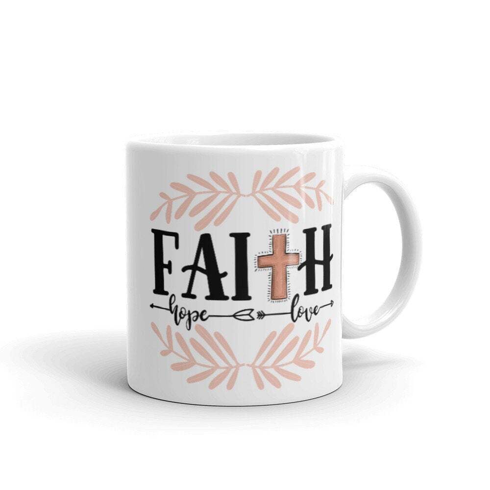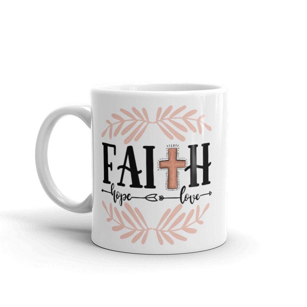 Faith Hope Love Christian Mug Religious Mug Jesus Inspirational Mug Product Details.. This high quality 11oz. ceramic white mug has a premium hard coat that provides crisp and vibrant color reproduction sure to last for years. Perfect for all hot & cold beverages. The highest quality printing possible is used. It will never fade no matter how many times you wash it. Material: 100% Ceramic. Print both sides. Dishwasher and Microwave Safe. High Gloss + Premium White Finish. Printed in the U.S.A. Personalized & Custom. We support personalized and custom mug to add custom, when placing an order, you can add notes to the "order note" in shipping address section. Also you can contact us directly via message. Shipping Info. Ready to ship in 1 to 2 business days, All products are made-to-order and proudly printed in the United States. Shipped by USPS and DHL, You will receive your order in 5-7 days. Replace & Refund. All products are defective during shipping broken, chipped will be replaced free of charge. You are not satisfied with the product, we will refund 100% money to you. If any other issues arise, please do not hesitate to message, we would be more than happy to assist you.