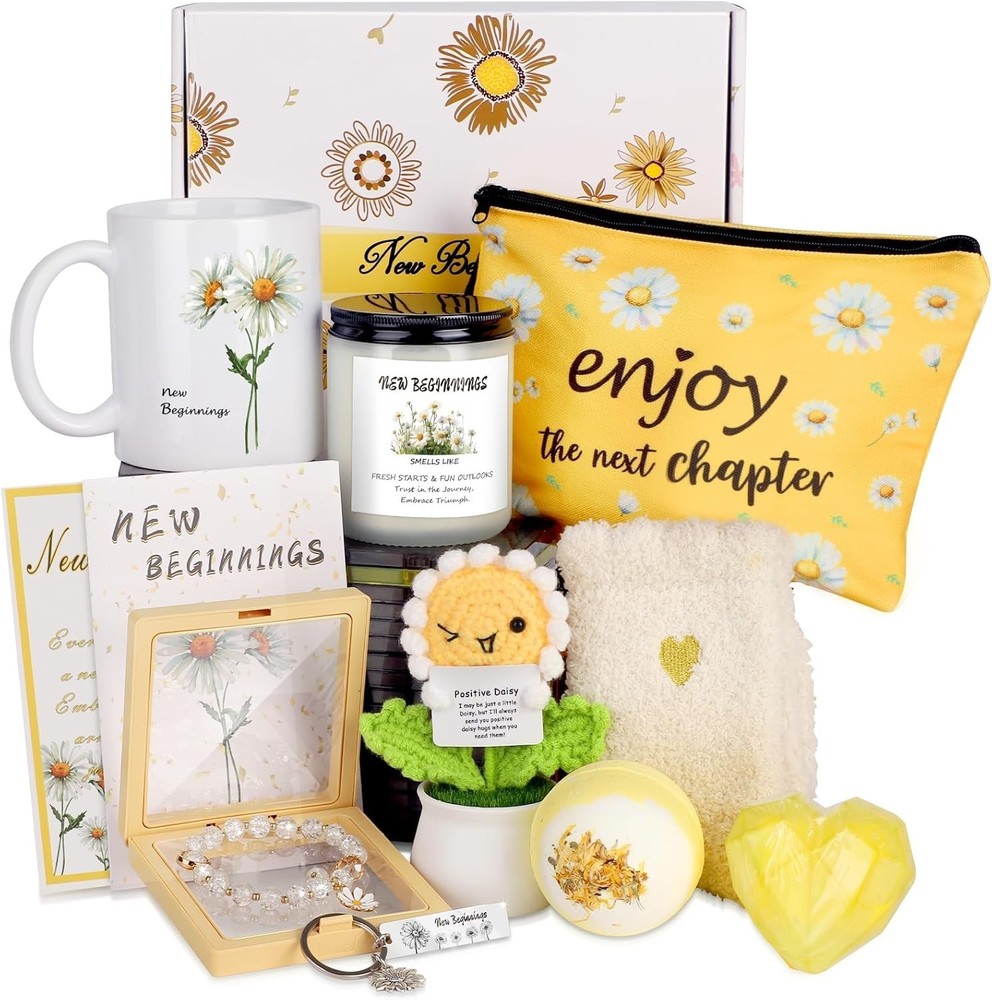 Inspirational Daisy Gift Basket - Candle, Keychain, Bracelet ‹ › ‹ › ‹ › ‹ › ‹ › ‹ › ‹ › ‹ › ‹ › Inspirational Daisy Gift Basket Heartwarming Daisy Gift Box - Surprise your loved ones with the New Beginnings Gift Basket, filled with hope and charm. This exquisite gift basket includes: Natural soy candle Elegant coffee mug Daisy bracelet Charming keychain Cosmetic bag Crochet flower daisies Cozy socks Bath salt bomb Diamond soap Greeting card and poetry card Perfect for Celebrating New Starts Imagine the joy on their faces as they unwrap this beautifully crafted Daisy Gift Box. A soothing scented candle and charming daisy keychain bring warmth and inspiration, making it ideal for: College graduations New job celebrations Housewarming gifts Farewell gifts for coworkers Relaxation gifts for women Thoughtful and Uplifting Gifts Brighten someone's day with the New Beginnings Gift Box. Inside, they’ll find a comforting bath salt bomb, cozy socks, and a crystal daisy bracelet, all designed to uplift and inspire. The lovely daisy theme and "new beginnings" message make it a heartfelt gift for any transition. Perfect for Life’s Transitions From the elegant ceramic mug to the positive knitted daisy flowers, each item is thoughtfully chosen to bring joy. This gift box is perfect for life's significant transitions: New jobs Breakups Divorces Co-worker departures Job promotions A Versatile Gifting Solution Suitable for various life transitions, the Positive Energy Daisy Gifts is perfect for: Going away gifts Inspirational gifts for women Funny coworker goodbye gifts Wishing someone good luck This thoughtful gesture is ideal for parents, hostesses, brides, sisters, best friends, bosses, coworkers, and loved ones. Each item radiates positivity and joy, making every new chapter in life special. Embrace New Beginnings With our daisy-themed gifts, you can celebrate every cherished moment with love and joy, reminding your loved ones that every ending is a new beginning! Shipping Free & Fast Shipping - We offer free shipping to most of the USA with a normal delivery time of 3-10 business days. However, due to various situations, additional delivery time (up to 3 weeks) may be required for some items. Alternative Carriers - We may use alternative carriers (e.g. USPS, FedEx, UPS, etc.) to ensure your package arrives safely and on time. Due to the use of multiple carriers, we are unable to provide a tracking number automatically. Handling Time - Orders are processed and shipped within 1-5 business days of receiving cleared payment. Shipping Restrictions - Shipping to Alaska, Hawaii, Puerto Rico, Guam, and other US territories may incur shipping charges or delivery restrictions. Please contact us before ordering, or your order can be refunded/cancelled. State Restrictions - There may be restrictions based on your state of purchase. For example, certain items may not be shipped to California due to state regulations. Contact for Tracking Updates - If you require tracking updates or have any concerns about the delivery of your order, please feel free to contact us, and we will be happy to assist you. Return 30-Day Hassle-Free Returns - We want you to be completely satisfied with your purchase. If you are not, you can return the item within 30 days of receiving it for a full refund or exchange. Easy Return Process - To start a return, simply contact us and we will provide you with a prepaid return shipping label and detailed instructions. Restocking Fee - There are no restocking fees for returns. However, the buyer is responsible for return shipping costs if the return is not due to a seller's error. Refund Processing Time - Refunds will be processed within 5 business days of receiving the returned item in its condition. Payment We accept all major credit cards, PayPal, and Apple Pay for your convenience. Your payment information is secure and encrypted to ensure a safe and seamless transaction. Please complete your payment within 3 days of purchase to avoid any delays in shipping. Feedback Your feedback is extremely important to us. We strive to provide the best products and customer service possible. If you are satisfied with your purchase, please take a moment to leave us a positive review. If you have any concerns or issues with your order, please contact us before leaving negative feedback. We are committed to resolving any problems and ensuring your satisfaction. Contact Us If you have any questions or concerns, please feel free to out to our customer support team. You can contact us through the eBay messaging system. We are available Monday to Friday, 9:00 am to 5:00 pm EST, and we will do our best to respond to your inquiry within 24 hours. Buy it now and enjoy a pleasant shopping experience! Unit Quantity: 2.83 pounds Material: Plastic,soy wax,ceramic,cotton,paper,metal Type: Gift Box Size: Medium Number of Items: 1 Color: Yellow Occasion: Graduation Recipient: Multipurpose Origin: California Shape: Round Style: Glam