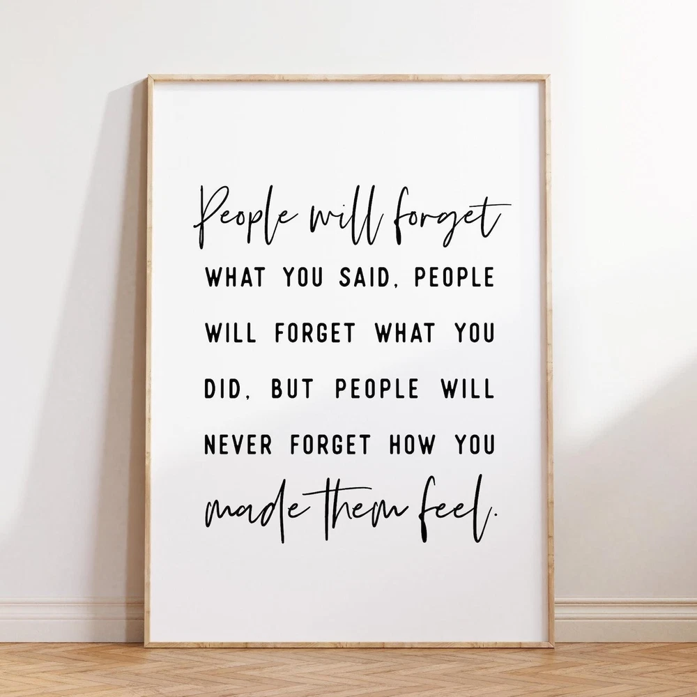 Inspirational Quotes Poster Printable Motivational Wall Art Maya Angelou People Will Never Forget Quote Print Art Material: Premium luster photo paper Print type: Inkjet printing One side printed + The finish provides the highest possible resolution and color saturation + Lasts up to 200 years in color and 400 years in black-and-white + Printed on high-quality resin-coated photo base paper medium + Posters can be hung with double-sided tape, tacks, or framed + Hand washing with a gentle cry cloth is recommended for extended durability I will hand select the best choice of paper for your chosen design to ensure top quality results for a beautiful, bright and luxurious print. All prints are sealed in cellophane slips for protection during transportation, and are shipped in a protective cardboard envelope.