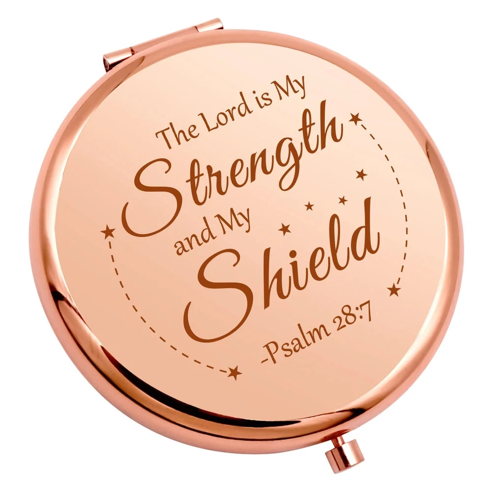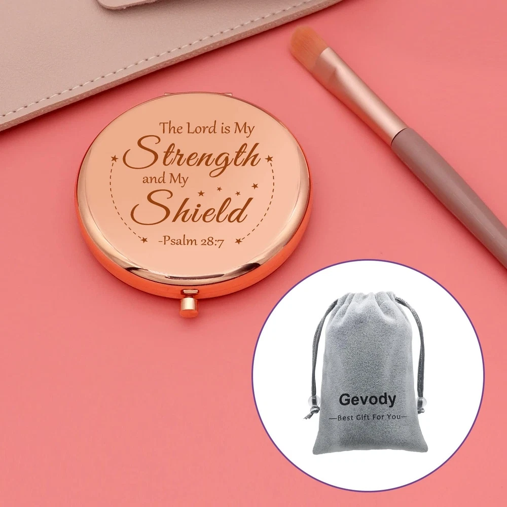 Inspirational Religious Gifts Compact Makeup Mirror Pocket Makeup Mirror Christian Gift for Women Encouragement Gift Bible Verse Gifts Baptism Gifts Graduation Christmas Thanksgiving Birthday Gifts Product Details Color: Rose Gold Brand: Gevody MPN: Gevody-00350 UPC: Does not apply EAN: Does not apply Brand: Gevody Shape: Round Product Dimensions: 2.6"L x 2.6"W Frame Material: Stainless Steel Style: Compact Brand: Gevody Shape: Round Product Dimensions: 2.6"L x 2.6"W Frame Material: Stainless Steel Style: Compact Mounting Type: Tabletop Mount Special Feature: Portable, Lightweight Color: Rose Gold Theme: Christmas,Graduation,Religious,Thanksgiving,Wedding Specific Uses For Product: [INFERS] Religious events, personal use, travel, gift-giving Number of Pieces: 1 Number of Items: 1 Material: Stainless Steel Frame Type: Framed Assembly Required: No Frame Color: Rose gold Manufacturer: Gevody-00350 Item Weight: 1.13 ounces Country of Origin: China Date First Available: May 22, 2022 Christian Gifts for Women:Personal Makeup Mirror engraved withThe Lord is My Strength and My Shield-Psalm 28:7This word is inspiring and comforting, will encourage you. Makes a Christian gift for Birthday, Graduation,Wedding, Christmas, Thanksgiving,Valentine,Mothers Day,congratulations,graduation. Inspirational Gifts for Women:Inspirational Bible Verse Gifts for daughter, granddaughter,sister,cousin,wife,girlfriend,aunt,Godmother,Goddaughter,women and girls,express your love and support for her.A reminder of strength is important at a difficult time.You can do all things through religious who strengthens me. To My Goddaughter Gifts Double-Sided Round Mirror:1 side is a standard mirror help you make sure that your lipstick, eyeliner and hair are in perfect condition and the other side is a magnifying mirror an exceptionally clear image without distortion, Make sure the girl is getting the perfect look, and also allow her to check the tiniest details of your makeup,Ideal for daily use. Easter Gifts Portable Compact Makeup Mirror:This Folding Mirror is designed to be easily carried around. Mini size 2.6 inch/65mm , This folding mirror is light weight and very compact, perfect for multi-purses and travel. Easily fits into your pocket, purse, handbag, cosmetic bag so that you can makeup anytime, anywhere. Bible Verse Gifts for Women:Bible verse gifts packed in elegant velvet bag, and ready for gift giving.Special design for encouragement gift for her,fabulous bible verse present for girls,perfect inspirational gift for women.Give her faith to face all the difficulty.