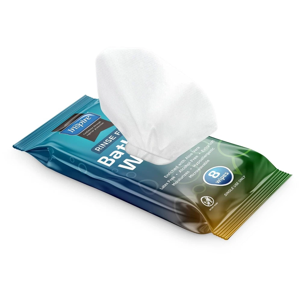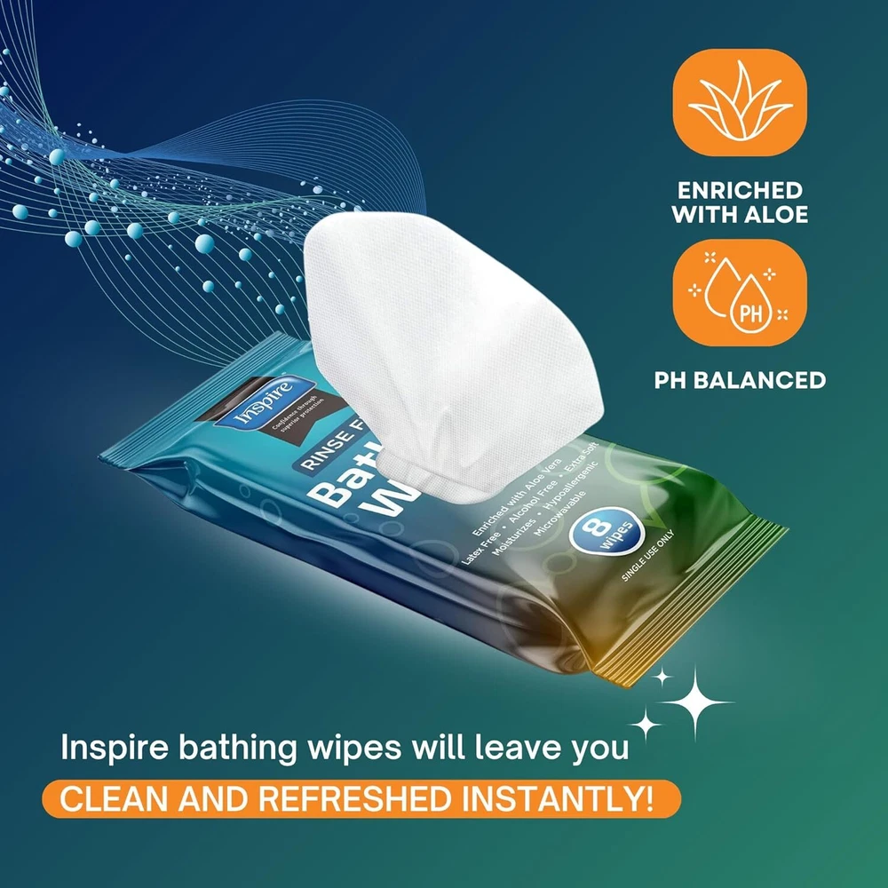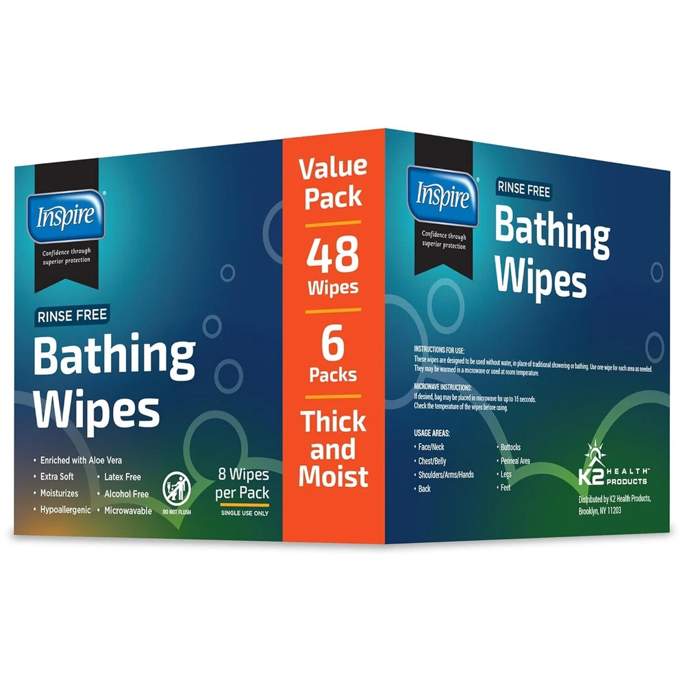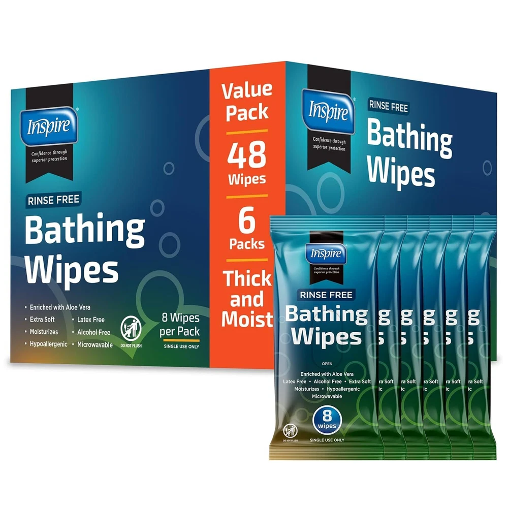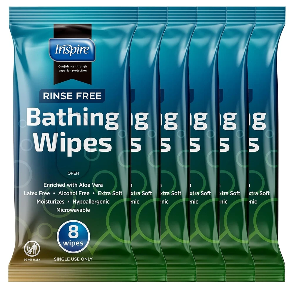 Inspire Rinse Free Body Wash Wipes | Bathing Wipes, Shower Wipes | Extra Large Adult Wipes With Aloe | Cleansing Adult Wipes | Body Wipes For Women And Men | Disposable Washcloths For Adults Bathing Product Details Package Dimensions : 8.7 x 4.92 x 4.69 inches; 2.43 Pounds Item model number : INSNRBW8-6 Manufacturer : Inspire Brand: Inspire Skin Type: All Material Feature: Rinse Free Unit Count: 80.00 Count Number of Items: 1 THICK AND STRONG: Cleansing wipe. Strong and durable for bathing whenever a bath or shower is not practical. Wipes for the elderly, gym wipes, camping, post surgery or just to freshen up. Body Wipes - Adult wipes extra large. ENRICHED WITH ALOE, PH BALANCED: Moisturizes and cleanses all skin types. Soft and gentle yet effective. Latex free wet wipes for adults. USE WARM OR ROOM TEMEPERATURE: Washcloths can be microwaved for warm bathing or may be used at room temperature. Bath wipes for adults no rinse, just wipe skin to cleanse.. Disposable washcloths for adults. 6 PACKS, 8 WIPES. PER PACK: Bulk pack includes 6 packages of 8 wipes per pack, 48 wipes total. Do Not Flush. POST SURGERY, CAMPING, AT THE GYM: Any time a shower is not an option, these washcloths will be greatly appreciated. Ultra thick with plenty of cleansing power these wipes will leave you clean and refreshed.