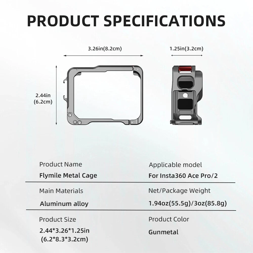 Product Description For Insta360 Ace Pro 2 Metal Protective Bezel Sports Camera Protection Accessory Feature: 1.The Frame Case is made of aluminum alloy with light weight,The characteristics of high hardness can provide comprehensive protection. 2.Easy to disassemble with just one press. 3.Cold shoe Expansion Interface,Expansion interface for adding lights, microphones, and more creative accessories. 4.The two sides of the aluminum alloy frame box are filled with soft foam, which can hold the camera firmly after installation. 5.The metal cage design accommodates two finger positions, providing ample clearance for the screen to open and close. Description: Material: Aluminum Alloy Applicable models: For Insta360 Ace Pro/2 Color:Gunmetal Net weight:1.94oz(55.5g) Package weight:3oz(85.8g) Product size:2.44*3.26*1.25in(6.2*8.3*3.2cm) Package size:3.5*1.92*4.05in(8.9*10.3*4.9cm) Pac king list : Metal Cage * 1 About Us Payment Shipping Terms Contact Us Welcome to our store! We are a professional worldwide wholesale company, with our own factory located in China. We supply many products including video game, health & beauty, phone accessories, computers accessories, camera & camcorder,car accessories, Clothing accessories, games, toys & hobbies, jewelry, antique & craftwork. High product quality,reasonable prices, excellent customer service and a reliable credit standing is our tenet. We accept PayPal only. Payment must be received in 7 business days of auction closing. Please leave note for your special request (e.g. Colors or Size) in PayPal when you pay the order. Any special request cannot be accepted after 24 hours of payment, because most of orders will be processed instantly and same day dispatched. Item will be shipped out within 48 hours upon receipt of your payment. The shipping time details, please read the shipping and delivery together with the price. We ship to your PayPal address. Please make sure your PayPal address is correct before you pay. Considering the cost of business and easy shipping, usually the item is packed in retail packaging. Country Shipping Time Working Days + Saturday + Sunday 5-7 8-15 16-20 21-25 26-30 >31 United States Rate(item arrived) 5.1% 50.1% 29.6% 10.5% 4.7% Refund United Kingdom Rate(item arrived) 9.9% 63.2% 19.1% 3.4% 4.4% Refund Australia Rate(item arrived) 21.4% 50.0% 14.3% 7.2% 7.1% Refund France Rate(item arrived) 10.5% 28.6% 43.8% 10.1% 7.0% Refund Germany Rate(item arrived) 11.1% 22.2% 30.3% 20.9% 15.5% Refund Canada Rate(item arrived) 0.0% 47.1% 31.4% 17.6% 3.9% Refund Spain Rate(item arrived) 3.7% 24.1% 48.2% 13.8% 10.2% Refund If this item is defective upon receipt, customer has up to 14 days from date of receipt for exchange of a new one.But buyers should be pay for the shipping charge for returning. We care about our valued customers, and are always willing to work things out. If you have any problems, please e-mail us immediately. If you have any questions, please feel free to send eBay message to us, our service specialists 24 Hours a Day, 7 Days a Week (maybe there is some delay in weekends). Our aim is to provide Top Level Customer Service, normally so we will try our best to solve any problem. Please DON'T leave negative or neutral feedback if you haven't received item in 30 days, because we have mentioned the shipping time repeatedly. About Us Welcome to our store! We are a professional worldwide wholesale company, with our own factory located in China. We supply many products including video game, health & beauty, phone accessories, computers accessories, camera & camcorder,car accessories, Clothing accessories, games, toys & hobbies, jewelry, antique & craftwork. High product quality,reasonable prices, excellent customer service and a reliable credit standing is our tenet. Payment We accept PayPal only. Payment must be received in 7 business days of auction closing. Please leave note for your special request (e.g. Colors or Size) in PayPal when you pay the order. Any special request cannot be accepted after 24 hours of payment, because most of orders will be processed instantly and same day dispatched. Shipping Item will be shipped out within 48 hours upon receipt of your payment. The shipping time details, please read the shipping and delivery together with the price. We ship to your PayPal address. Please make sure your PayPal address is correct before you pay. Considering the cost of business and easy shipping, usually the item is packed in retail packaging. Country Shipping Time Working Days + Saturday + Sunday 5-7 8-15 16-20 21-25 26-30 >31 United States Rate(item arrived) 5.1% 50.1% 29.6% 10.5% 4.7% Refund United Kingdom Rate(item arrived) 9.9% 63.2% 19.1% 3.4% 4.4% Refund Australia Rate(item arrived) 21.4% 50.0% 14.3% 7.2% 7.1% Refund France Rate(item arrived) 10.5% 28.6% 43.8% 10.1% 7.0% Refund Germany Rate(item arrived) 11.1% 22.2% 30.3% 20.9% 15.5% Refund Canada Rate(item arrived) 0.0% 47.1% 31.4% 17.6% 3.9% Refund Spain Rate(item arrived) 3.7% 24.1% 48.2% 13.8% 10.2% Refund Terms If this item is defective upon receipt, customer has up to 14 days from date of receipt for exchange of a new one.But buyers should be pay for the shipping charge for returning. We care about our valued customers, and are always willing to work things out. If you have any problems, please e-mail us immediately. Contact Us If you have any questions, please feel free to send eBay message to us, our service specialists 24 Hours a Day, 7 Days a Week (maybe there is some delay in weekends). Our aim is to provide Top Level Customer Service, normally so we will try our best to solve any problem. Please DON'T leave negative or neutral feedback if you haven't received item in 30 days, because we have mentioned the shipping time repeatedly. powered by