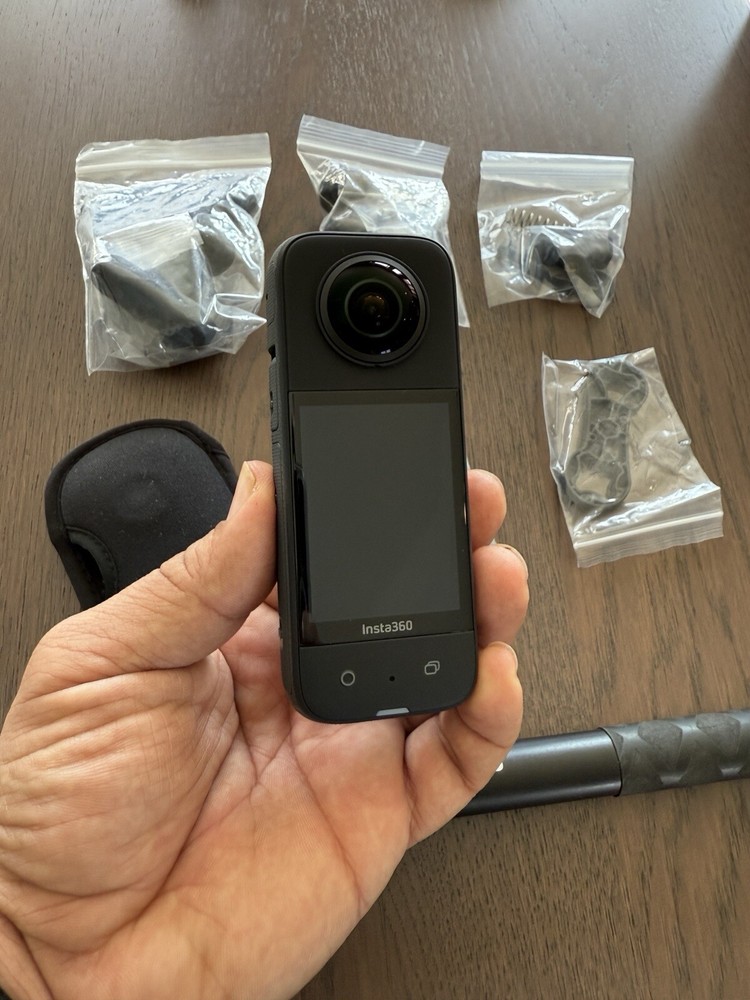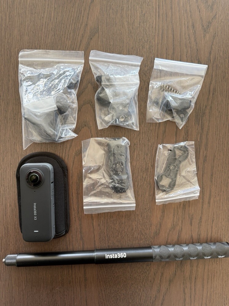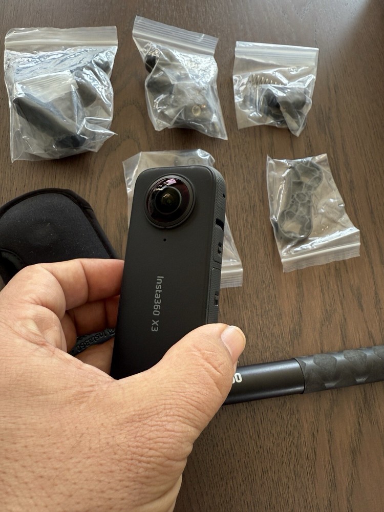 The Insta360 X3 is an action camera with a 3x digital zoom capability, designed for capturing high-quality footage on the go. It comes in a sleek black color and offers features such as waterproofing and built-in Wi-Fi connectivity. The camera includes a motorcycle attachment and an invisible stick for versatile shooting options. With a USB-C connection and a rechargeable Lithium-Ion battery, this camera is perfect for capturing dynamic moments in various environments. Made in China, this Insta360 model combines portability and advanced features for capturing immersive footage. No scratches on lens or screen , never used motorcycle parts , invisible stick has small dent .