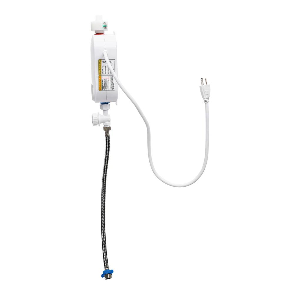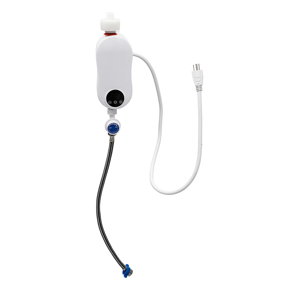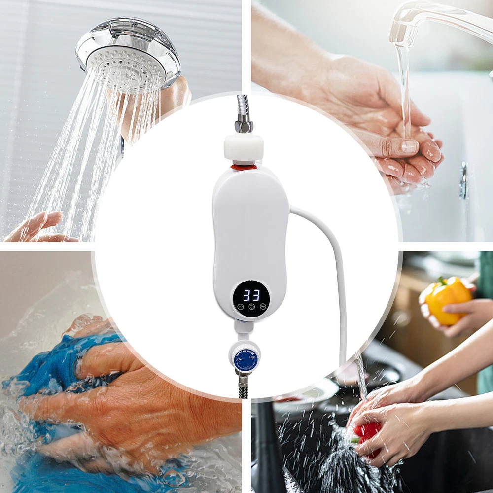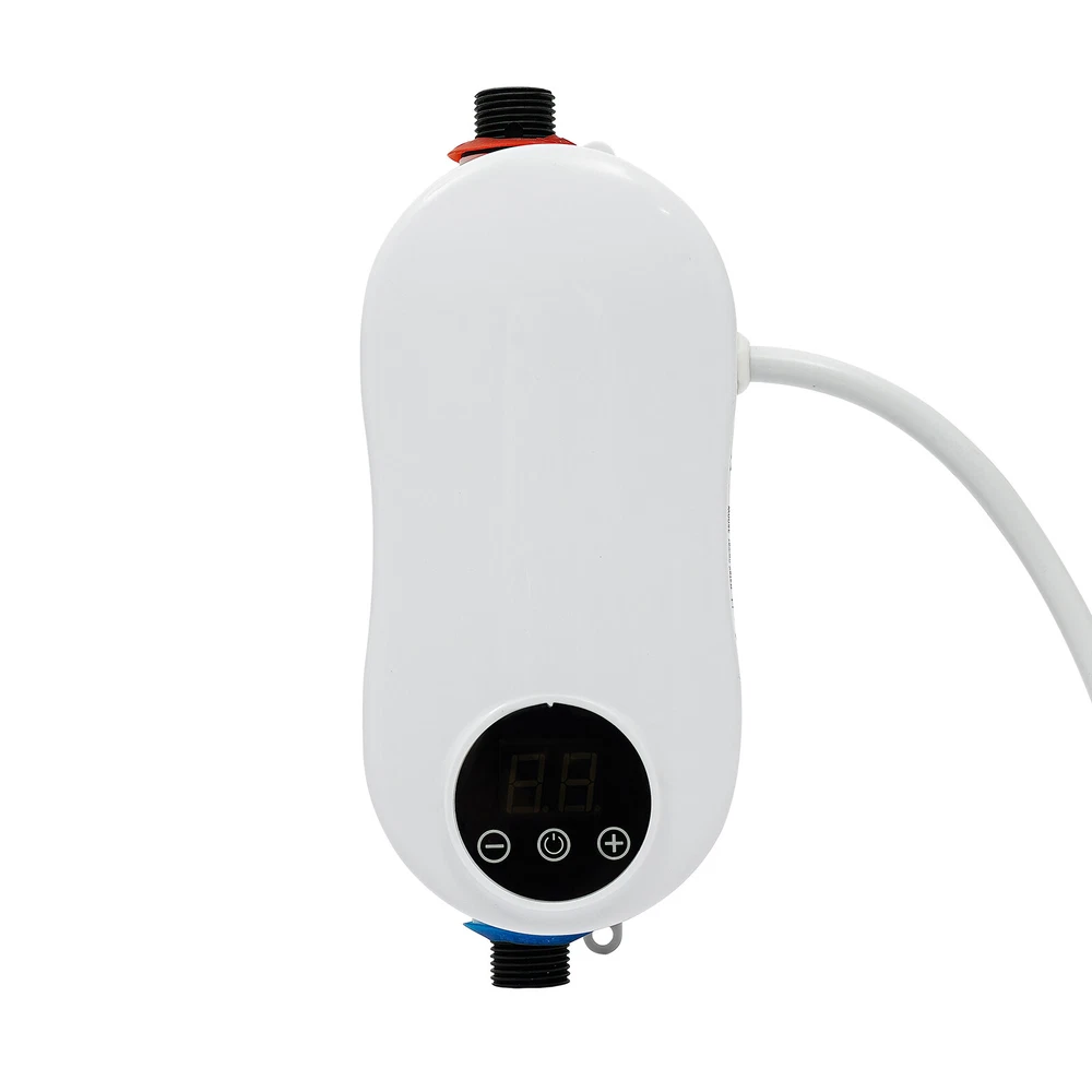Specifications Color: White Material: ABS, Stainless Steel Shape: Gourd-shaped Style: Mini, Instant Mounting Type: Wall-mounted, Vertical Usage: Indoor Use Features: With Leakage Protection Water Inlet Mode: Lower Water Inlet Heating Method: Instant, Stainless Steel Heating Tube Power Source: Corded Electric Voltage: 110V Frequency: 50Hz Power: 3500W Rated Pressure: 0MPa Operating Pressure: 0.04-0.4MPa Anti-Electric Shock Type: I Waterproof Grade: IPX4 Wire Requirements: >2.5m² Circuit Breaker Switch: >16A Heating Time: 3s Interface: 1/2"NPT Heating Temperature: 20-55℃/68-131℉ Power Cord Length: 0.9m/2.95ft Water Inlet Hose Length: 50cm/19.68inch Water Heater Size: 19*7.5*7.5 cm/7.48*2.95*2.95 inch Package Size: 27*28*12cm/10.6*11.02*4.7inch Net Weight: 1.35kg Instant Electric Bathroom Hot Water Heater With Shower Head White 110V 3500W Without shower, hose, bracket. Description Our water heater uses a stainless steel heating core with 3500w large power, providing you with instant hot water and allowing for a comfortable washing/shower experience. In addition, it adopts multiple protection designs such as leakage protection, dry-heating protection, and grounding protection, ensuring high safety of water use. The mini body and modern appearance make it a great companion for a sink, faucet, or bathroom. Specifications Color: White Material: ABS, Stainless Steel Shape: Gourd-shaped Style: Mini, Instant Mounting Type: Wall-mounted, Vertical Usage: Indoor Use Features: With Leakage Protection Water Inlet Mode: Lower Water Inlet Heating Method: Instant, Stainless Steel Heating Tube Power Source: Corded Electric Voltage: 110V Frequency: 50Hz Power: 3500W Rated Pressure: 0MPa Operating Pressure: 0.04-0.4MPa Anti-Electric Shock Type: I Waterproof Grade: IPX4 Wire Requirements: >2.5m² Circuit Breaker Switch: >16A Heating Time: 3s Interface: 1/2"NPT Heating Temperature: 20-55℃/68-131℉ Power Cord Length: 0.9m/2.95ft Water Inlet Hose Length: 50cm/19.68inch Water Heater Size: 19*7.5*7.5 cm/7.48*2.95*2.95 inch Package Size: 27*28*12cm/10.6*11.02*4.7inch Net Weight: 1.35kg/2.97 lbs Gross Weight: 1.4kg/3.08 lbs Features Premium Material: The instant water heater uses stainless steel and high-quality ABS materials, making it sturdy, wear-resistant, anti-rust, and long-lasting. A Safe Heater: The various protections such as leakage protection, dry-heating protection, anti-electric wall technology, water-electricity isolation, overvoltage protection, thermostatic anti-scalding protection, over-temperature protection, grounding protection, and IPX4 waterproof rate make it safe to use without any worries. Instant Heating: Using a stainless steel heating tube with 3500w high power, this water heater can deliver warm hot water in about 3 seconds without storing water for preheating, which saves time/energy and prevents sediment/scale accumulation. Temperature Controllable: You can control the water temperature (68-131℉) by adjusting the water flow (large/small water flow--low/high temperature) and pressing the+/- keys on the panel, providing hot water that fits four seasons in a year. LED Display: The digital screen displays the water temperature and power, so you can keep track of them and get the desired temperature easier. Anti-scaling Design: It can filter the sediment, rust, and other large particles in the tap water, restore the tap water to the factory state, reduce energy consumption, and avoid damage to the human body and skin. Low Water Pressure Startup: The advanced temperature sensing technology overcomes the difficulty of using water heaters due to low water pressure, making it suitable for residential buildings with water pressure up to 0.04MPa. Cost-effective: The tankless water heater with 98% thermal efficiency can automatically regulate the power according to the water flow and temperature change, saving energy up to 50%. Only when it is used the water can be heated to the required place, eliminating the waste of unused water in the long water pipeline between the central water heater and each faucet. Mini Appearance: This mini wall-mounted white instant water heater with a unique gourd-shaped design and 4.6*2.8*6.3 inches size plays a decorative role and does not occupy much space. Simple Installation: With the equipped accessories, premade fixing screw holes, English manual, and 1/2" standard interfaces, you can install this heater easily. Details Power Cable: The 2.95ft power cable allows for easy installation in your cupboard or under the sink. Touch Button: The new-generation touch button with electronic control has a longer lifespan and good sealing. It resists wet and water and avoids mechanical failure of buttons. Application It is suitable for kitchens, cupboards, bathrooms, daily washing, RVs, bars, schools, hospitals, communities, hair salons, and so on to wash hands, dishes, clothes, and face. You can also take a shower above 0.04MPa water pressure. Package Included 1* Instant Water Heater 1* Water Inlet Hose 1* Flow Regulating Valve 1* English Instruction Other Accessories for Assembly How to Install Fix it through the premade screw holes at the proper position on the wall. Install the water flow regulating valve at the blue electric water inlet under the water heater. Install an electric partition wall at the red water outlet above the water heater. Connect the water inlet hose to the water flow regulating valve. Connect the water inlet. Turn on the water flow regulating valve to ensure that this product does not leak. Plug in the power. Long press the power button for 3 seconds to turn it on. Notes Please verify this unit is the right size for you before buying. The wire is required to be more than 2.5m² and the circuit breaker switch is greater than 16 A. The start-up water pressure of this machine is about 0.04Mpa. If the water flow is significantly too low, it is not recommended to buy, except for users who have added a water booster device. The water temperature 