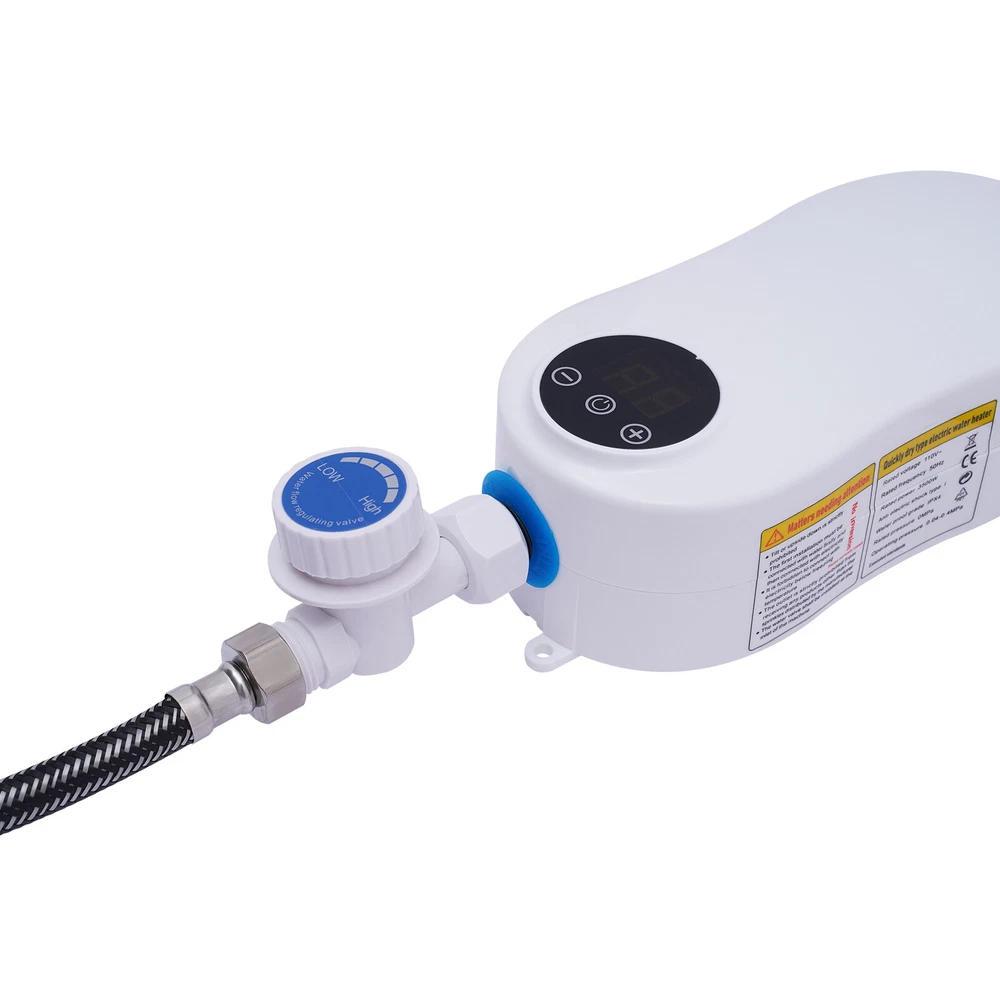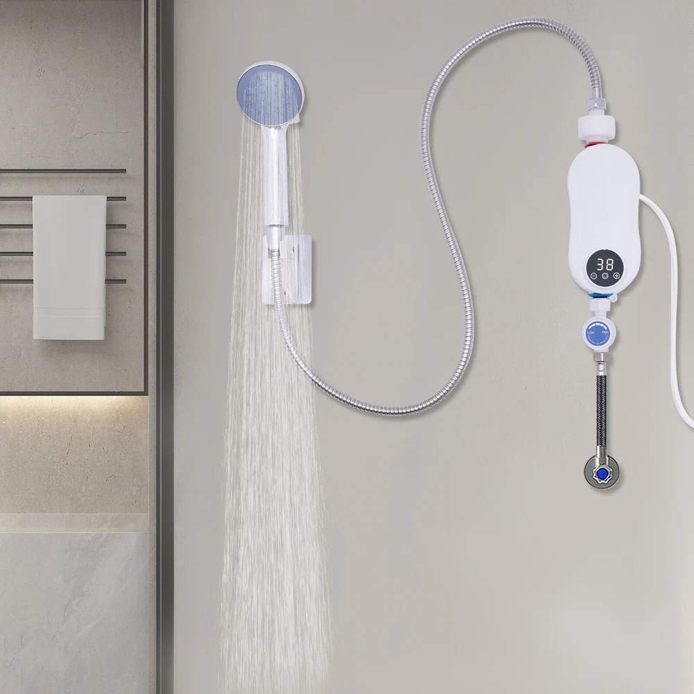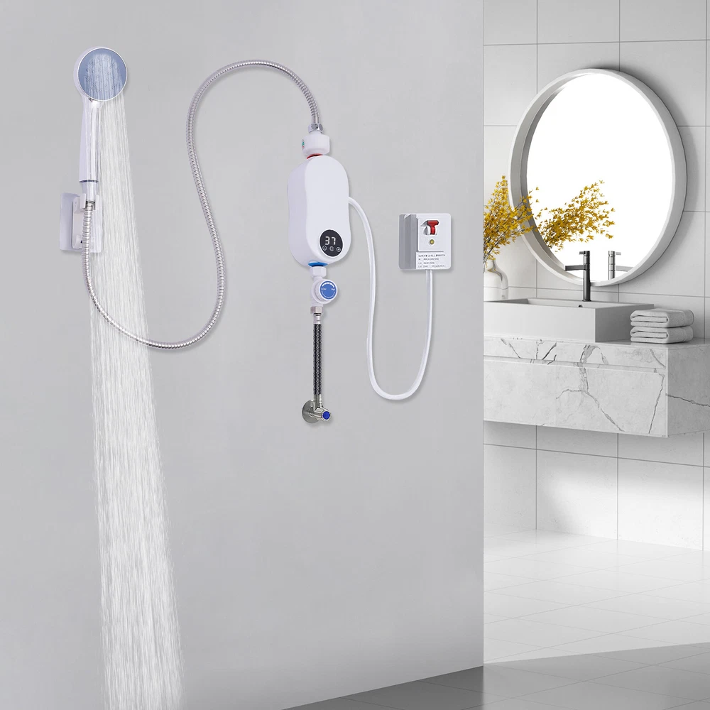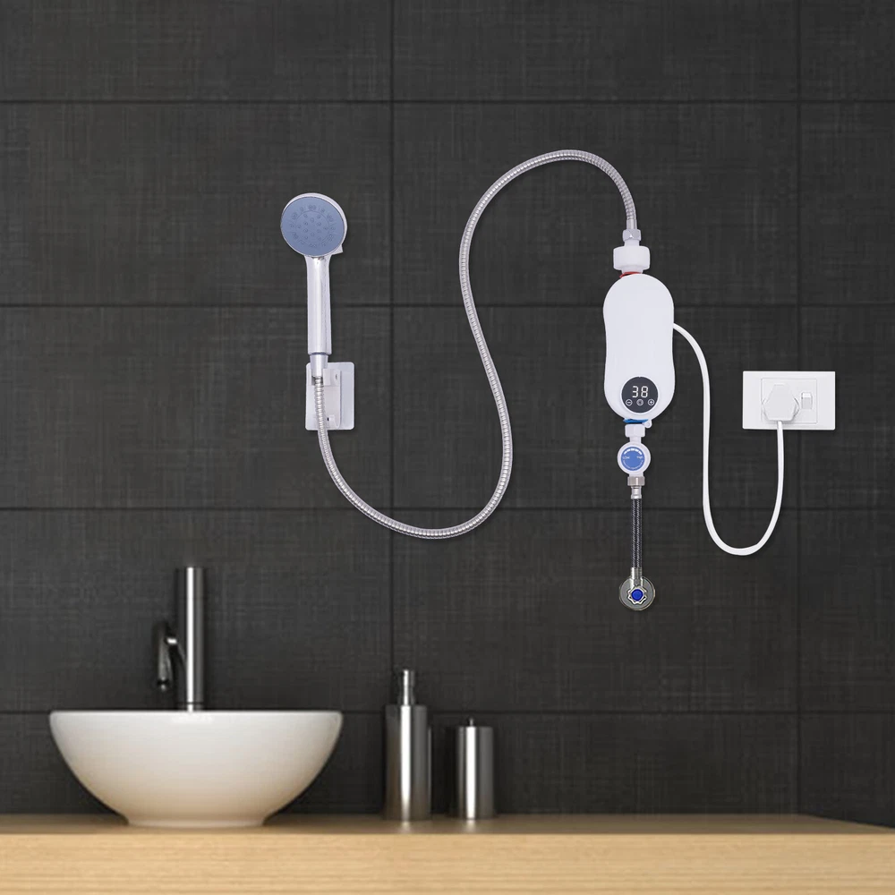 Specifications Color: White Material: ABS, Stainless Steel Shape: Gourd-shaped Style: Mini, Instant Mounting Type: Wall-mounted, Vertical Usage: Indoor Use Features: With Leakage Protection Water Inlet Mode: Lower Water Inlet Heating Method: Instant, Stainless Steel Heating Tube Power Source: Corded Electric Voltage: 110V Frequency: 50Hz Power: 3500W Rated Pressure: 0MPa Operating Pressure: 0.04-0.4MPa Anti-Electric Shock Type: I Waterproof Grade: IPX4 Wire Requirements: >2.5m² Circuit Breaker Switch: >16A Heating Time: 3s Interface: 1/2"NPT Heating Temperature: 20-55℃/68-131℉ Power Cord Length: 0.9m/2.95ft Water Inlet Hose Length: 50cm/19.68inch Water Heater Size: 19*7.5*7.5 cm/7.48*2.95*2.95 inch Package Size: 27*28*12cm/10.6*11.02*4.7inch Net Weight: 1.35kg Instant Electric Bathroom Hot Water Heater With Shower Head White 110V 3500W Instant Electric Bathroom Hot Water Heater With Shower Head White 110V 3500W Without shower, hose, bracket. Description Our water heater uses a stainless steel heating core with 3500w large power, providing you with instant hot water and allowing for a comfortable washing/shower experience. In addition, it adopts multiple protection designs such as leakage protection, dry-heating protection, and grounding protection, ensuring high safety of water use. The mini body and modern appearance make it a great companion for a sink, faucet, or bathroom. Specifications Color: White Material: ABS, Stainless Steel Shape: Gourd-shaped Style: Mini, Instant Mounting Type: Wall-mounted, Vertical Usage: Indoor Use Features: With Leakage Protection Water Inlet Mode: Lower Water Inlet Heating Method: Instant, Stainless Steel Heating Tube Power Source: Corded Electric Voltage: 110V Frequency: 50Hz Power: 3500W Rated Pressure: 0MPa Operating Pressure: 0.04-0.4MPa Anti-Electric Shock Type: I Waterproof Grade: IPX4 Wire Requirements: >2.5m² Circuit Breaker Switch: >16A Heating Time: 3s Interface: 1/2"NPT Heating Temperature: 20-55℃/68-131℉ Power Cord Length: 0.9m/2.95ft Shower Hose Length: 1.5m/4.9ft Water Inlet Hose Length: 50cm/19.68inch Water Heater Size: 19*7.5*7.5 cm/7.48*2.95*2.95 inch Package Size: 27*28*12cm/10.6*11.02*4.7inch Net Weight: 1.35kg/2.97 lbs Gross Weight: 1.4kg/3.08 lbs Features Premium Material: The instant water heater uses stainless steel and high-quality ABS materials, making it sturdy, wear-resistant, anti-rust, and long-lasting. A Safe Heater: The various protections such as leakage protection, dry-heating protection, anti-electric wall technology, water-electricity isolation, overvoltage protection, thermostatic anti-scalding protection, over-temperature protection, grounding protection, and IPX4 waterproof rate make it safe to use without any worries. Instant Heating: Using a stainless steel heating tube with 3500w high power, this water heater can deliver warm hot water in about 3 seconds without storing water for preheating, which saves time/energy and prevents sediment/scale accumulation. Temperature Controllable: You can control the water temperature (68-131℉) by adjusting the water flow (large/small water flow--low/high temperature) and pressing the+/- keys on the panel, providing hot water that fits four seasons in a year. LED Display: The digital screen displays the water temperature and power, so you can keep track of them and get the desired temperature easier. Anti-scaling Design: It can filter the sediment, rust, and other large particles in the tap water, restore the tap water to the factory state, reduce energy consumption, and avoid damage to the human body and skin. Low Water Pressure Startup: The advanced temperature sensing technology overcomes the difficulty of using water heaters due to low water pressure, making it suitable for residential buildings with water pressure up to 0.04MPa. Cost-effective: The tankless water heater with 98% thermal efficiency can automatically regulate the power according to the water flow and temperature change, saving energy up to 50%. Only when it is used the water can be heated to the required place, eliminating the waste of unused water in the long water pipeline between the central water heater and each faucet. Mini Appearance: This mini wall-mounted white instant water heater with a unique gourd-shaped design and 4.6*2.8*6.3 inches size plays a decorative role and does not occupy much space. Simple Installation: With the equipped accessories, premade fixing screw holes, English manual, and 1/2" standard interfaces, you can install this heater easily. Details Power Cable: The 2.95ft power cable allows for easy installation in your cupboard or under the sink. Stainless Steel Hose: The 4.9ft freely bendable shower hose allows you easily to flush wherever you want and take a shower at your leisure. Hand Spray: The evenly distributed outlet holes of the hand spray provide you with softer and finer water for a better shower experience. Touch Button: The new-generation touch button with electronic control has a longer lifespan and good sealing. It resists wet and water and avoids mechanical failure of buttons. Application It is suitable for kitchens, cupboards, bathrooms, daily washing, RVs, bars, schools, hospitals, communities, hair salons, and so on to wash hands, dishes, clothes, and face. You can also take a shower above 0.04MPa water pressure. Package Included 1* Instant Water Heater 1* Hand Spray 1* Shower Hose 1* Water Inlet Hose 1* Flow Regulating Valve 1* Hand Spray Holder 1* English Instruction Other Accessories for Assembly How to Install Fix it through the premade screw holes at the proper position on the wall. Install the water flow regulating valve at the blue electric water inlet under the water heater. Install an electric partition wall at the red water outlet above the water heater. Connect the water inlet hose to the water flow regulating valve. Connect the water inlet. Connect the shower hose to the electric partition wall. Install the hand spray holder in the proper posit