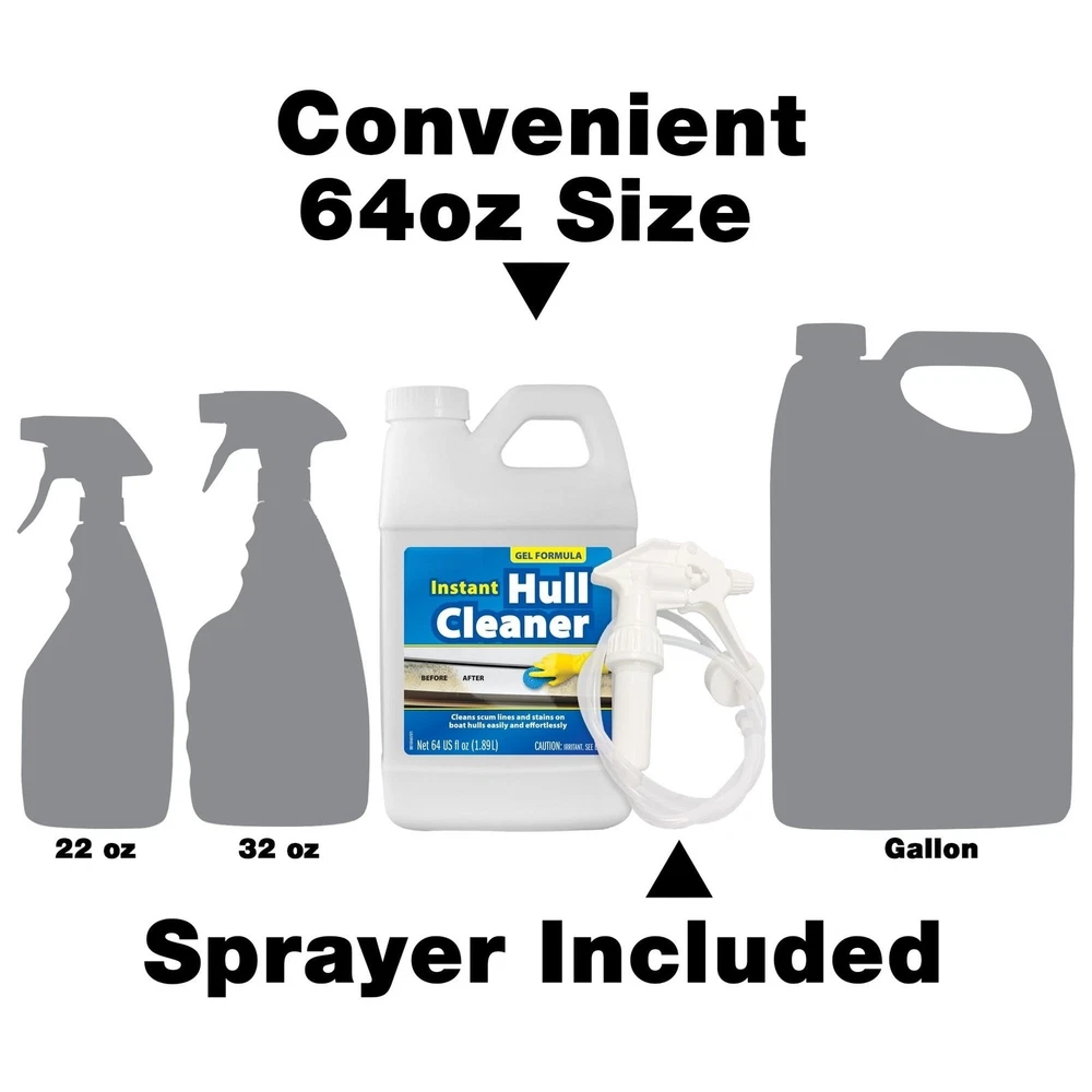 New Gel formula "sticks" where applied for maximum cling time and cleaning power. Transform your boat's appearance with STAR BRITE Instant Hull Cleaner Gel 64 OZ, the ultimate cleaning solution for fiberglass, plastic, and painted surfaces. Say goodbye to stubborn stains, scum lines, and grime that tarnish your boat's hull. Our advanced formula penetrates deep into the surface, lifting away impurities for a cleaner, brighter finish. Ideal for boat hulls, this cleaner is also versatile enough for other marine applications. Spray onto the surface being cleaned. The use of rubber gloves is recommended. Allow to remain on the surface until the stain disappears, then rinse thoroughly with fresh water. Stubborn stains or spots may require a repeated application with longer soak time and gentle scrubbing. For best results, use when the temperature is over 50°F. To shine and protect your newly cleaned hull, apply any of s Marine Polishes. POWERFUL CLEANING ACTION - STAR BRITE Hull Cleaner Gel Spray removes tough stains from boat hulls, fiberglass, plastic and painted surfaces REMOVES STUBBORN STAINS - Specifically formulated to dissolve tough stains, including rust, dried fish blood, and leaf stains MAXIMUM CLING TIME - The new gel formula 'sticks' where applied, ensuring maximum cleaning power and efficiency IDEAL FOR VERTICAL SURFACES - Works perfectly on all fiberglass and painted surfaces, an excellent choice for vertical surfaces SAFER AND EASY TO USE - features a naturally powerful oxalic acid formula, much more user-friendly than harsher hydrochloric or phosphoric acid formulas, a top choice for marine-grade cleaning solutions